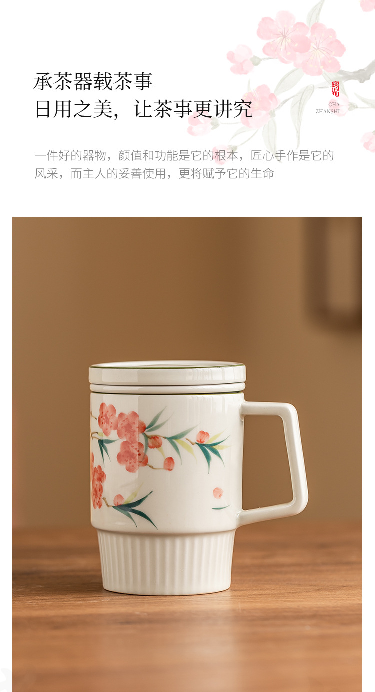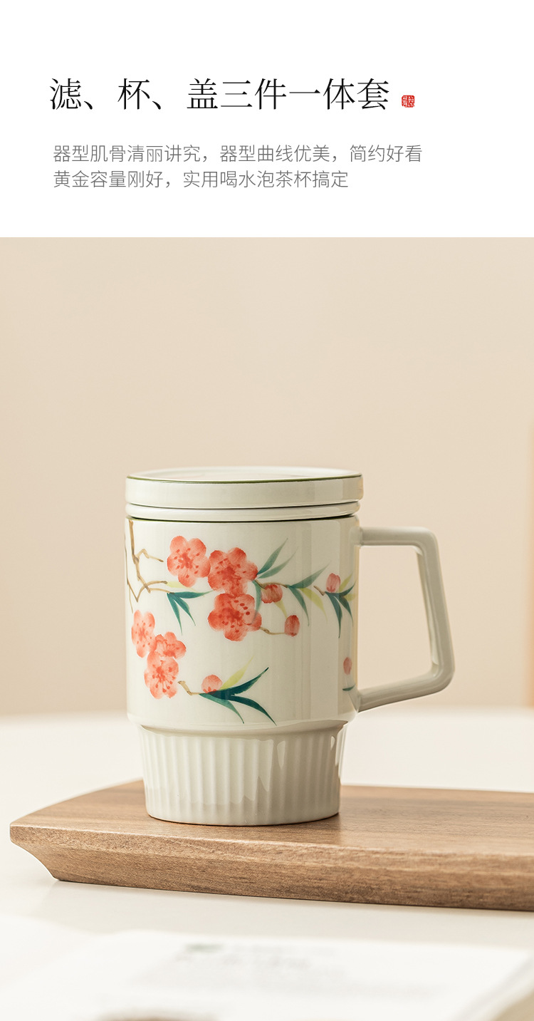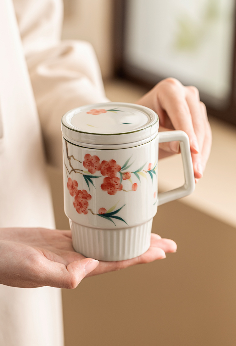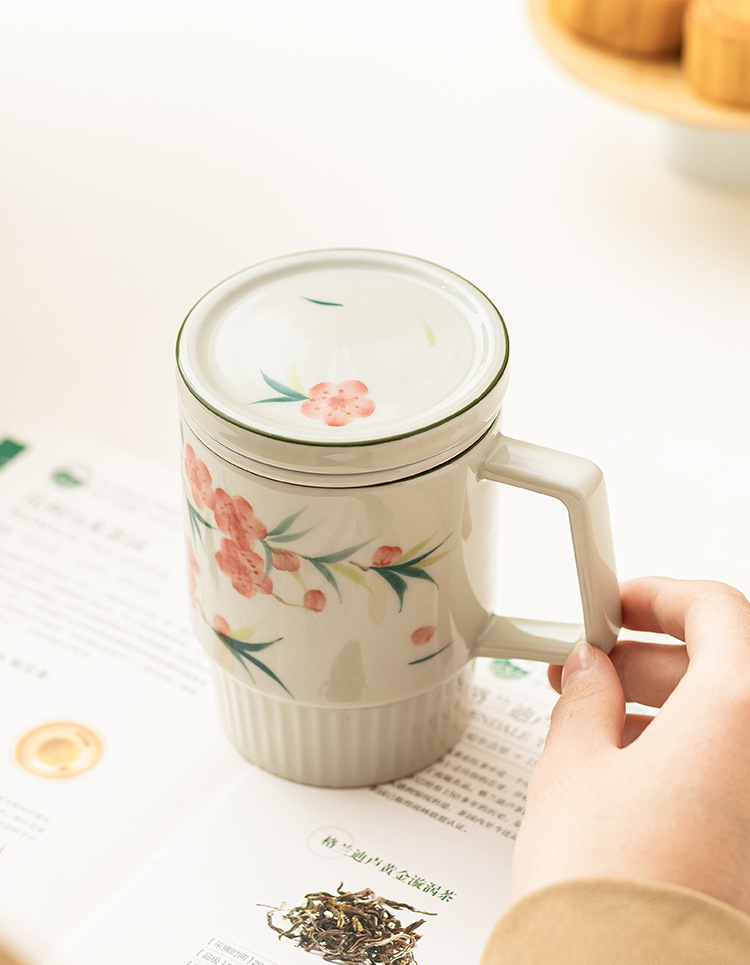 Cốc trà hoa đào vẽ tay cốc văn phòng cốc gốm cốc tách trà cốc pha trà cốc uống nước gia dụng có nắp