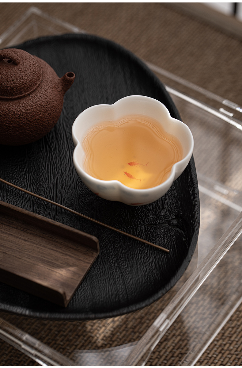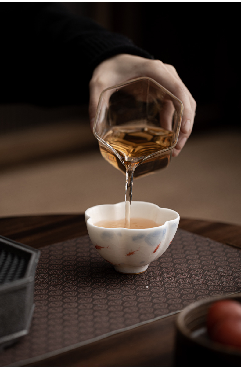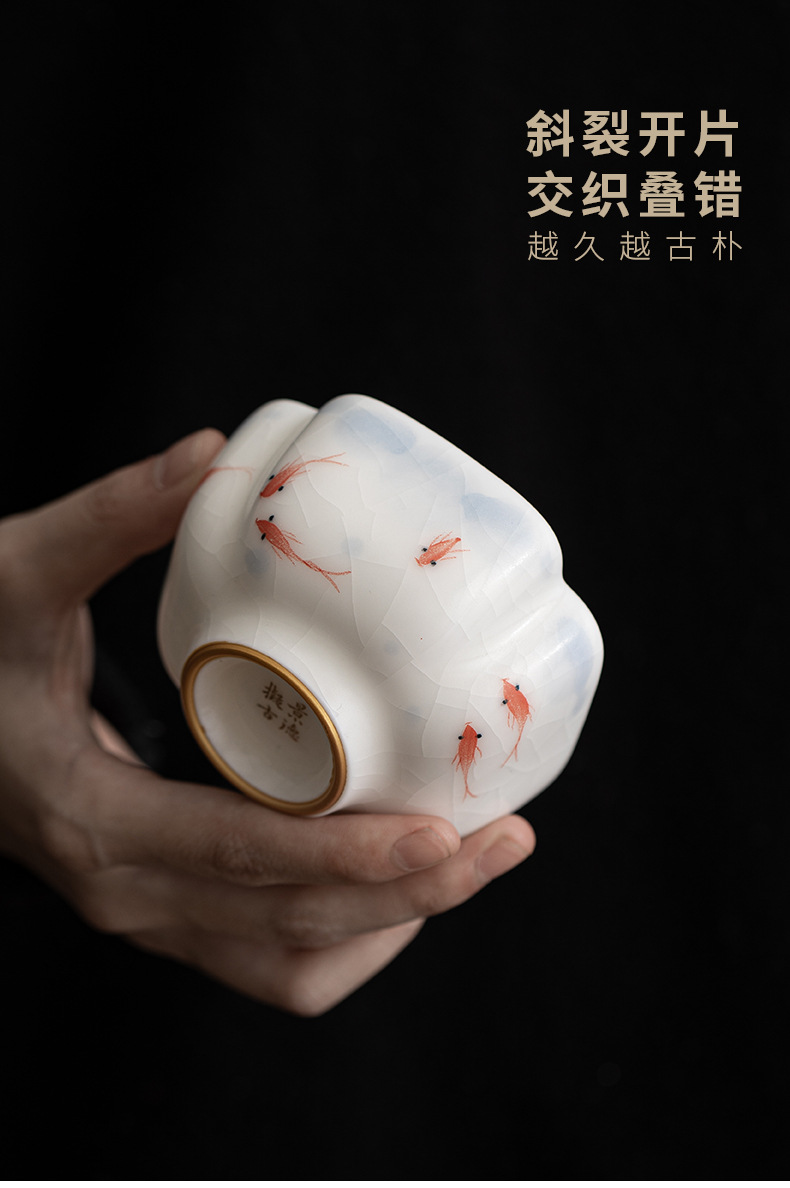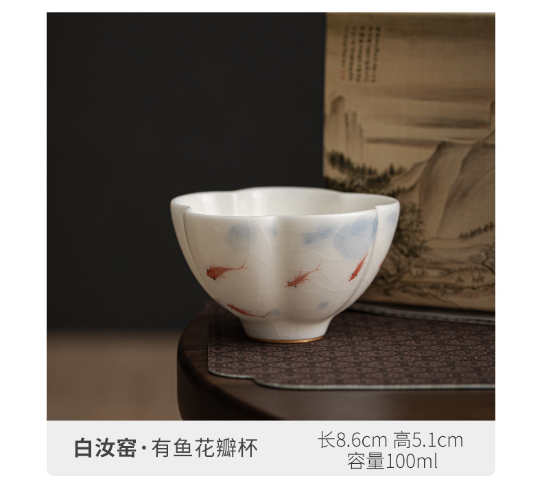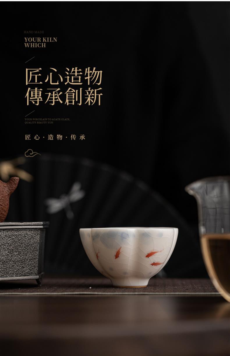 Cốc trà sứ trắng cao cấp, bộ trà kungfu, cốc chủ lò Ru, chén trà đơn, sứ vẽ tay, quà lưu niệm cá
