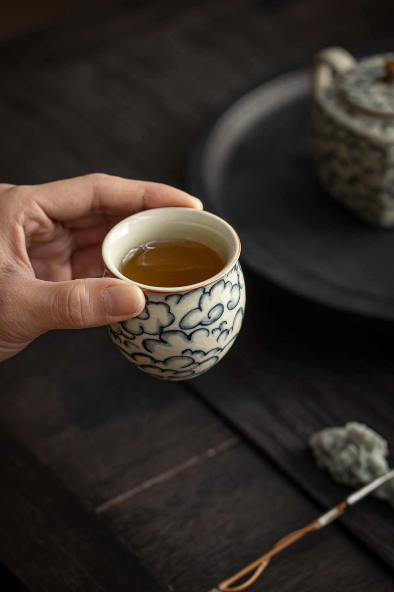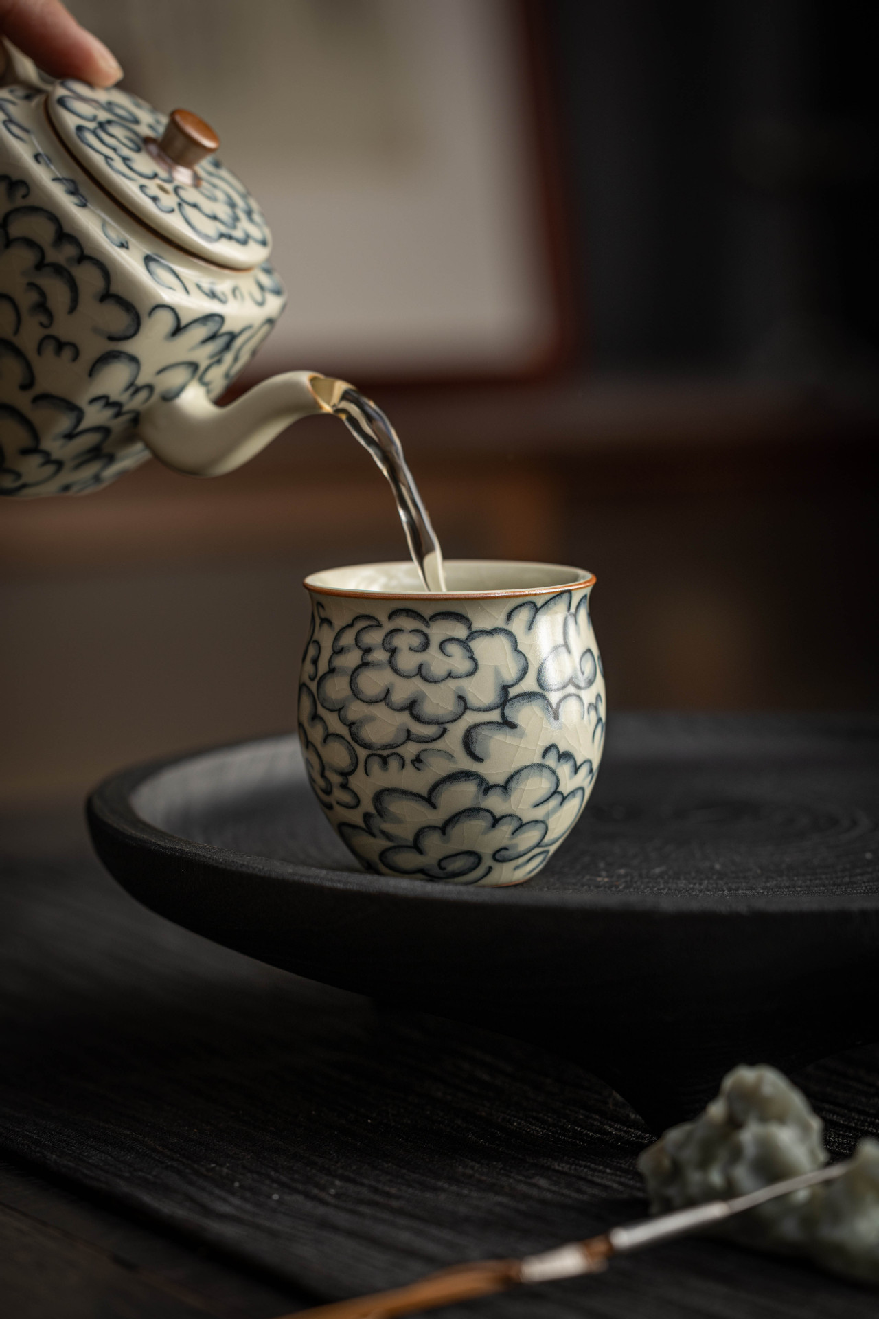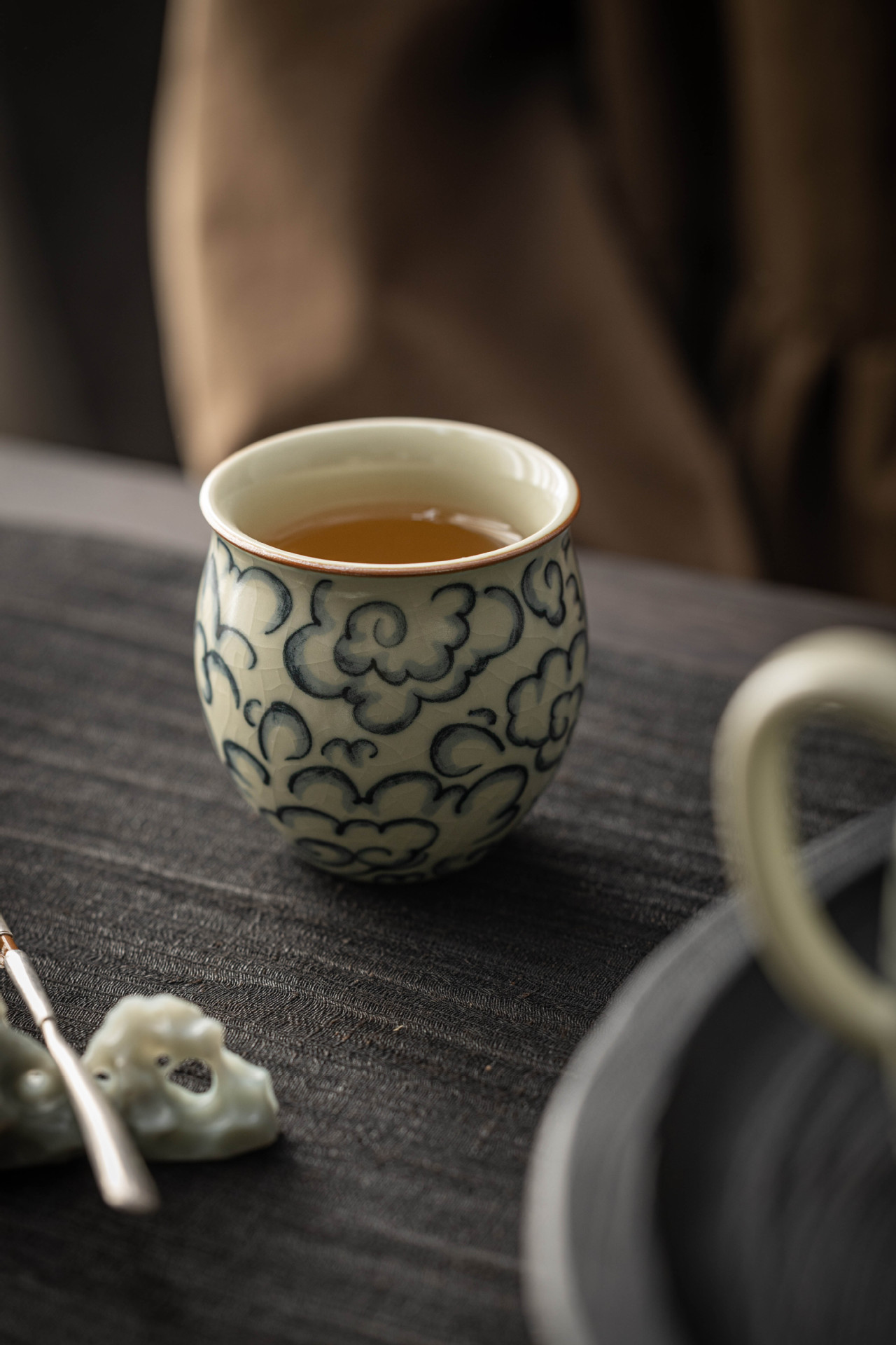 Cốc trà vẽ tay Ruyao, bộ trà Kung Fu, cốc đơn màu xanh và trắng tráng men thủ công Jingdezhen, cốc trà mây tốt lành, cốc trà ngon