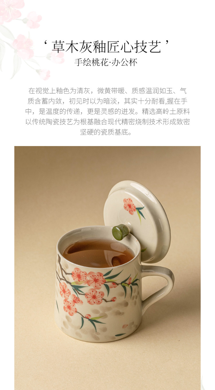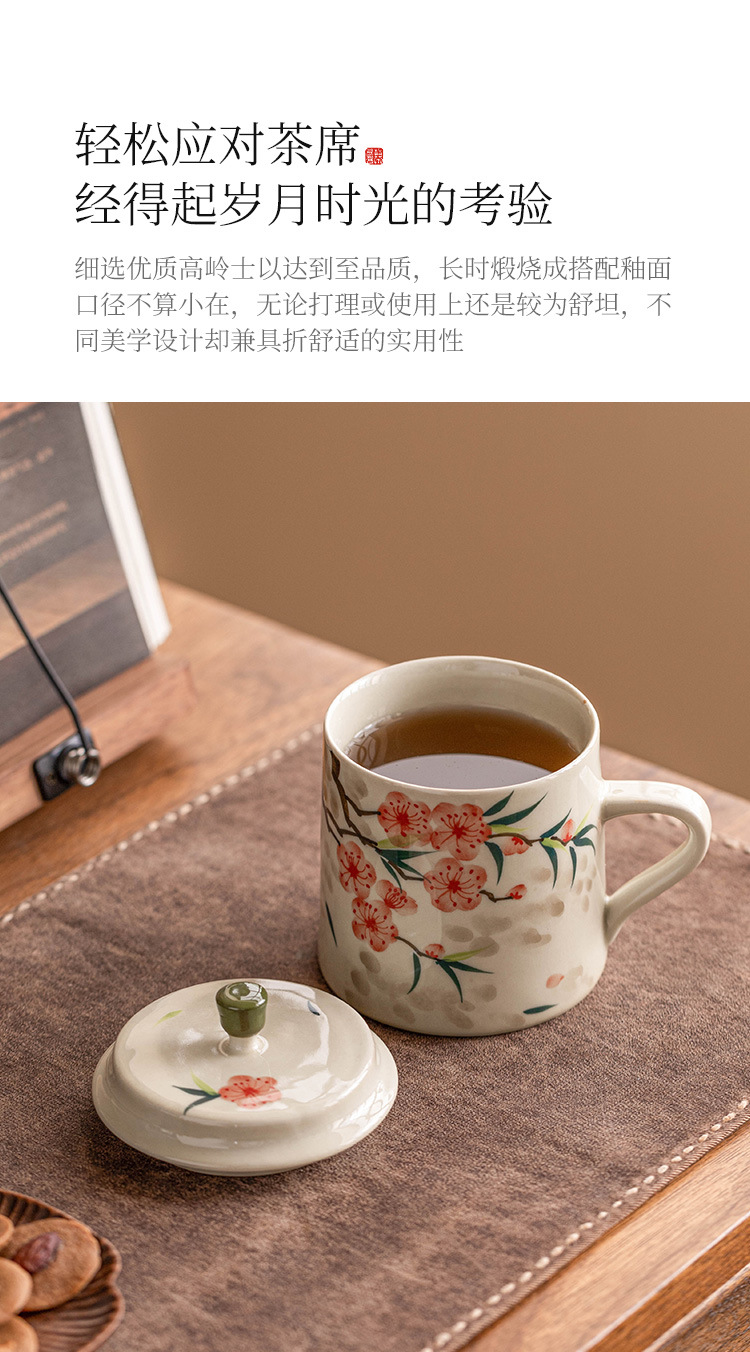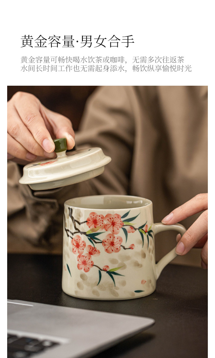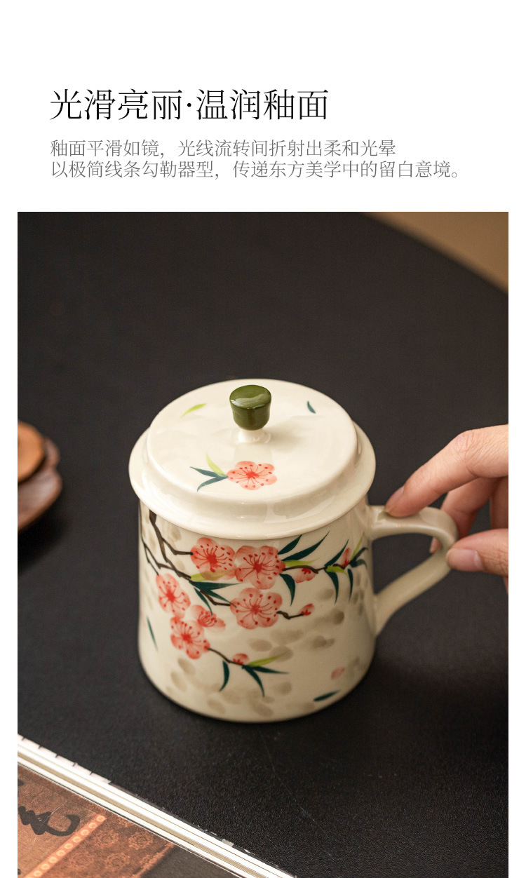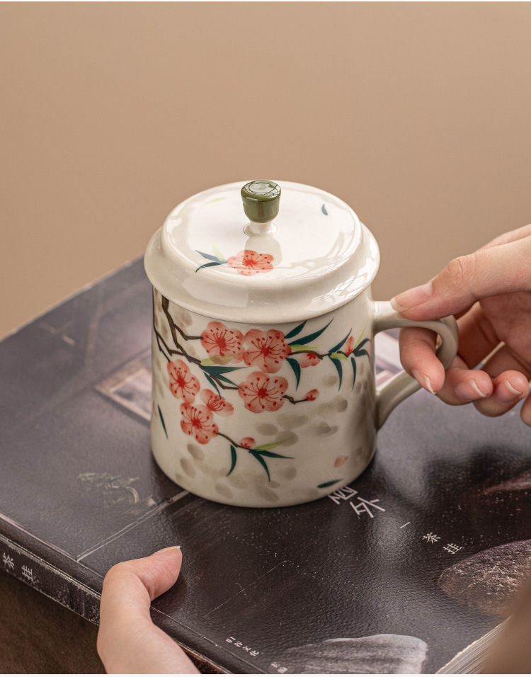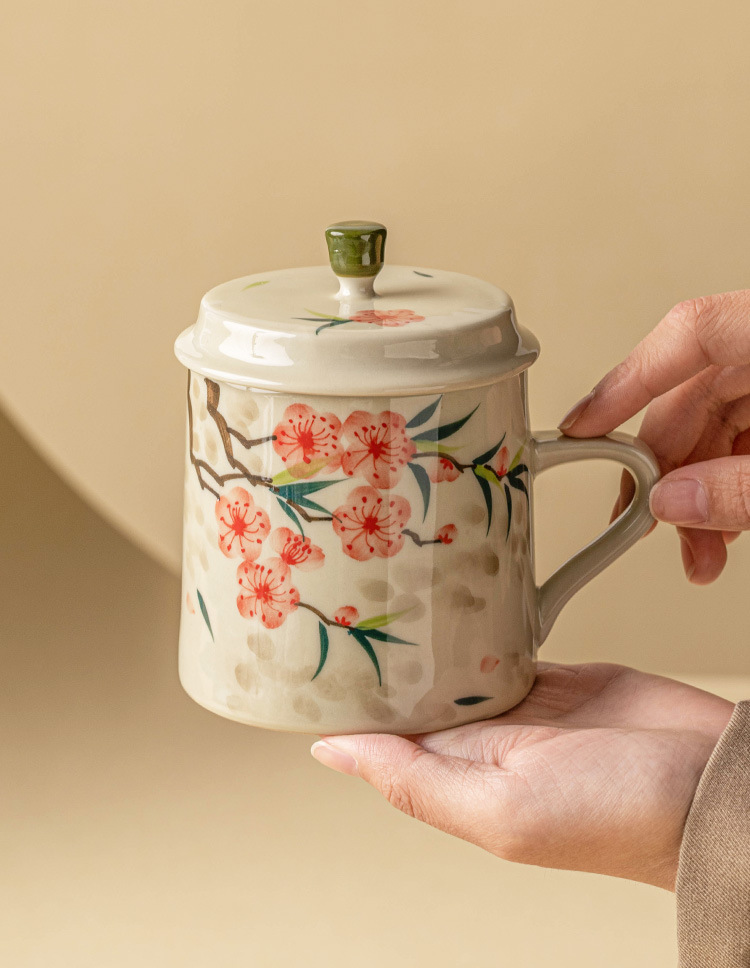 - Cốc uống nước bằng gốm sứ hoa đào vẽ tay, cốc uống nước gia dụng bằng gốm có nắp, cốc trà dung tích lớn dành riêng cho nữ