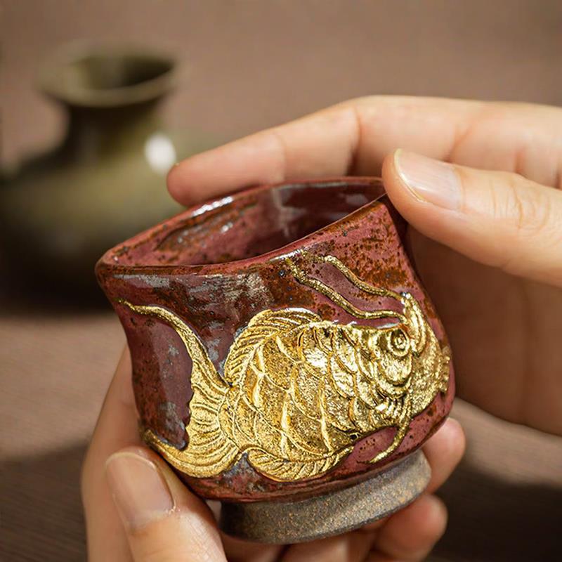 Đá khoáng đốt củi với cá mỗi năm, cốc chủ với tranh vàng, cốc trà kung fu gốm thủ công, cốc trà gốm, cốc đơn