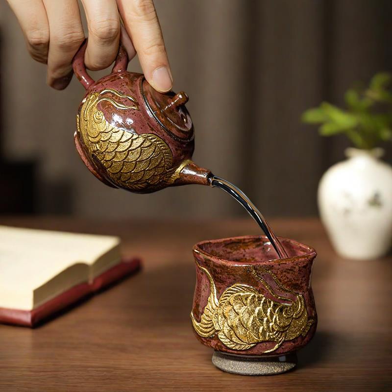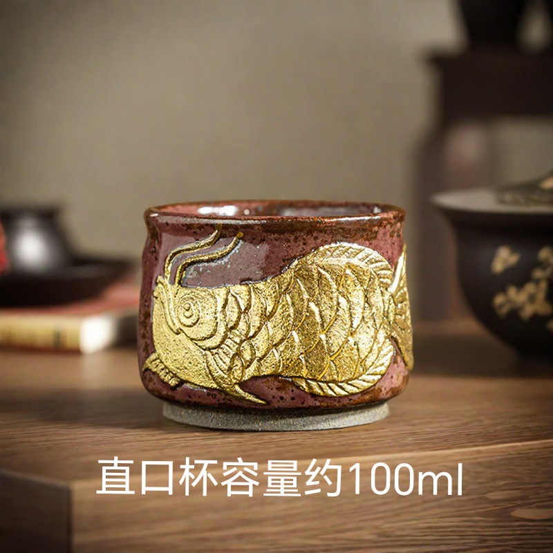 - Đá khoáng đốt củi với cá mỗi năm, cốc chủ với tranh vàng, cốc trà kung fu gốm thủ công, cốc trà gốm, cốc đơn