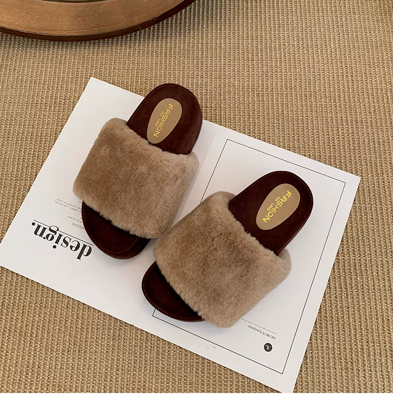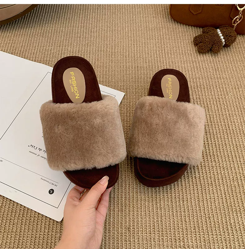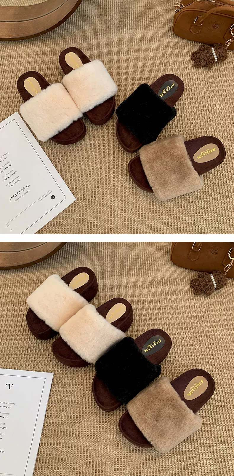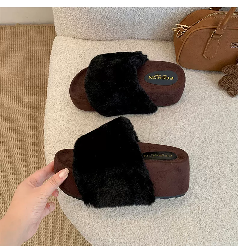 Dép lông dày đế dày chống trơn màu đen dành cho nữ, thích hợp mang đi ngoài trời, kiểu dáng thu đông 2025 mới, dép lười retro tăng chiều cao.