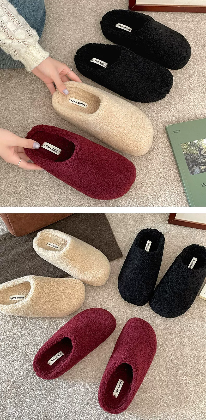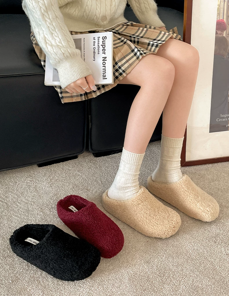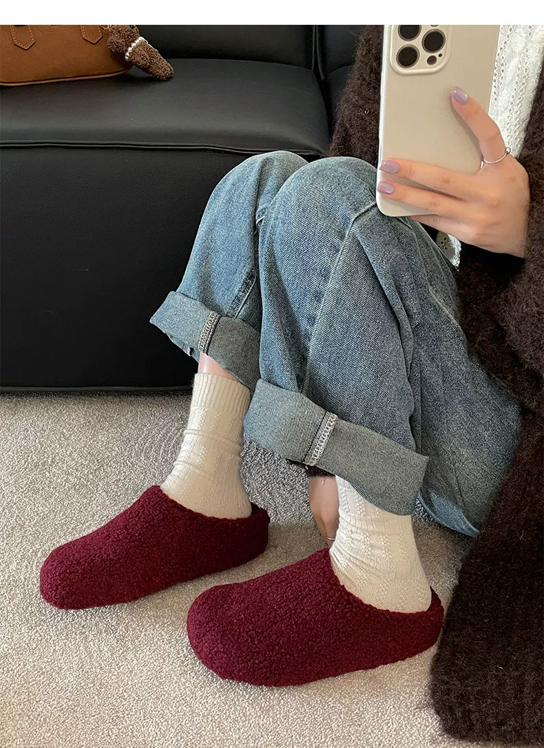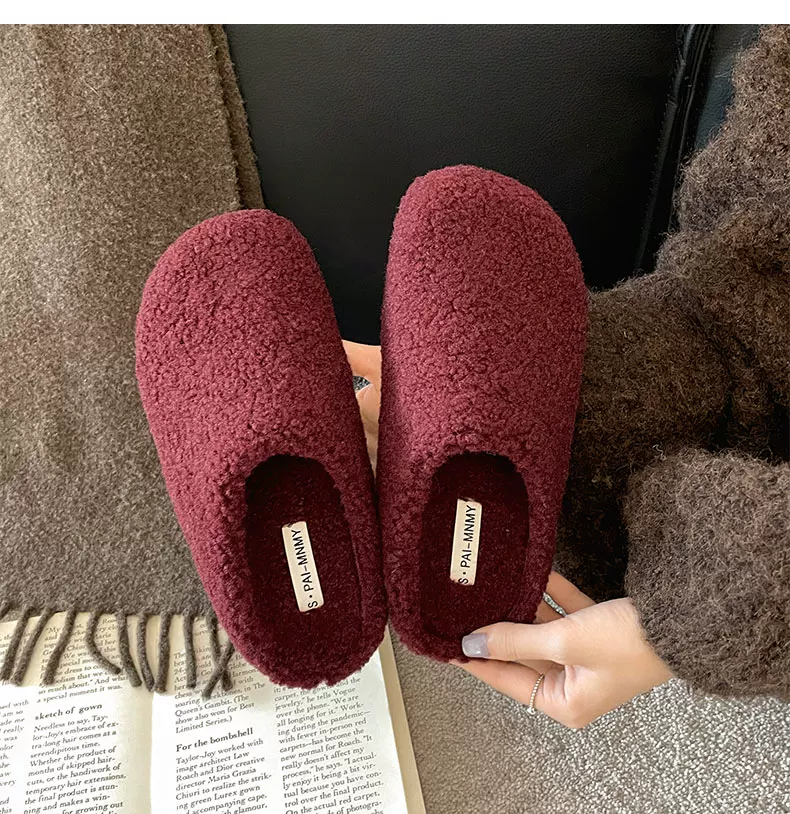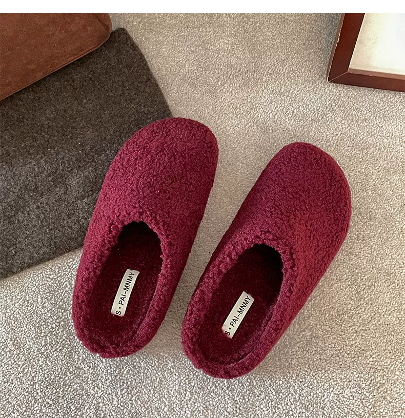 Dép lông dày đế dày chống trơn màu đỏ dành cho nữ, thích hợp để mang ngoài trời, dép bông mũi kín kiểu Birkenstock tăng chiều cao đa năng mùa thu đông 2025.