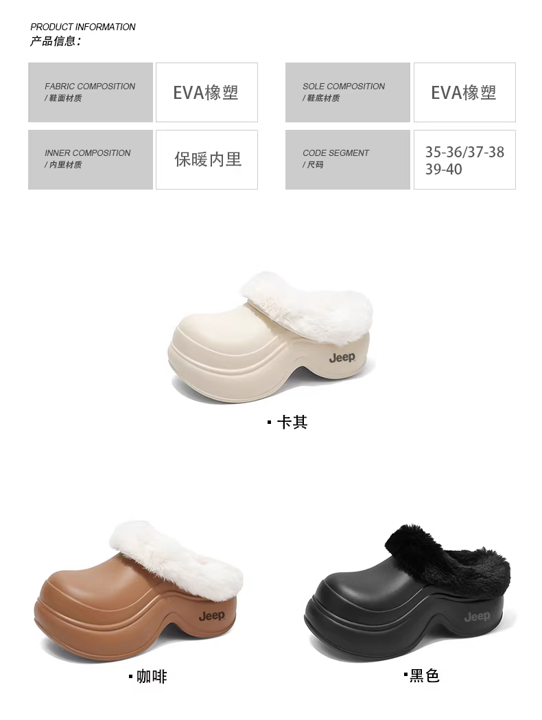 Dép lót lông JEEP dành cho nữ, mặc ngoài trời mùa đông, mẫu mới 2025, dép bông đen dành cho nữ, giày đế dày đi ngoài trời mùa đông.