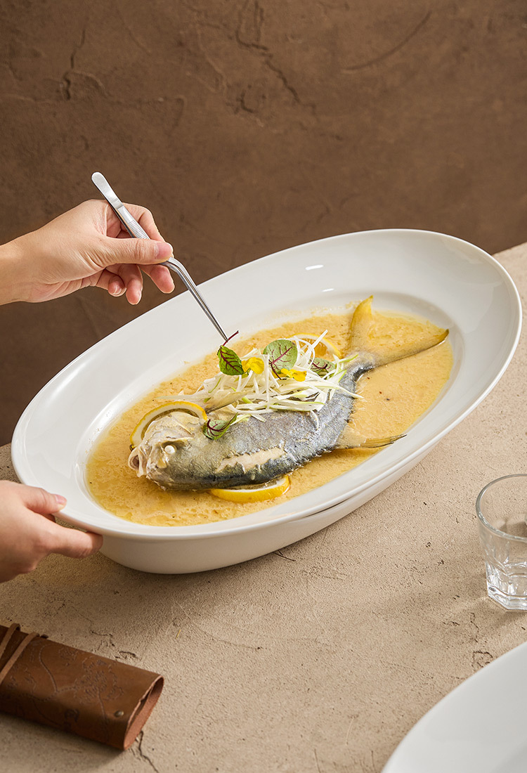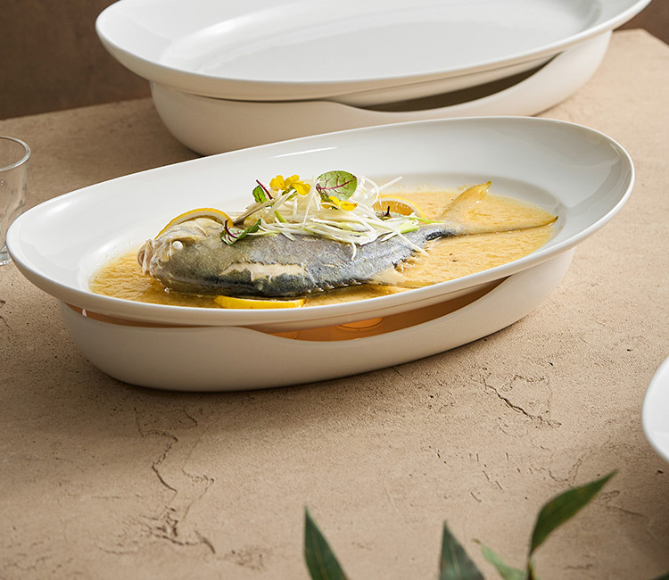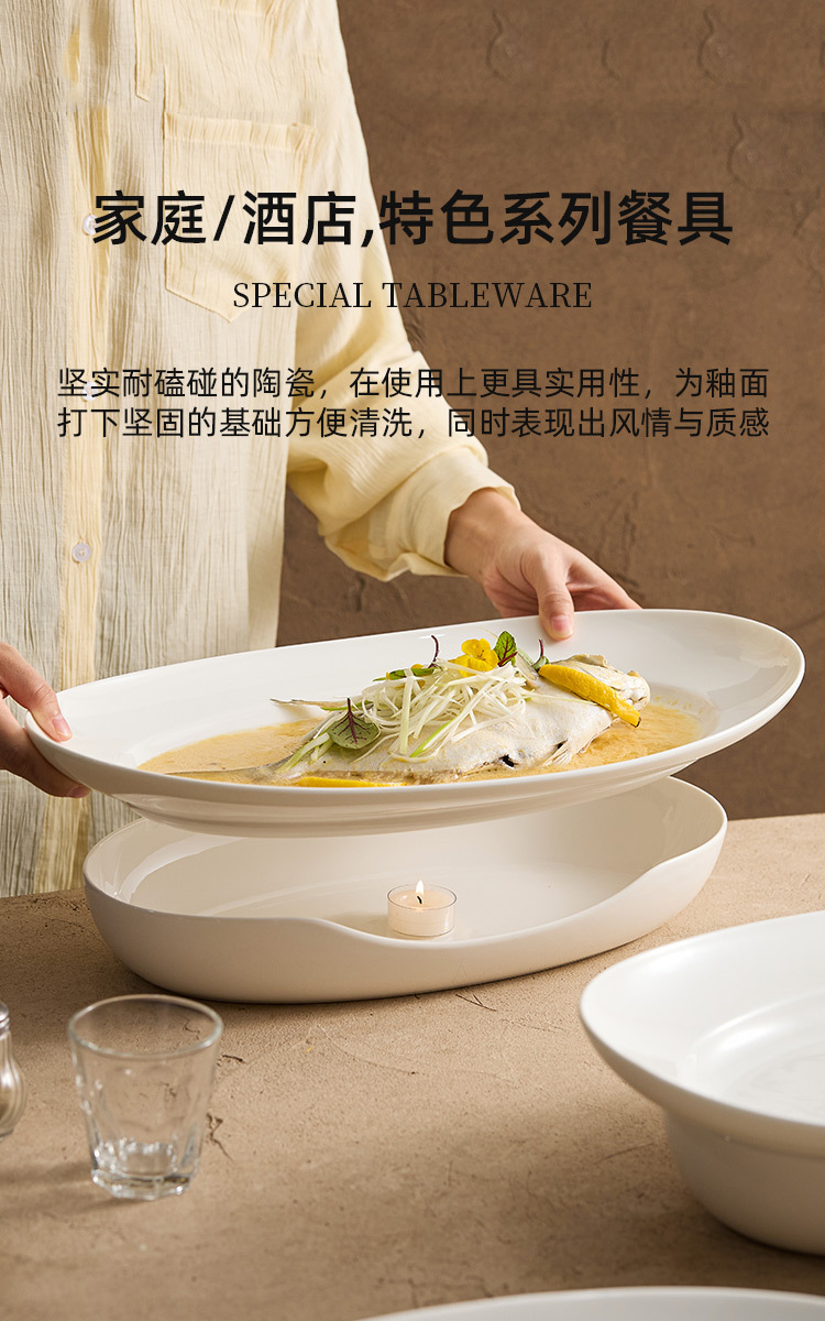 - Đĩa cá hấp cách nhiệt sưởi nến, bộ đồ ăn khách sạn, bếp riêng, đĩa gốm sứ đặc biệt cho nhà hàng, đĩa rau thương mại