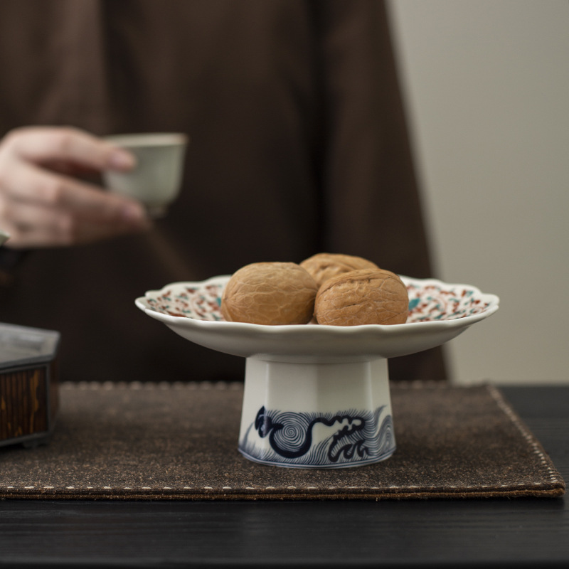 Đĩa trái cây chân cao gốm tráng men kiểu Trung Quốc mới, đĩa ăn nhẹ, đĩa trái cây, bàn trà phòng khách, đĩa ăn nhẹ gia dụng