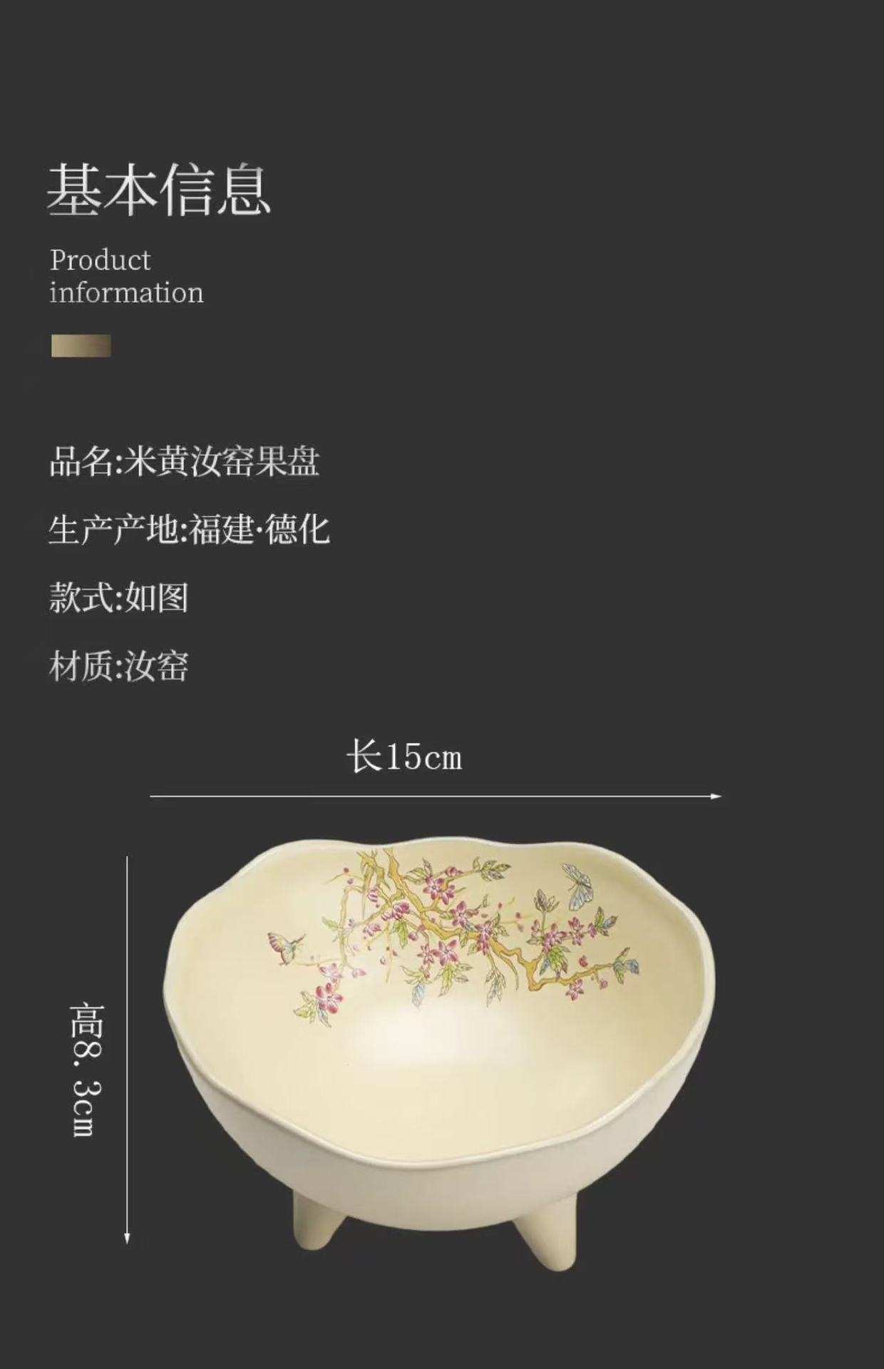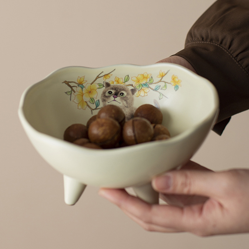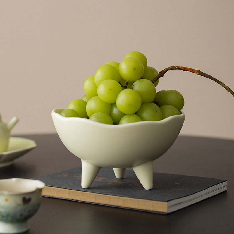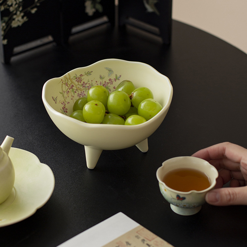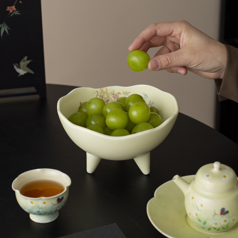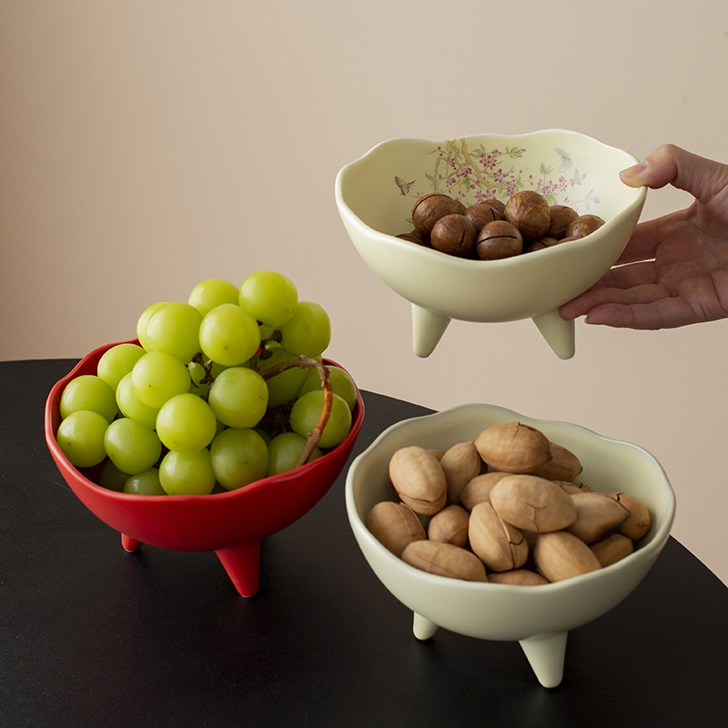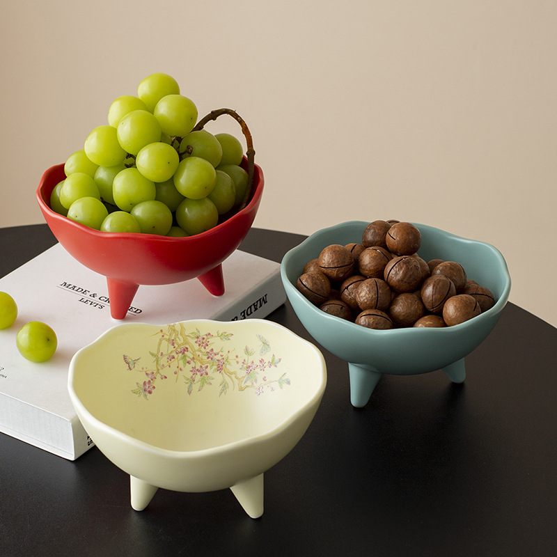 Đĩa trái cây, đĩa giải khát chân cao gốm sứ kiểu Trung Quốc, đĩa đựng đồ ăn nhẹ, đĩa ăn vặt, bát ba chân không đều trong phòng khách