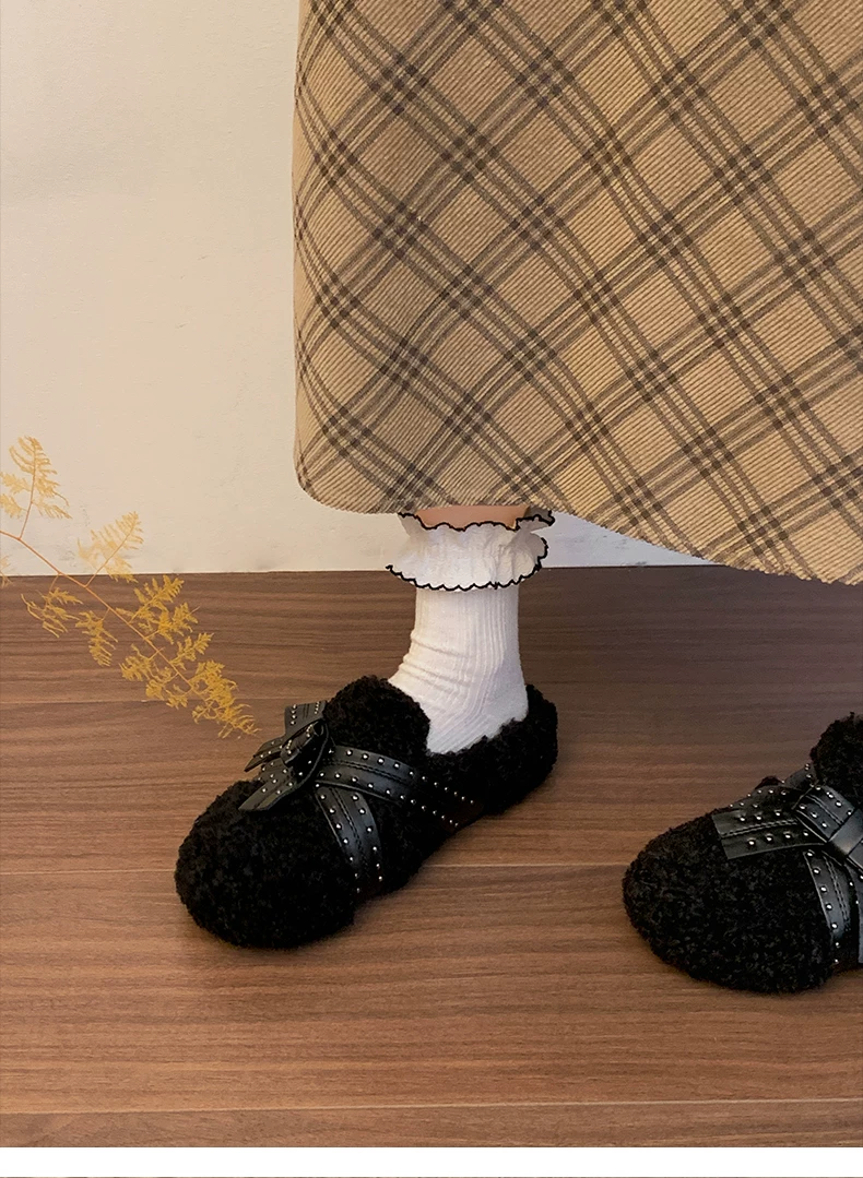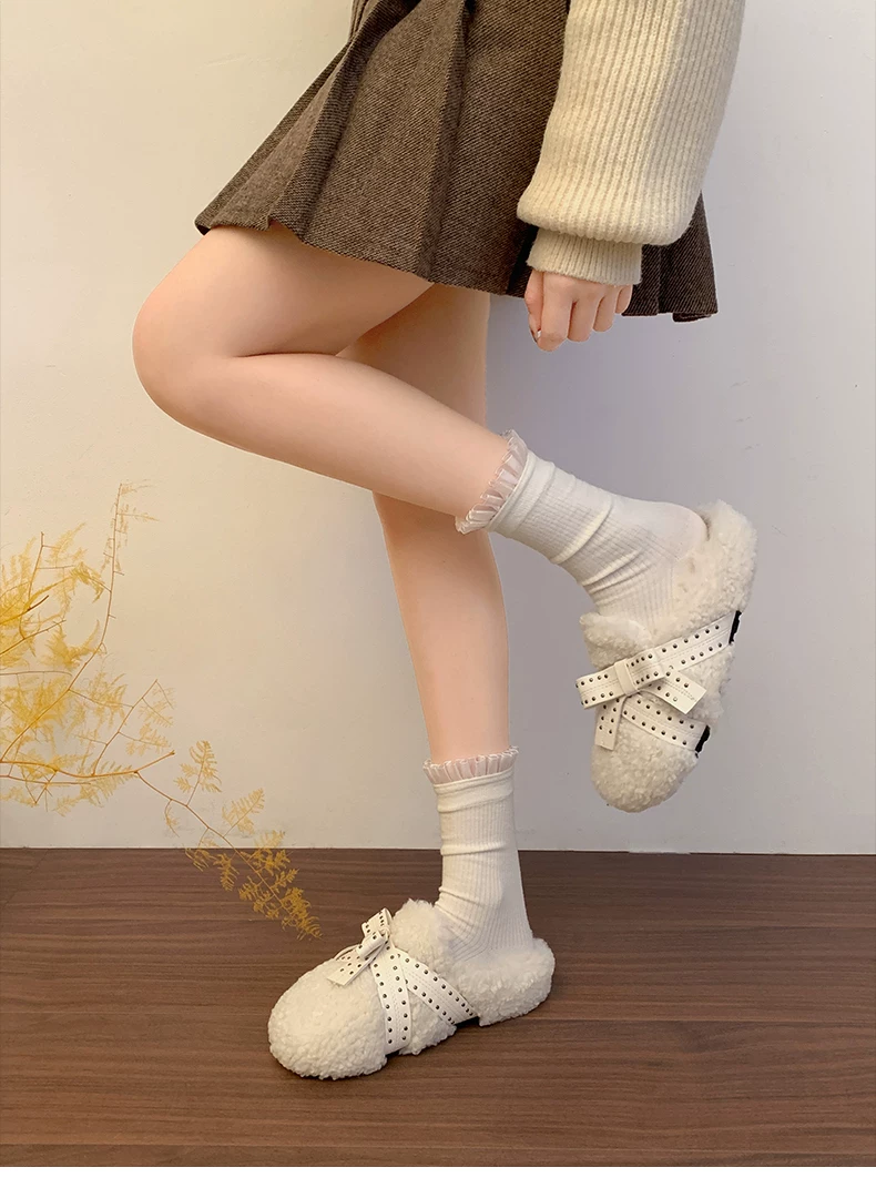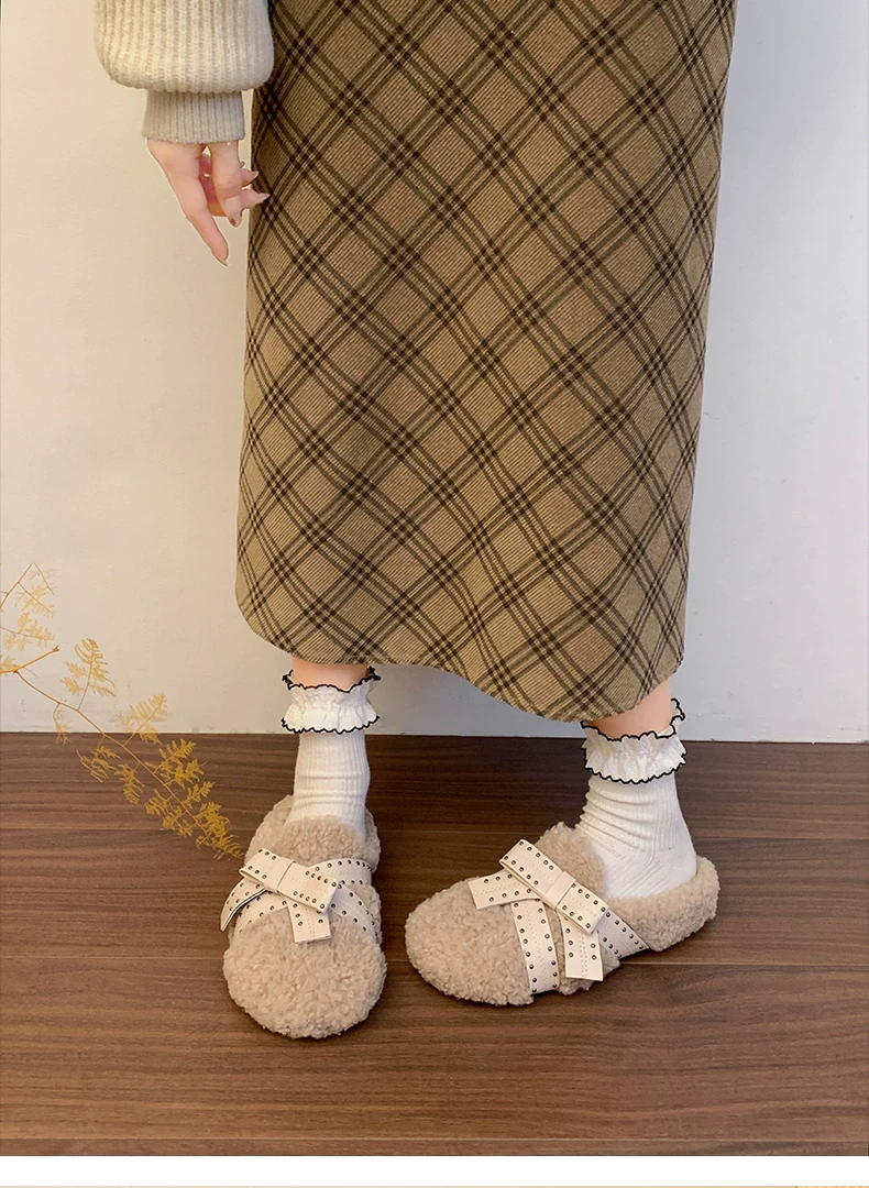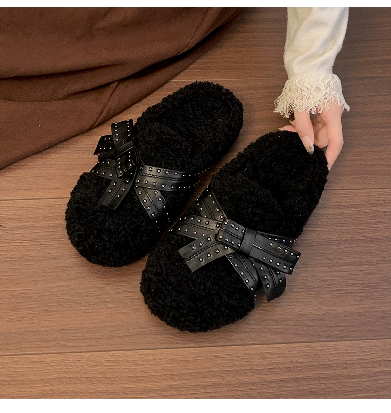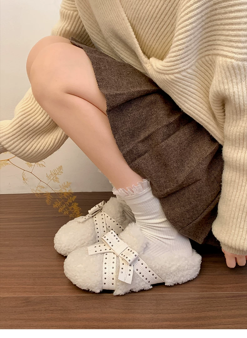- Đôi dép lông dày đế dày kiểu Pháp cổ điển màu trắng dành cho nữ, thích hợp để mang ngoài trời, dép bông dày giữ ấm mùa đông mới năm 2025.