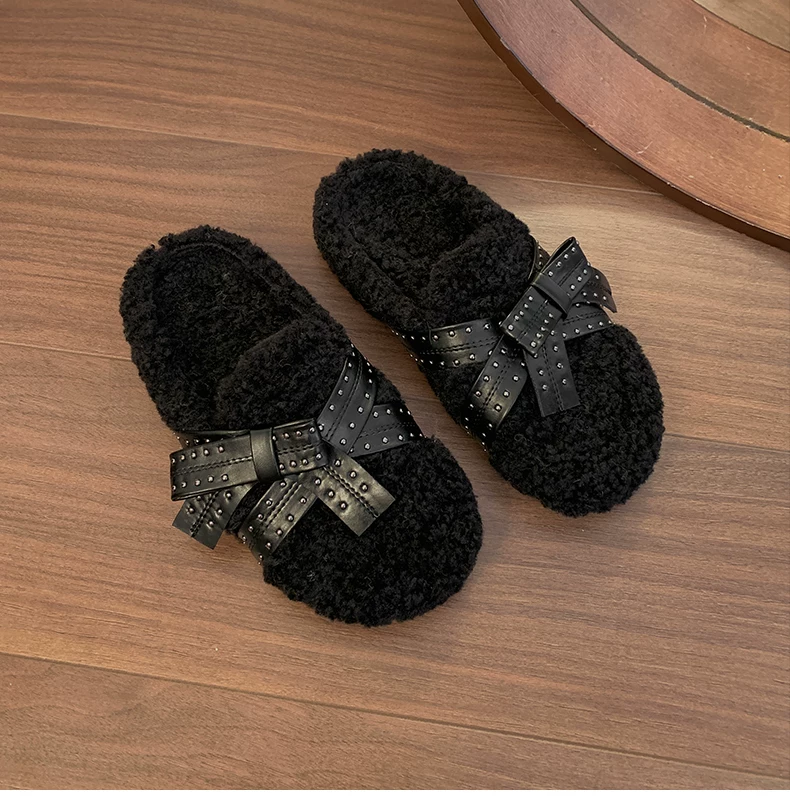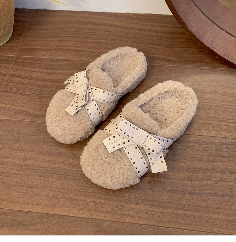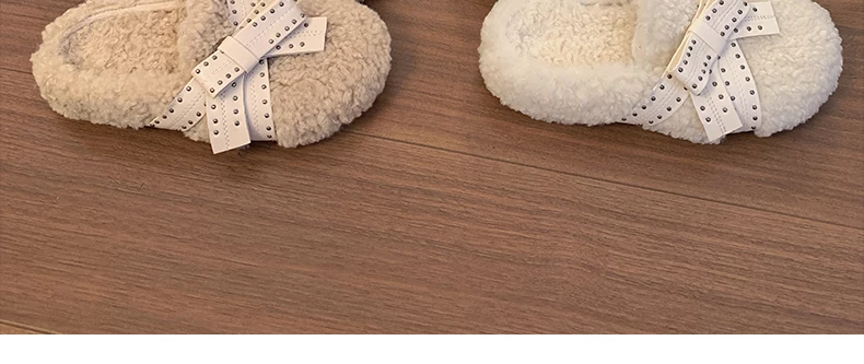 Đôi dép lông dày đế dày kiểu Pháp cổ điển màu trắng dành cho nữ, thích hợp để mang ngoài trời, dép bông dày giữ ấm mùa đông mới năm 2025.