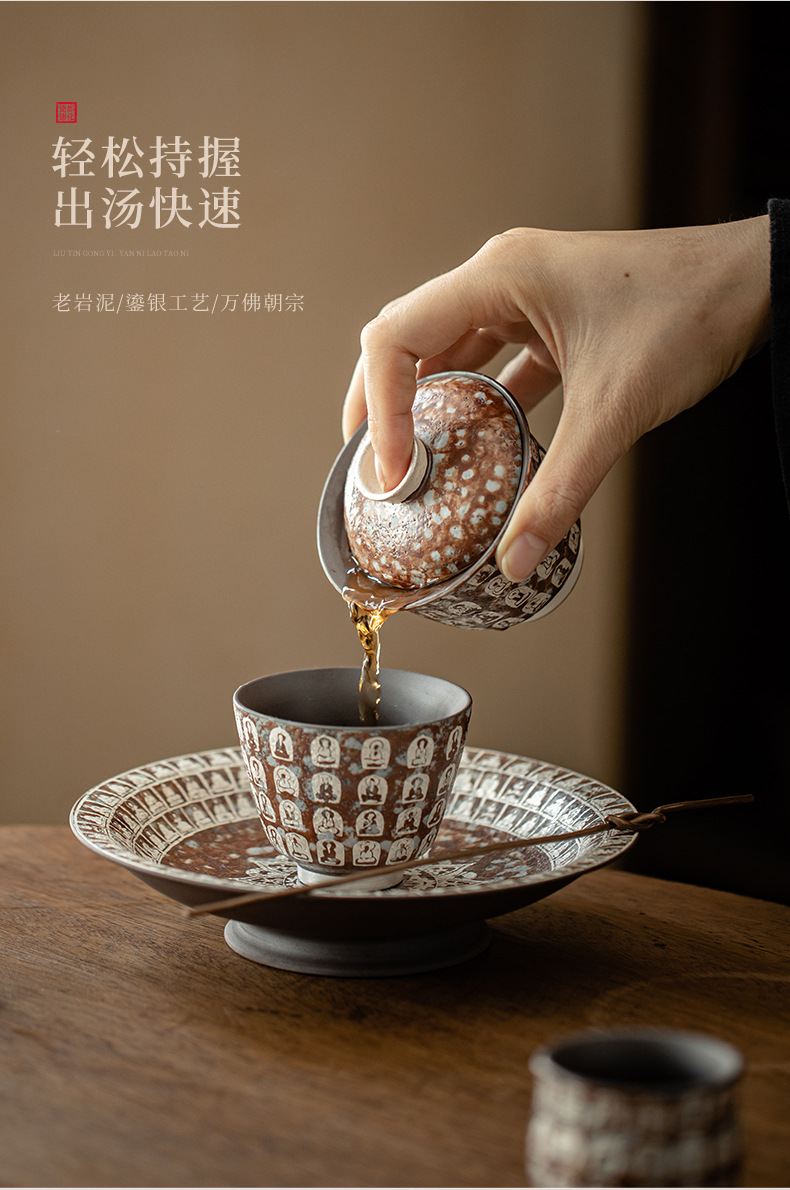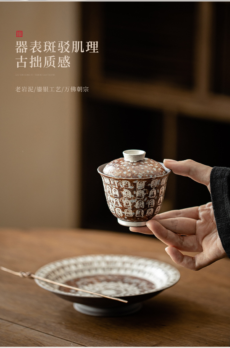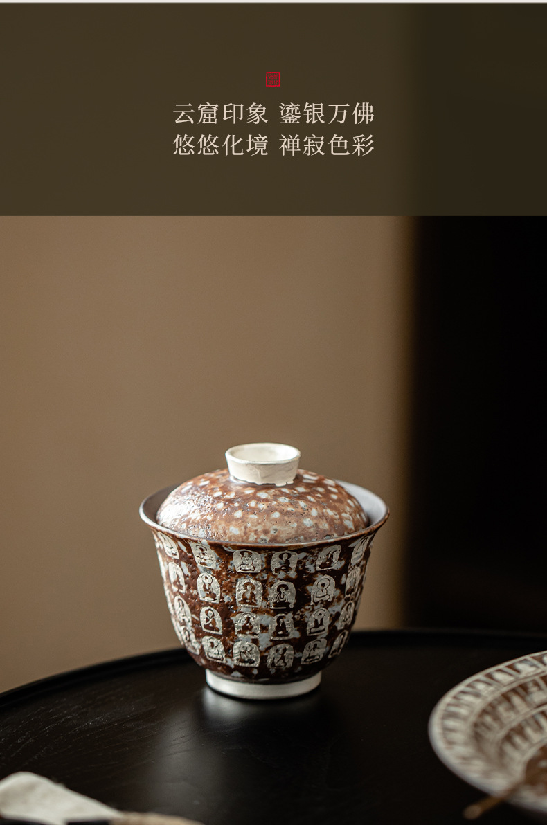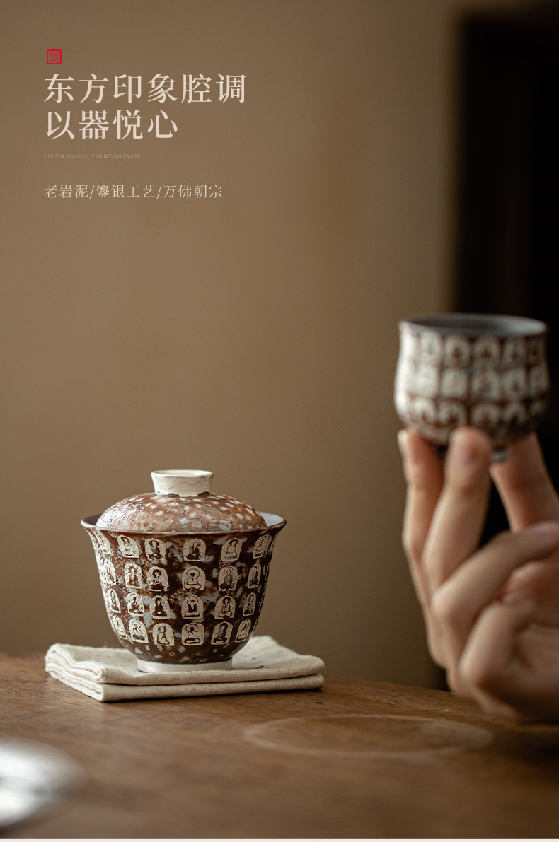 Đôn Hoàng Vạn Phật mạ bạc hai chiếc bát có nắp làm bằng gốm thô thủ công bùn đá cổ điển Bát Trà Hộp Quà Bộ trà Kung Fu