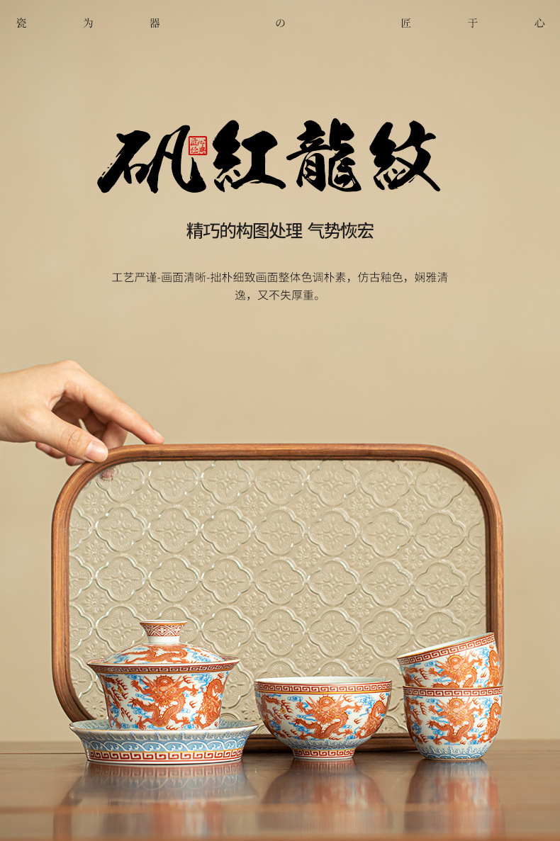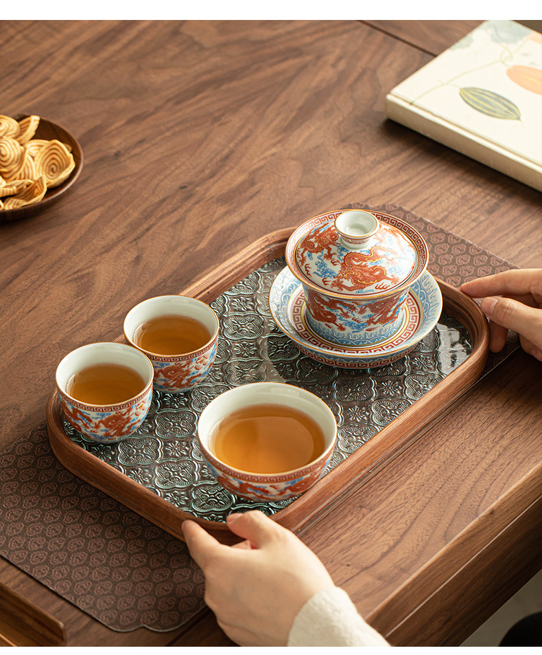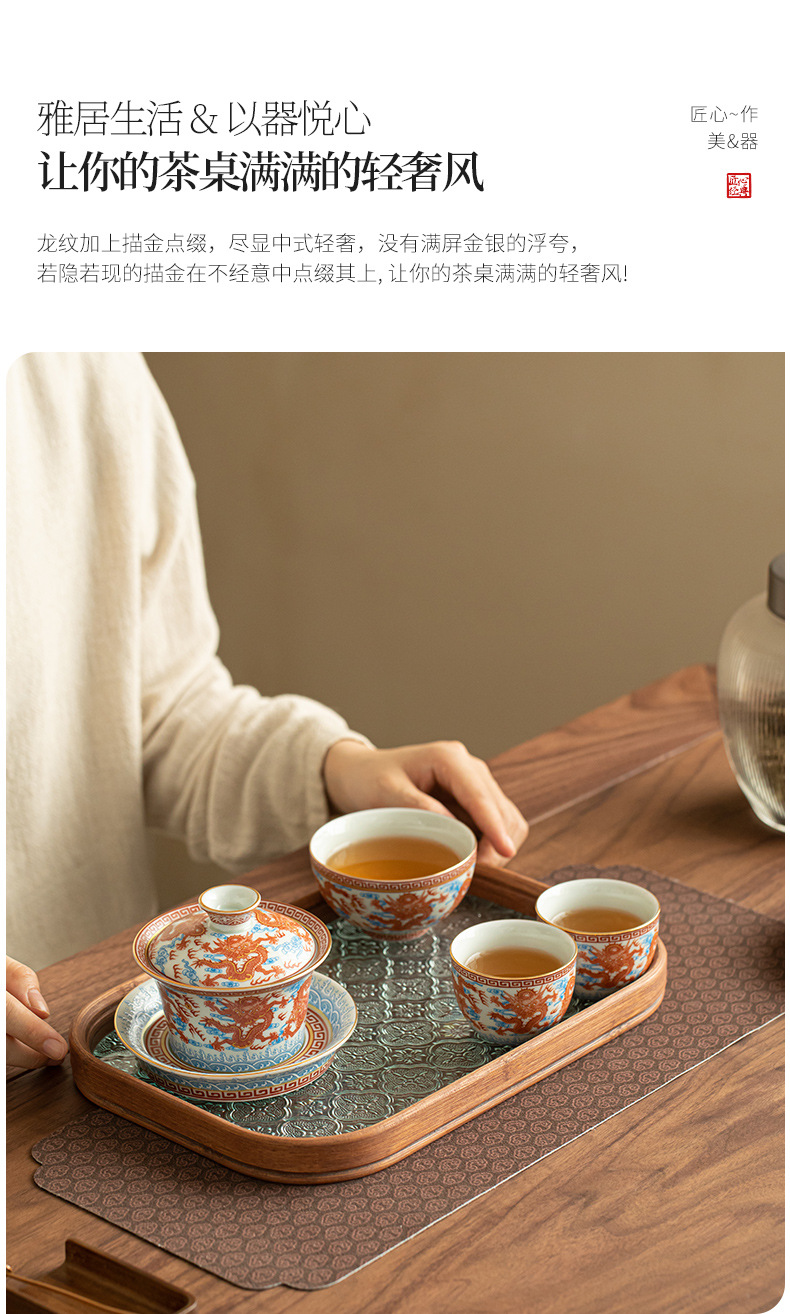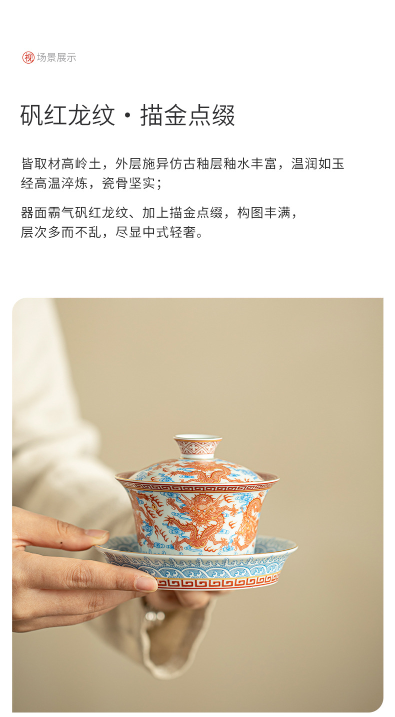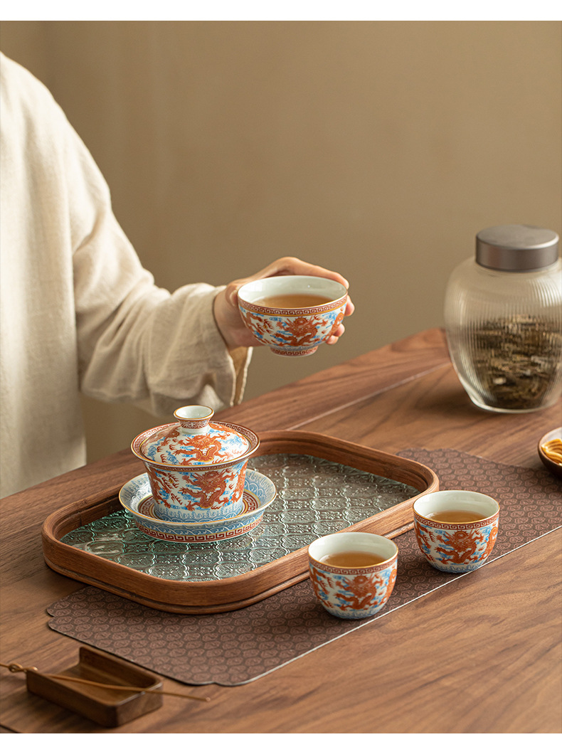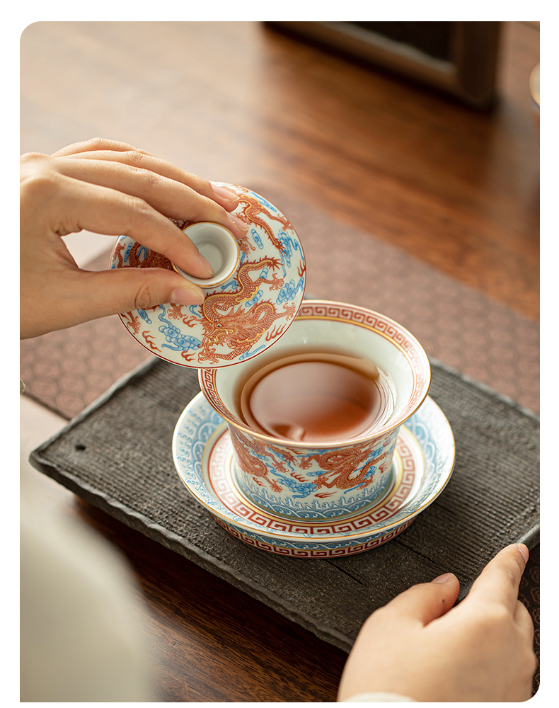 - Dụng cụ pha trà bát có nắp ba tài hoa văn rồng Công Hồng dụng cụ pha trà dụng cụ pha trà công phu gốm sứ gia dụng