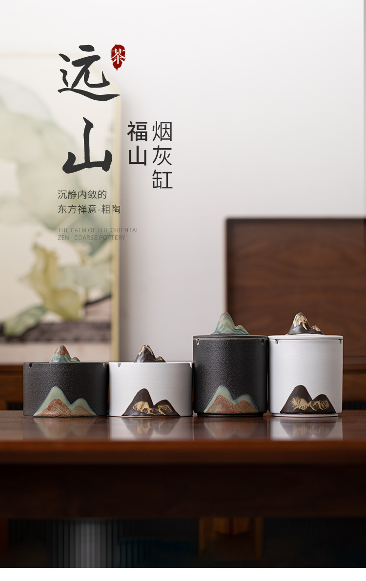 Gạt tàn có nắp núi xa, bàn trà chống bay phòng khách gia dụng thủ công sáng tạo, gạt tàn gốm sứ chống gió đơn giản