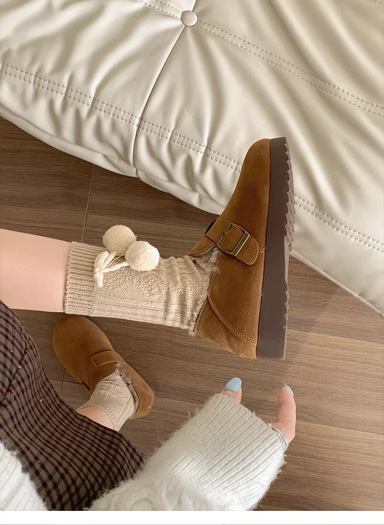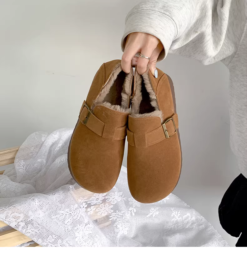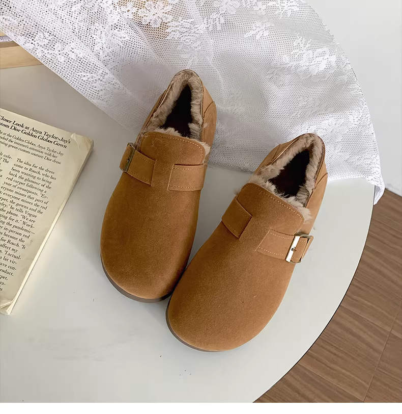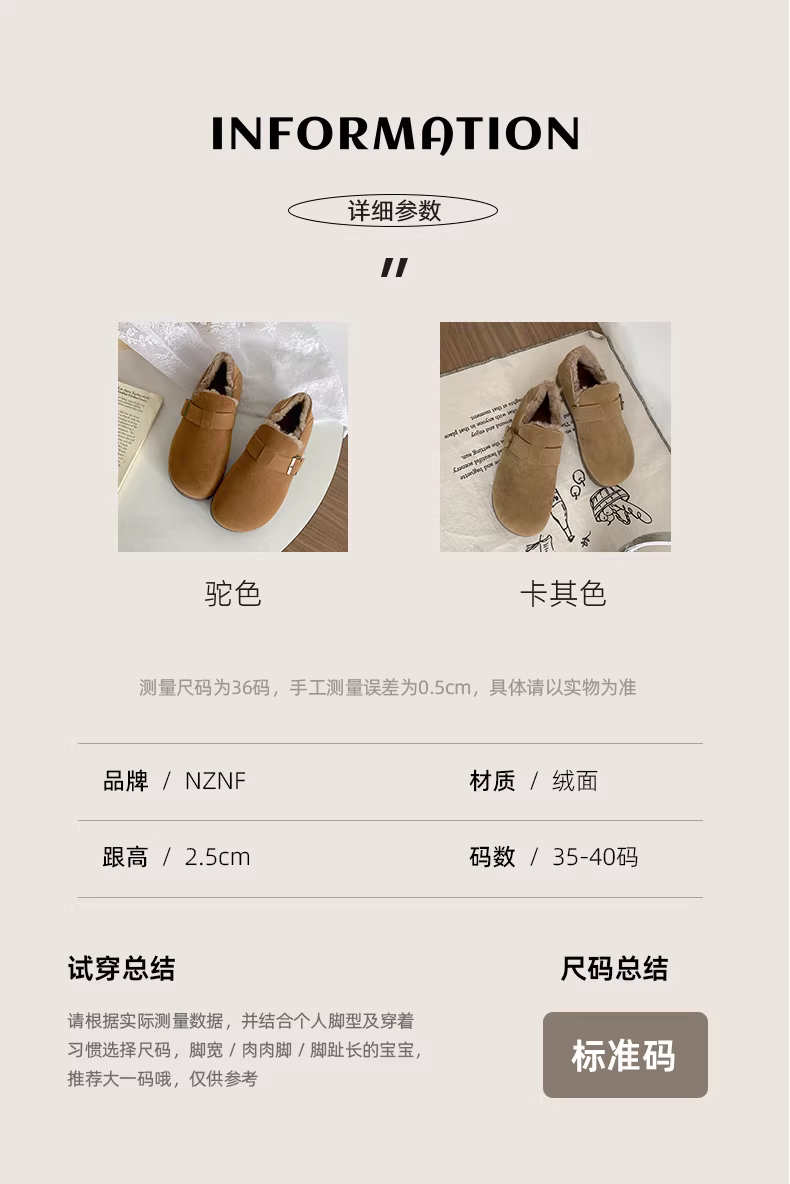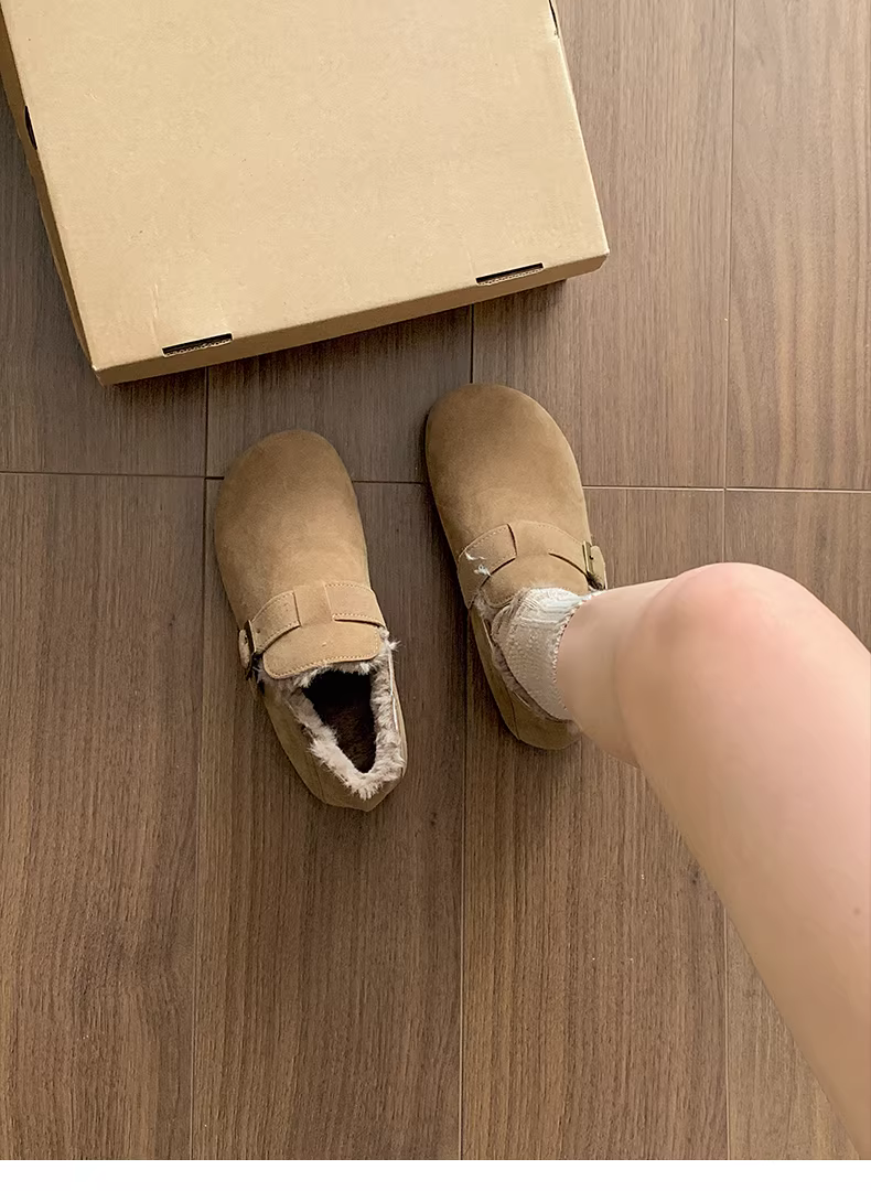 - Giày Birkenstock đế dày lót lông màu kaki retro Nanzai Nanguan dành cho nữ 2025 Giày cotton ấm đế mềm tăng chiều cao mùa đông mới