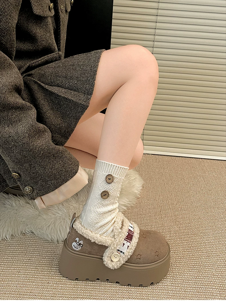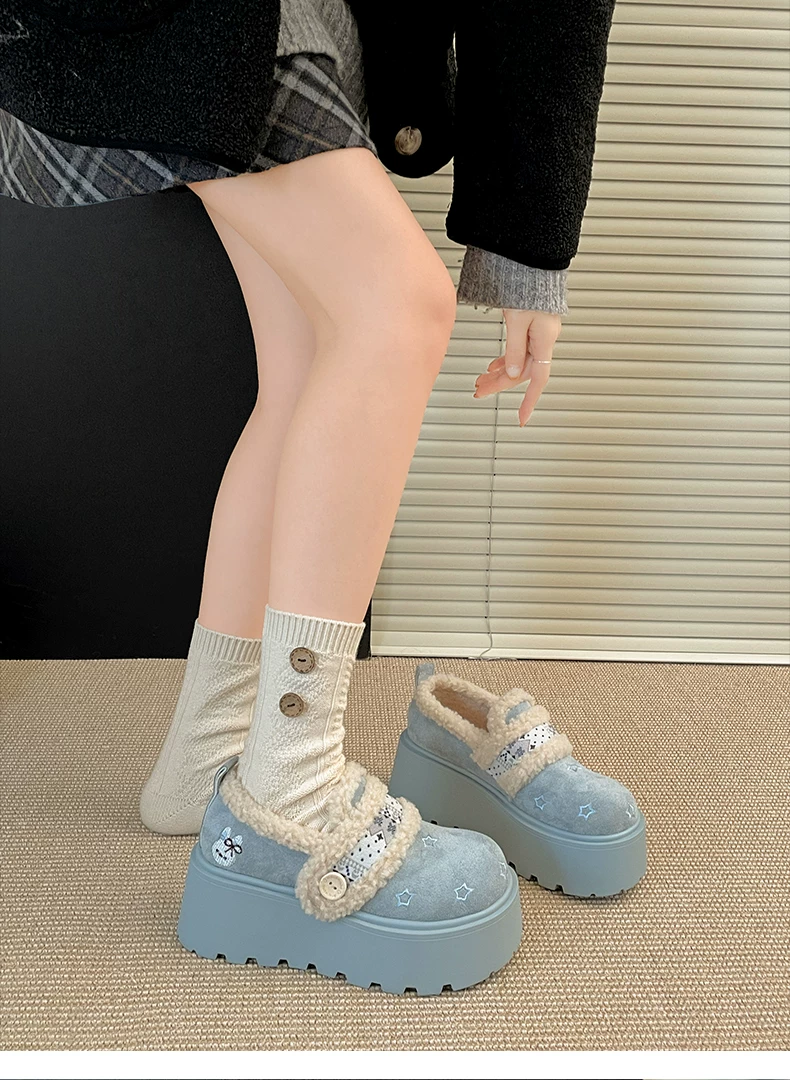 Giày bông giữ ấm đế dày lót lông cừu trắng dành cho nữ, kiểu mới mùa đông 2025, giày Birkenstock lông thú tăng chiều cao đi ngoài trời.