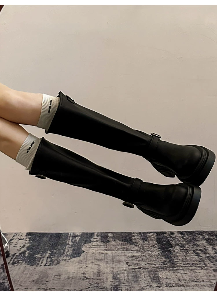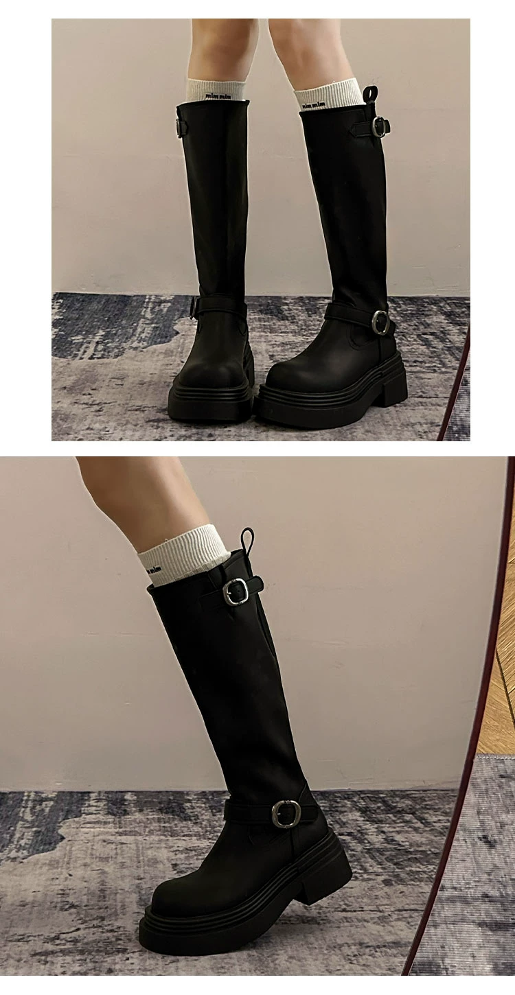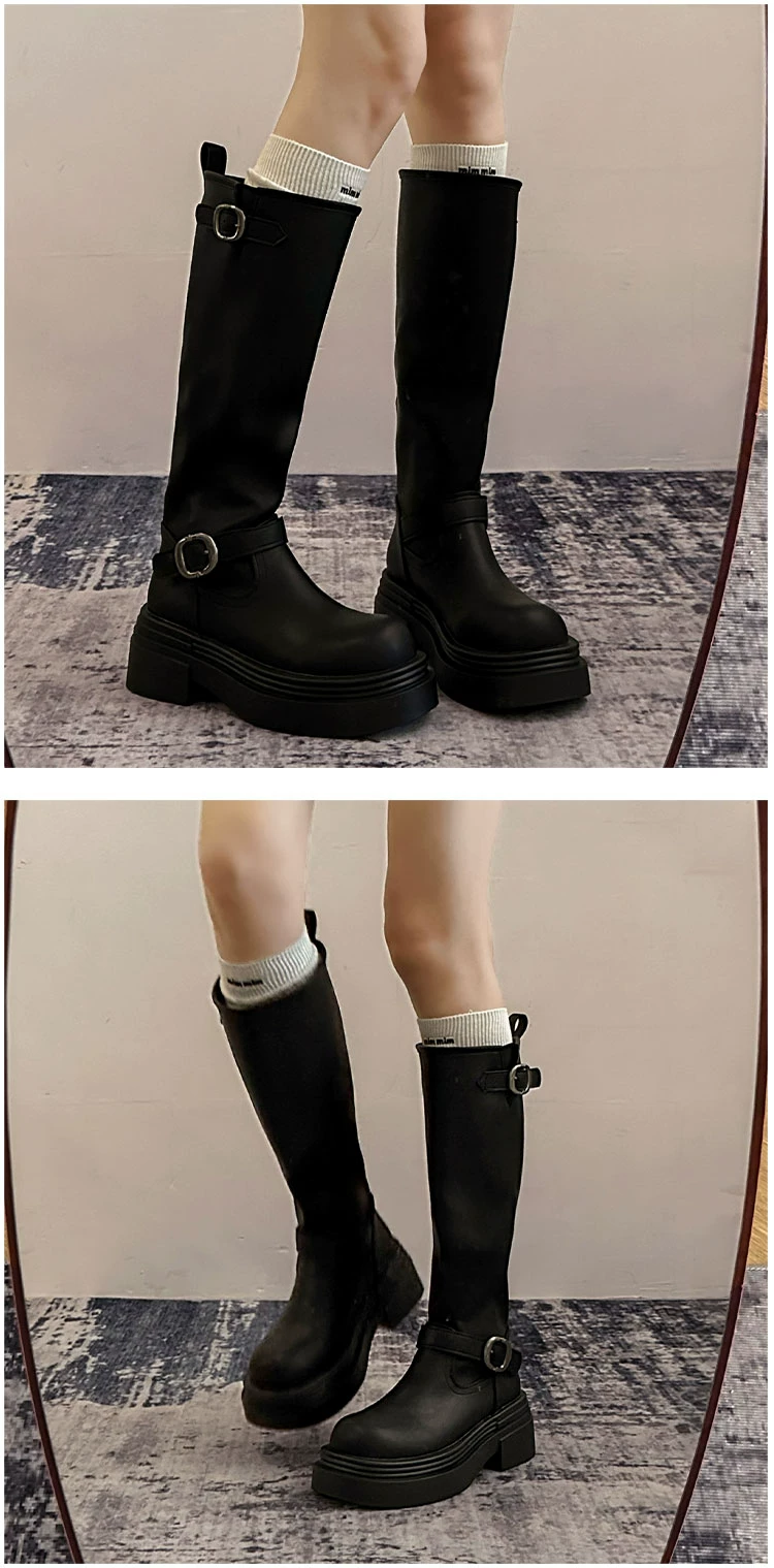 Giày bốt cao đến đùi đế xuồng chunky kiểu Mỹ màu đen dành cho nữ, mẫu mới thu đông 2025, kiểu dáng Anh, tôn dáng, kiểu đi cưỡi ngựa