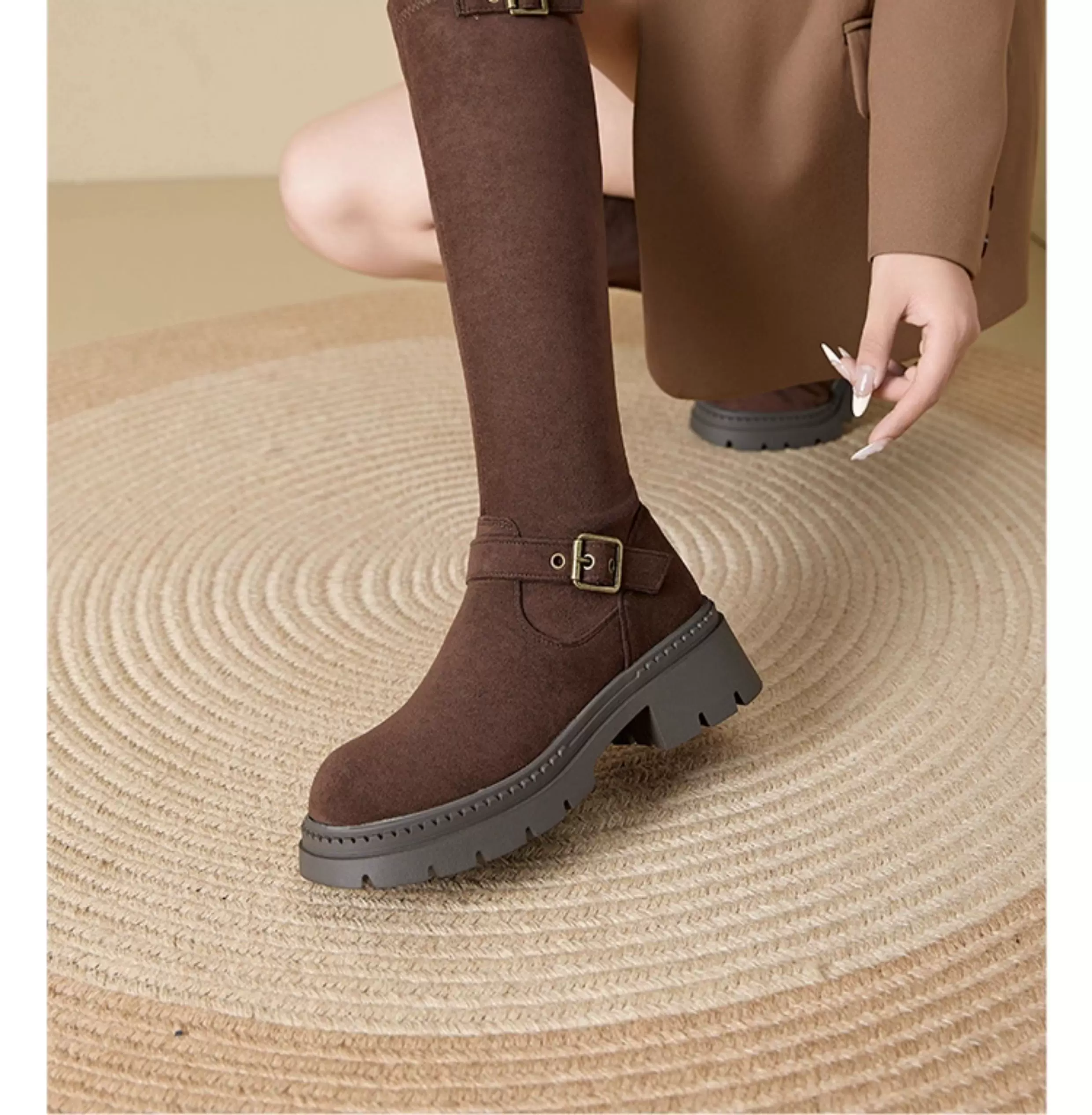 Giày bốt dài màu đen Dadong dành cho nữ 2025, mẫu mới thu đông, kiểu ôm sát, đế dày, cổ cao, kiểu đi xe.