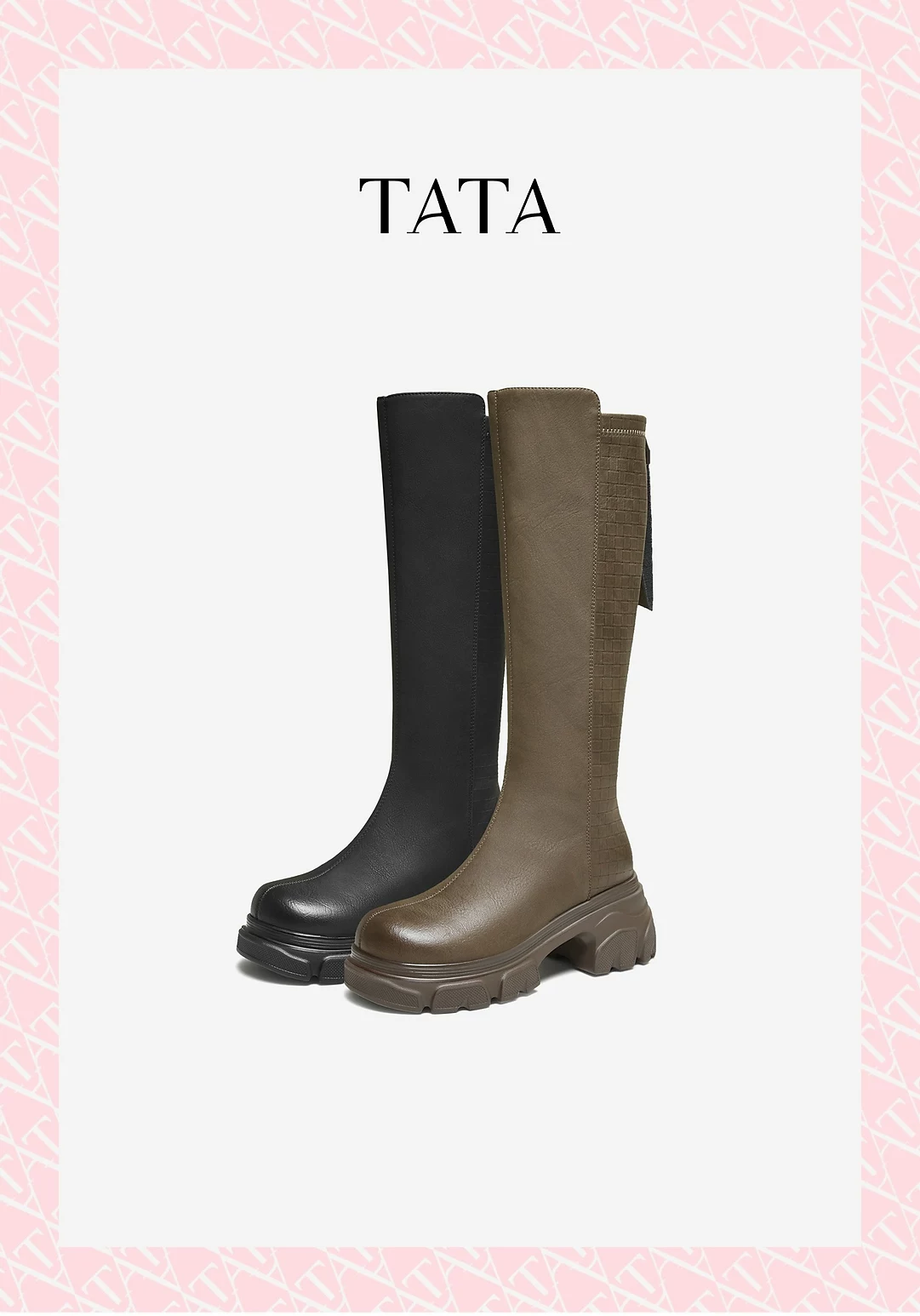 Giày bốt dài TATA 2025 Giày bốt thời trang mới mùa đông Giày bốt nữ thông thường Giày bốt co giãn tăng chiều cao đa năng JXG01DG5
