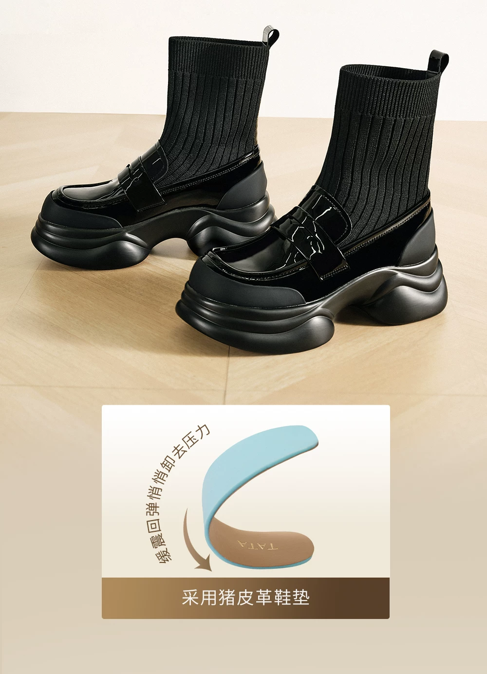 Giày bốt đế dày của Anh TATA Giày nữ Giày bốt tất co giãn mỏng có lót lông cừu Giày bốt ngắn CCJ02CZ5