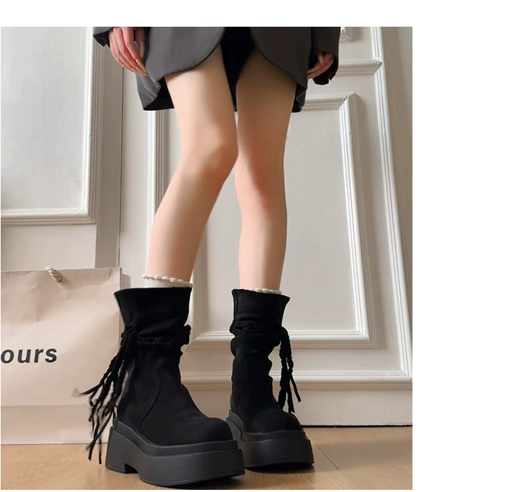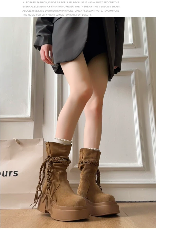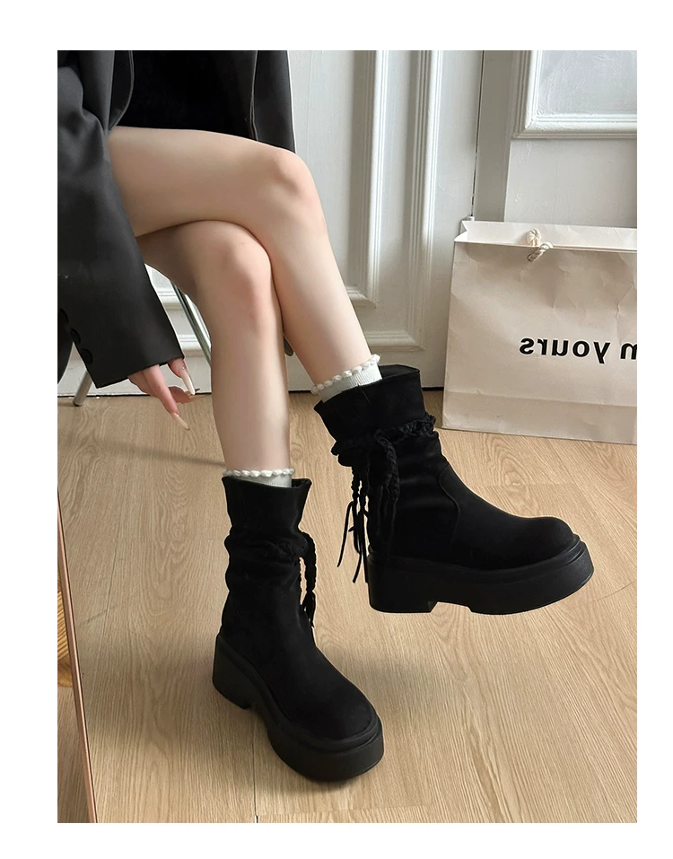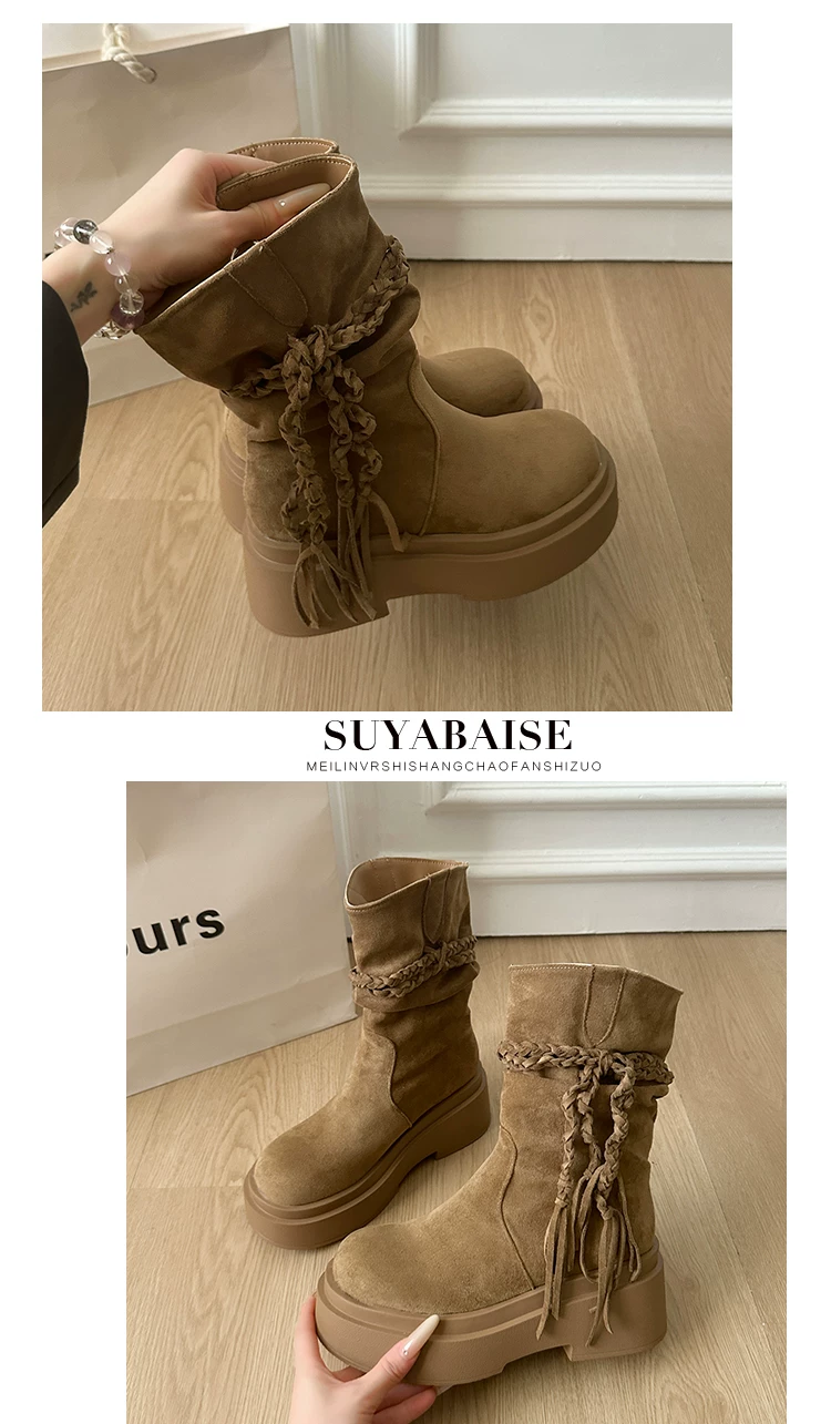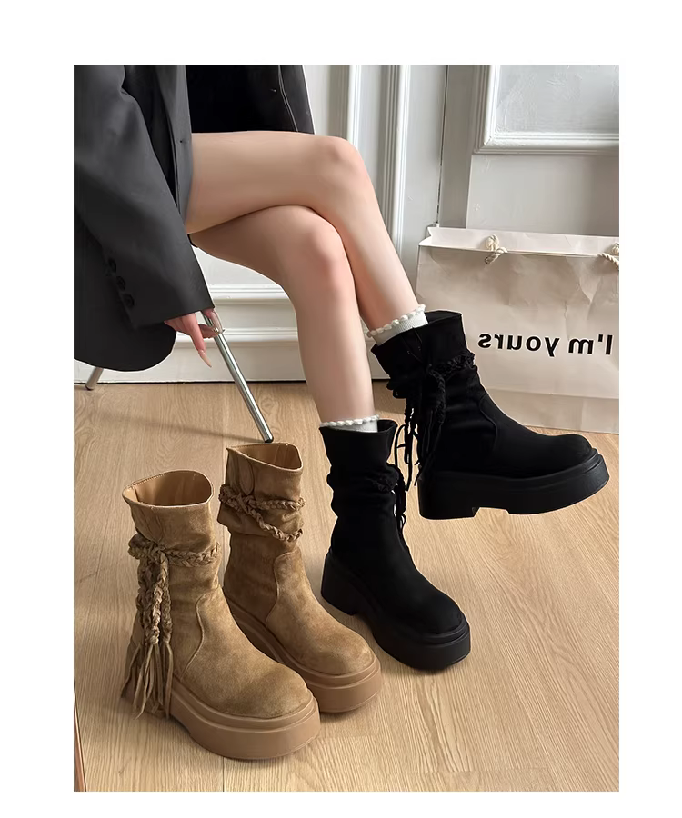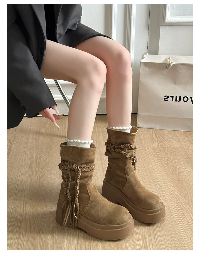 - Giày bốt đế dày màu kaki đa năng kiểu retro dành cho nữ, mẫu mới thu đông 2025, tăng chiều cao, tôn dáng, kiểu Birkenstock, dáng lười, cổ ngắn
