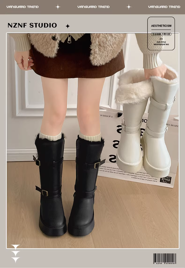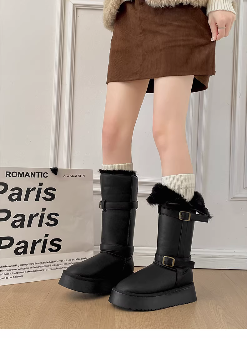 - Giày bốt đi tuyết đế dày chống trượt lót lông cừu màu trắng dành cho nữ, giày cotton ấm áp ngoài trời mùa đông mới năm 2025.