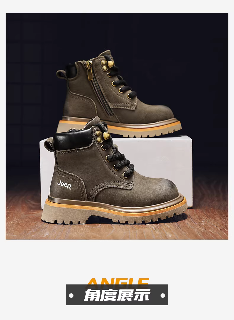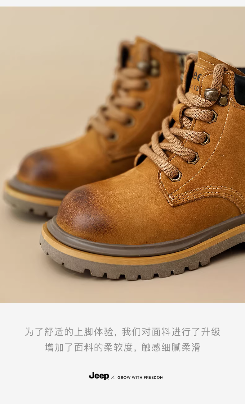 - Giày bốt Martin da thật dành cho trẻ em của hãng Jeep, cotton hai lớp, bé trai và bé gái, kiểu thu đông 2025, bốt ngắn lót lông cừu, bốt da, bốt màu vàng.