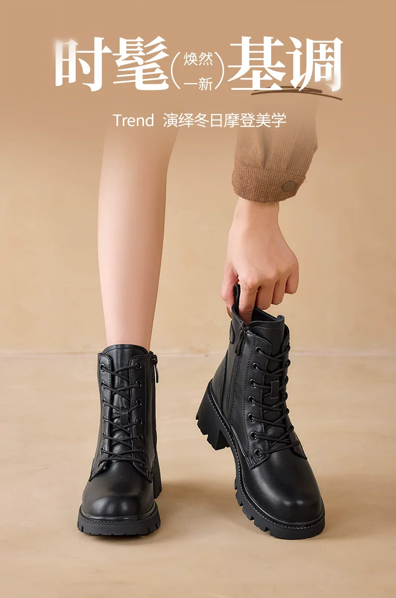 Giày bốt Martin kiểu Anh Dadong dành cho nữ 2025, giày mùa đông mới, màu đen, đế dày, gót chunky, cổ ngắn, lót lông cừu