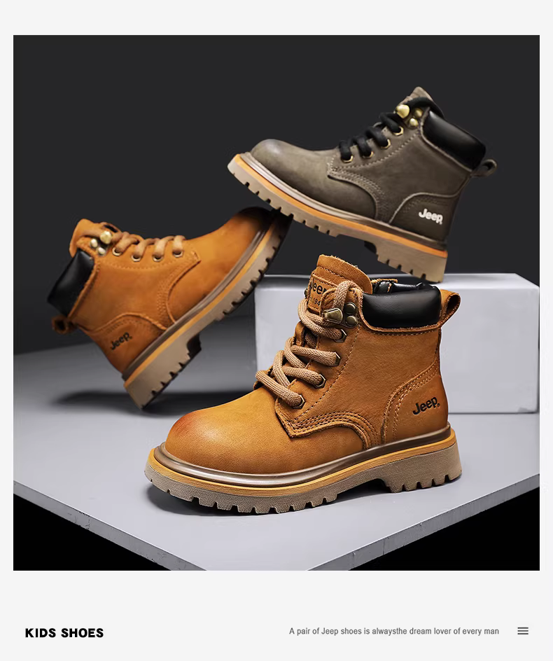 Giày bốt Martin lót lông cừu bằng da thật dành cho trẻ em của hãng Jeep dành cho bé trai, bốt lớn màu vàng, giày cotton lót lông cừu mới 2025, bốt ngắn, bốt đi tuyết.