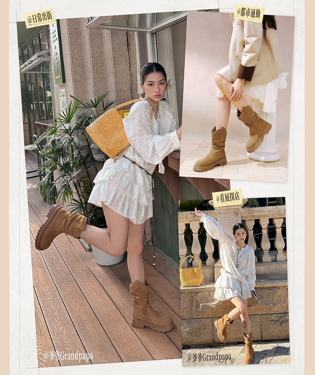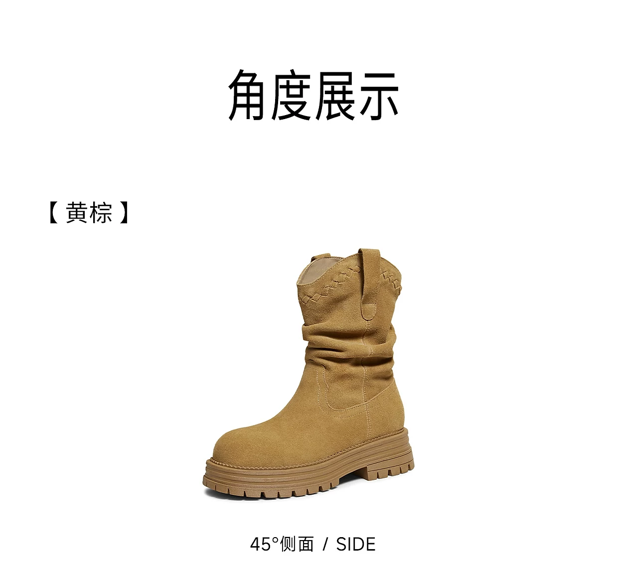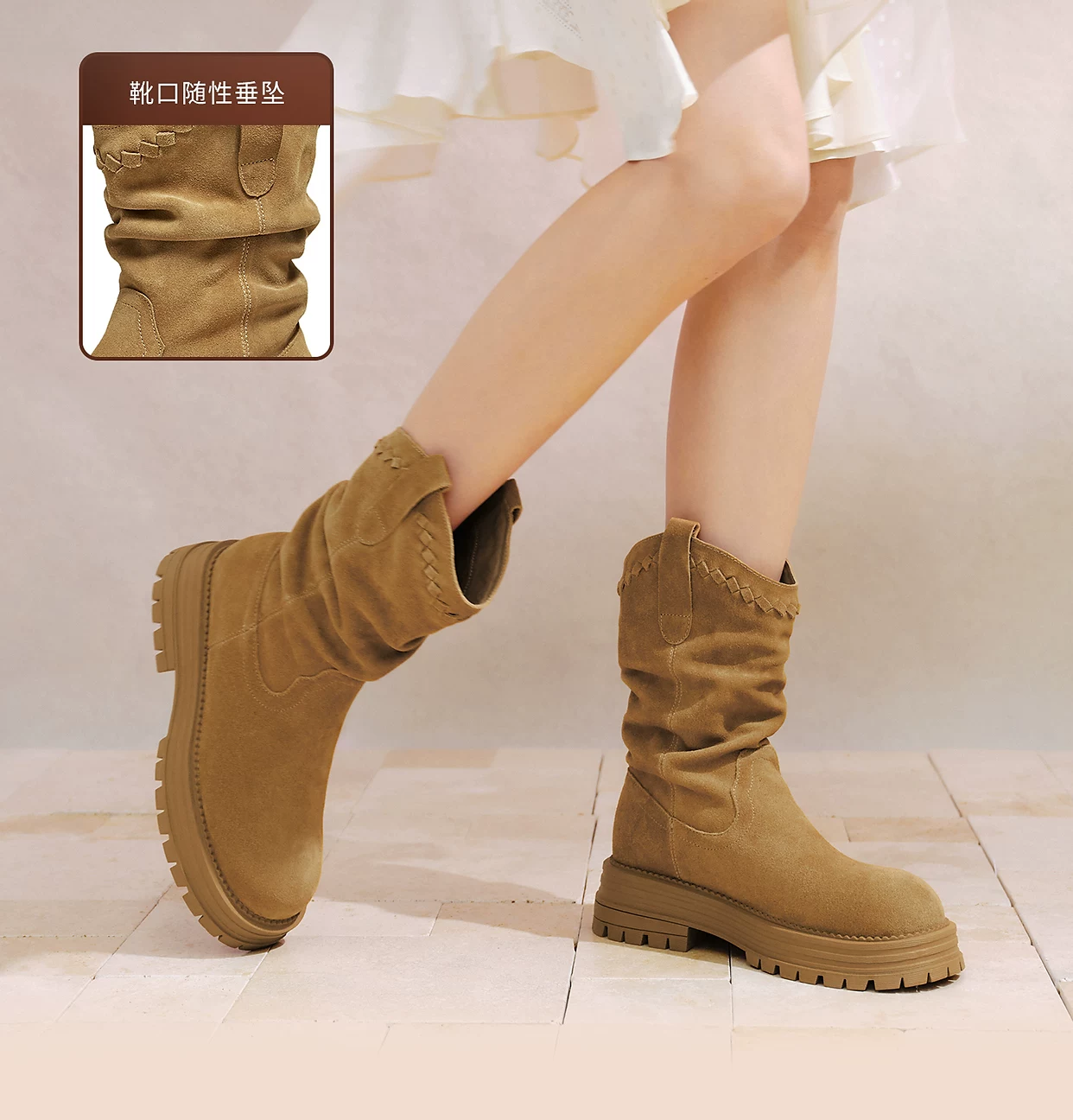 - Giày bốt mới TATA Himeno Sweetheart 2025 có lớp lót lông mềm, kiểu dáng phương Tây, màu vàng xếp tầng thời trang CHT01DS5