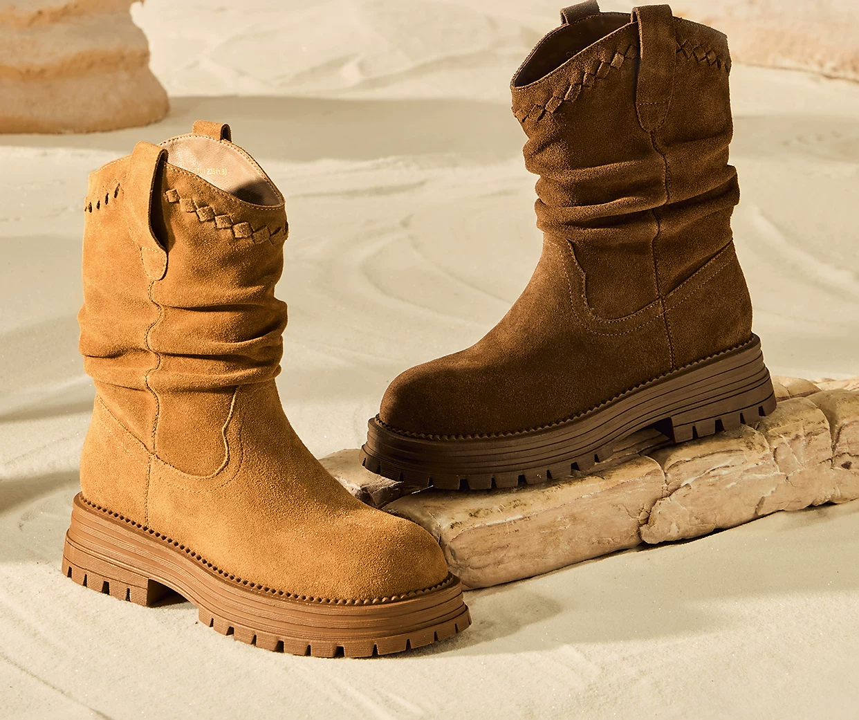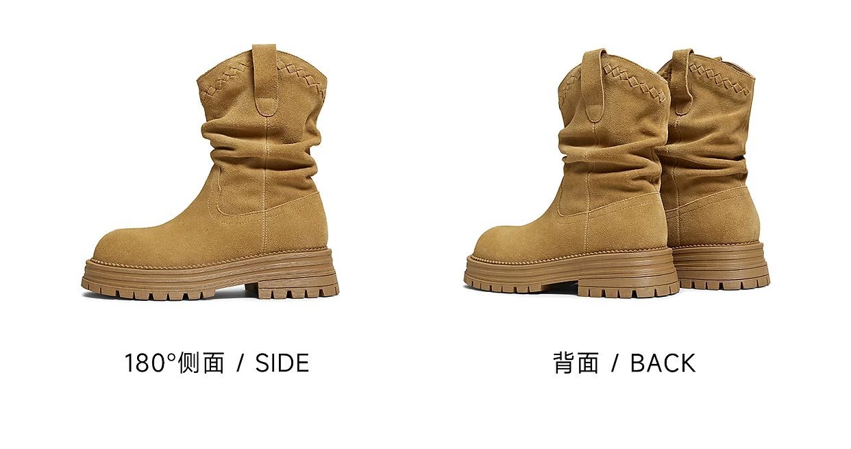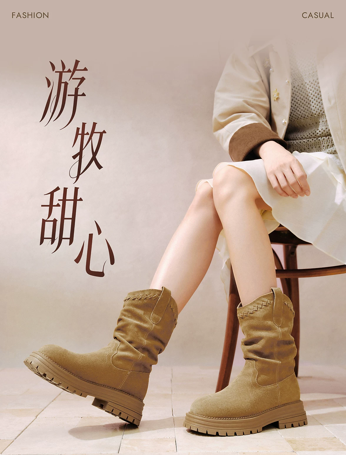 - Giày bốt mới TATA Himeno Sweetheart 2025 có lớp lót lông mềm, kiểu dáng phương Tây, màu vàng xếp tầng thời trang CHT01DS5