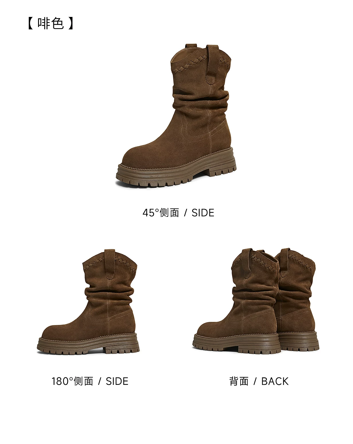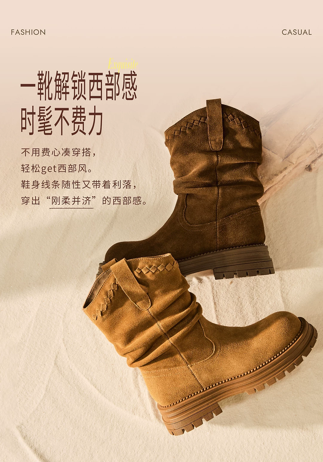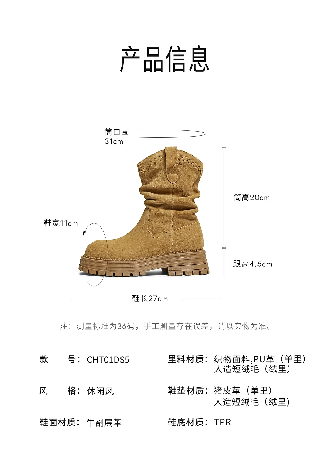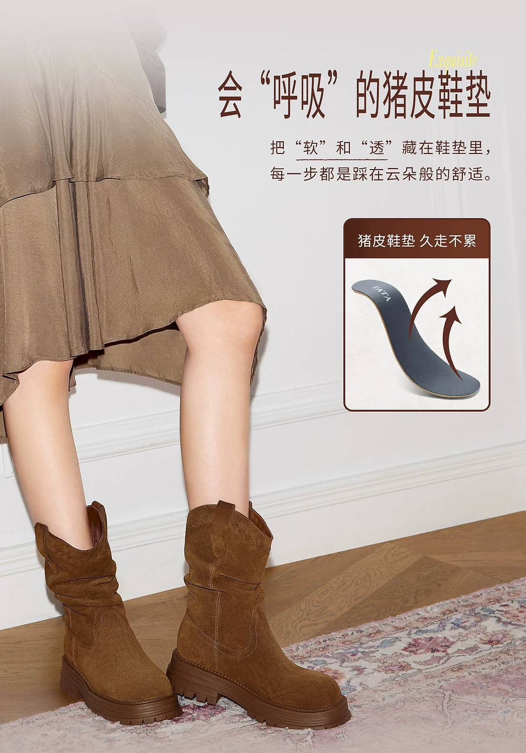 Giày bốt mới TATA Himeno Sweetheart 2025 có lớp lót lông mềm, kiểu dáng phương Tây, màu vàng xếp tầng thời trang CHT01DS5