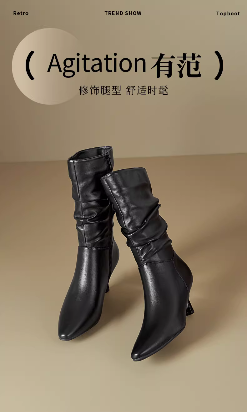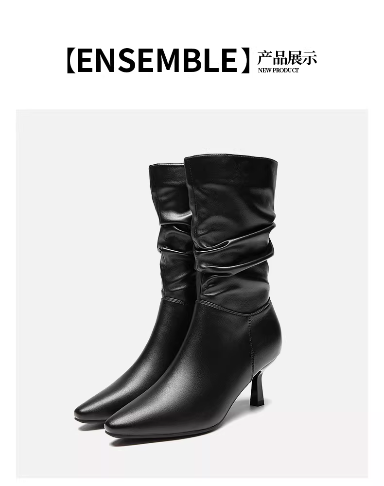 Giày bốt mũi nhọn Dadong dành cho nữ 2025, mẫu mới thu đông, màu đen, đa năng, kiểu dáng ôm sát, kiểu xếp tầng, gót nhọn, cao đến giữa bắp chân.