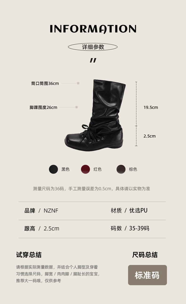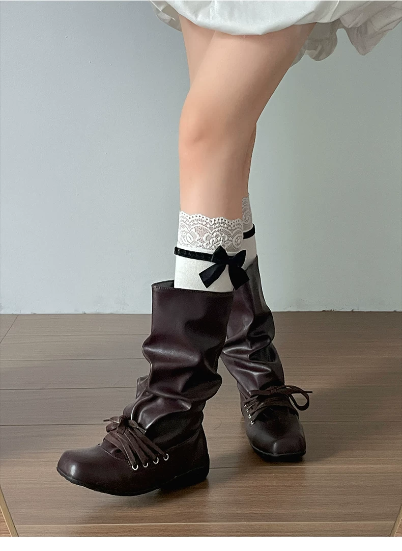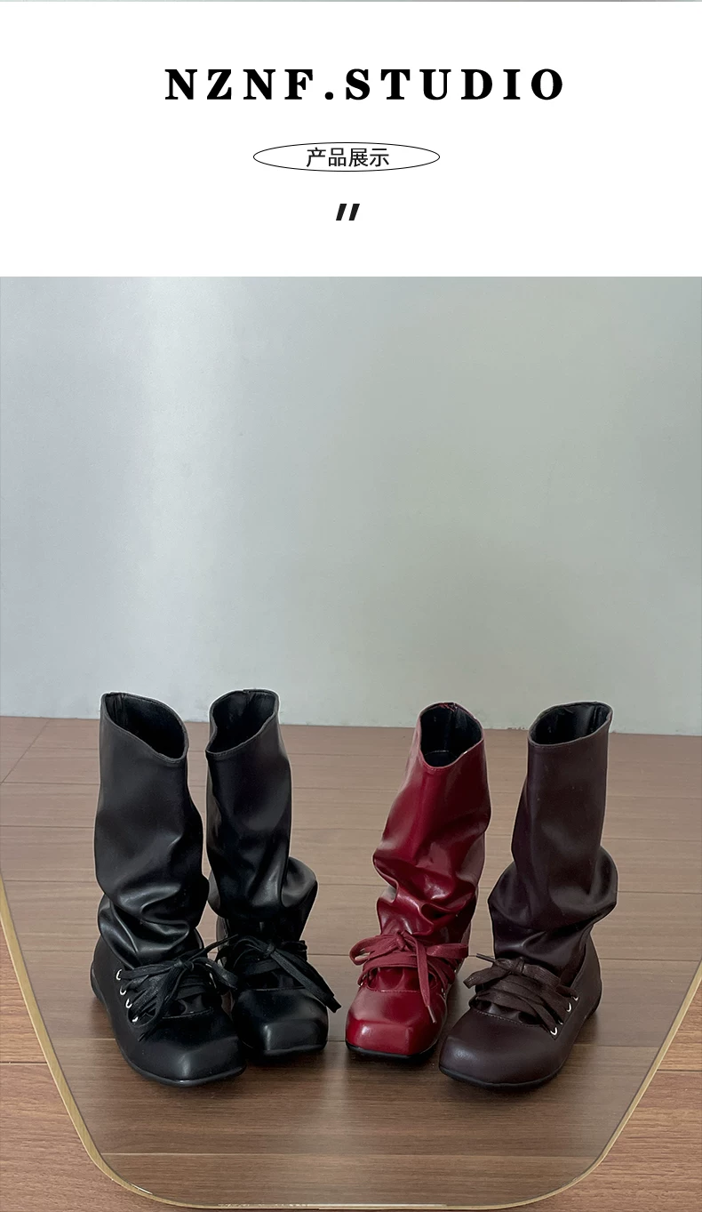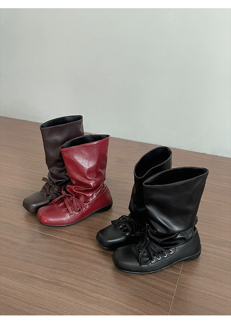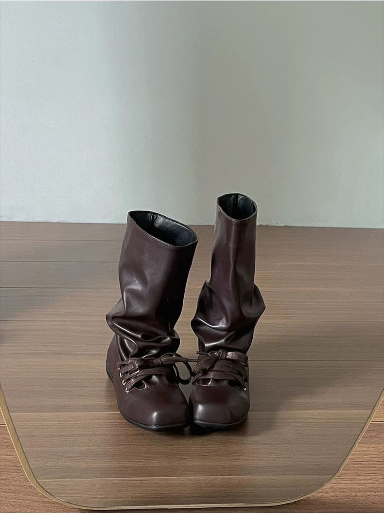 - Giày bốt nữ đế bằng mũi vuông đa năng kiểu retro màu nâu, kiểu mới mùa thu 2025, phối cùng chân váy, kiểu dáng xòe rộng phong cách miền Tây.