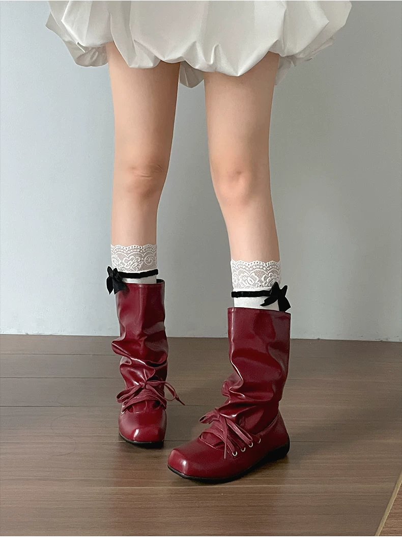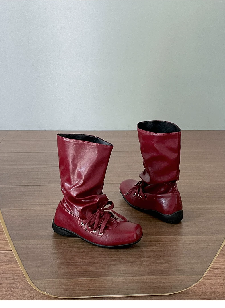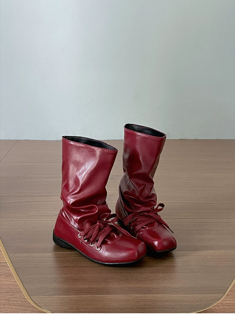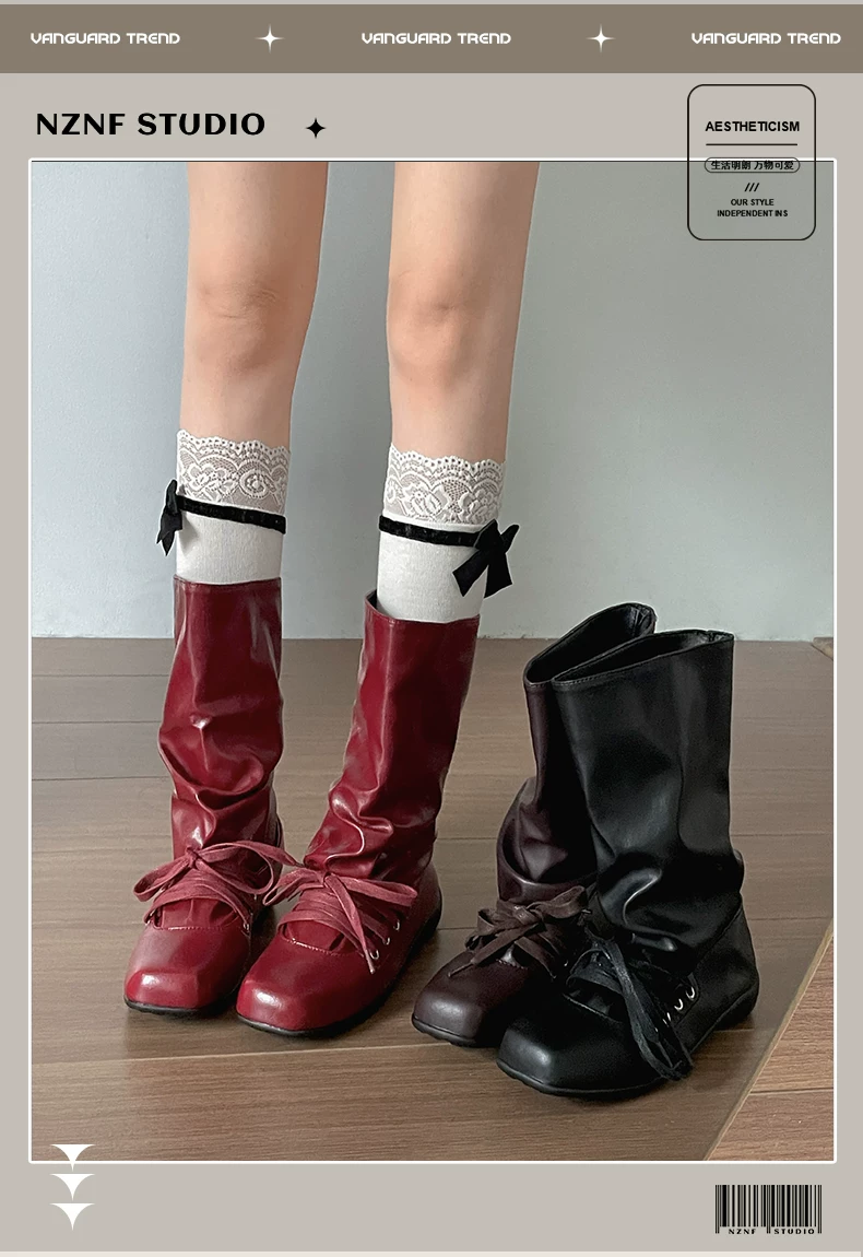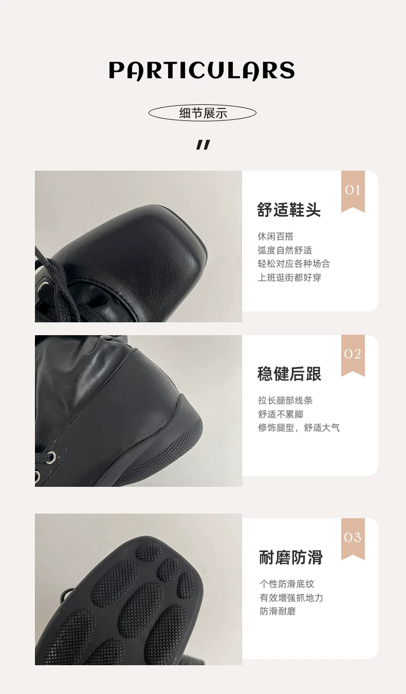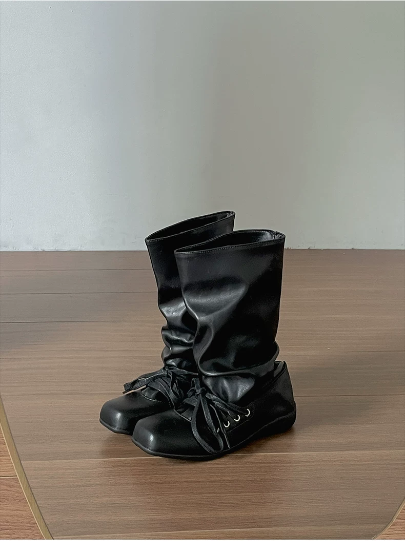 - Giày bốt nữ đế bằng mũi vuông đa năng kiểu retro màu nâu, kiểu mới mùa thu 2025, phối cùng chân váy, kiểu dáng xòe rộng phong cách miền Tây.