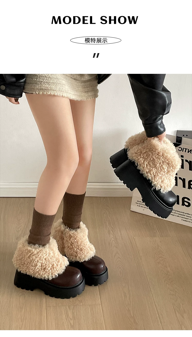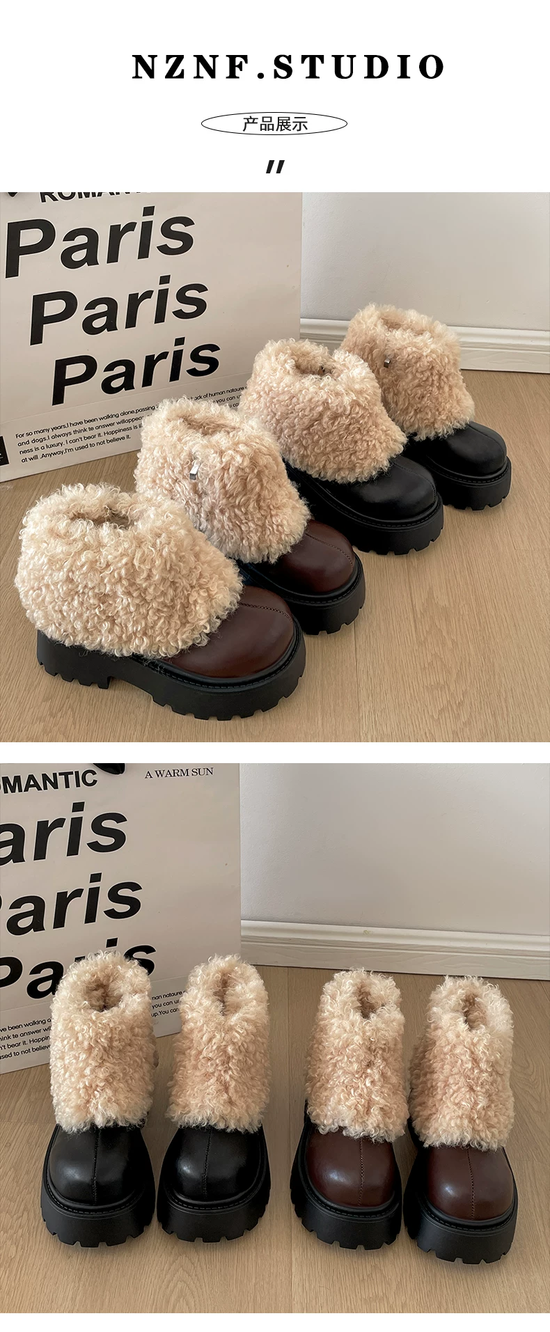 Giày bốt nữ đế xuồng dày, lót lông cừu nâu, chống trơn, đế cao, giữ ấm mùa đông 2025, tăng chiều cao, chất liệu bông mềm mại