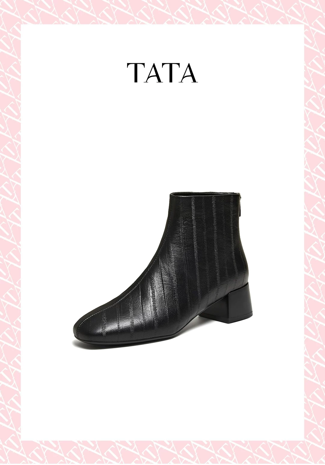 Giày bốt nữ TATA 2025 Giày bốt thời trang mới mùa đông Giày bốt da đen gót nhọn 7ACF4DD5
