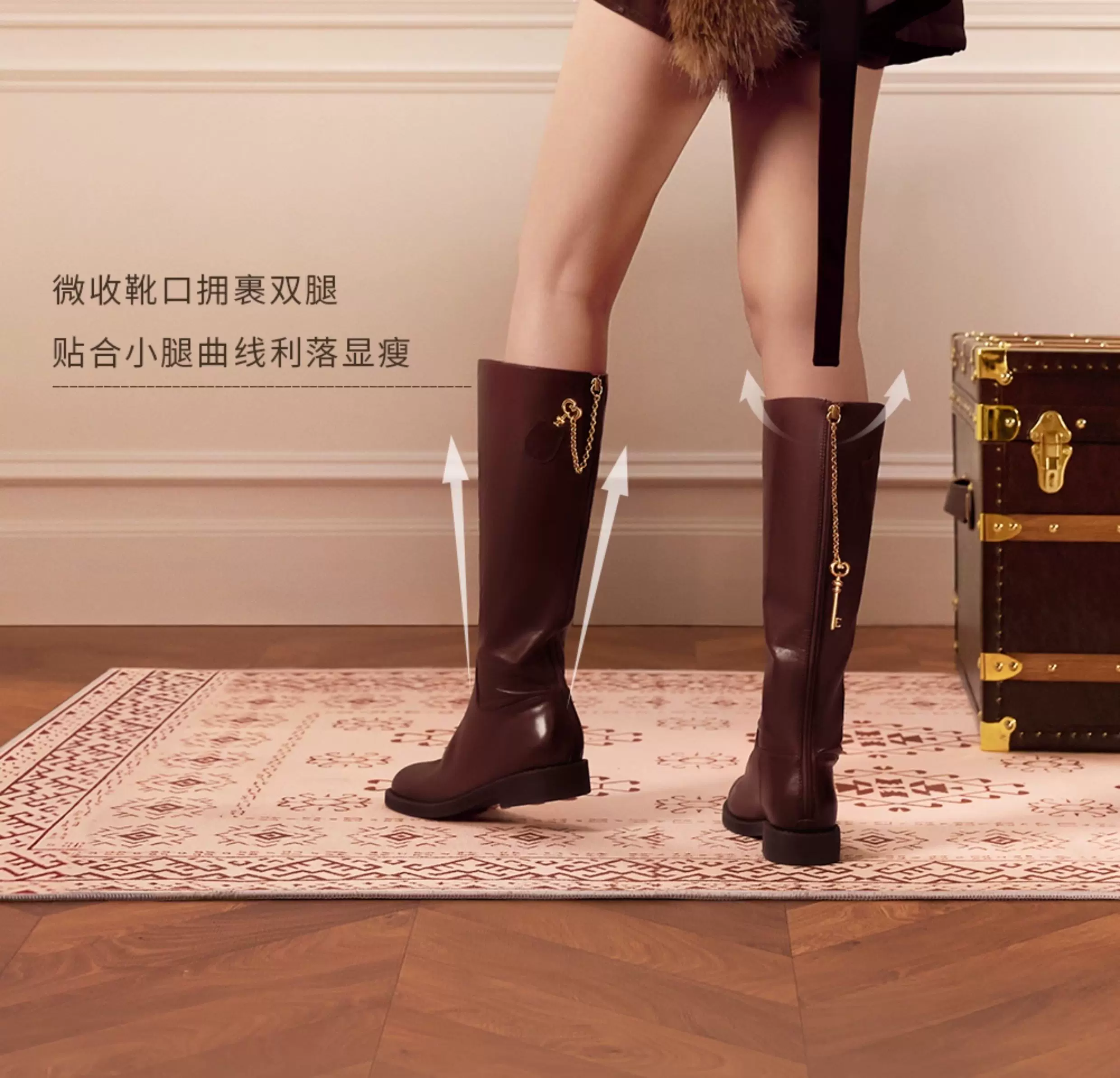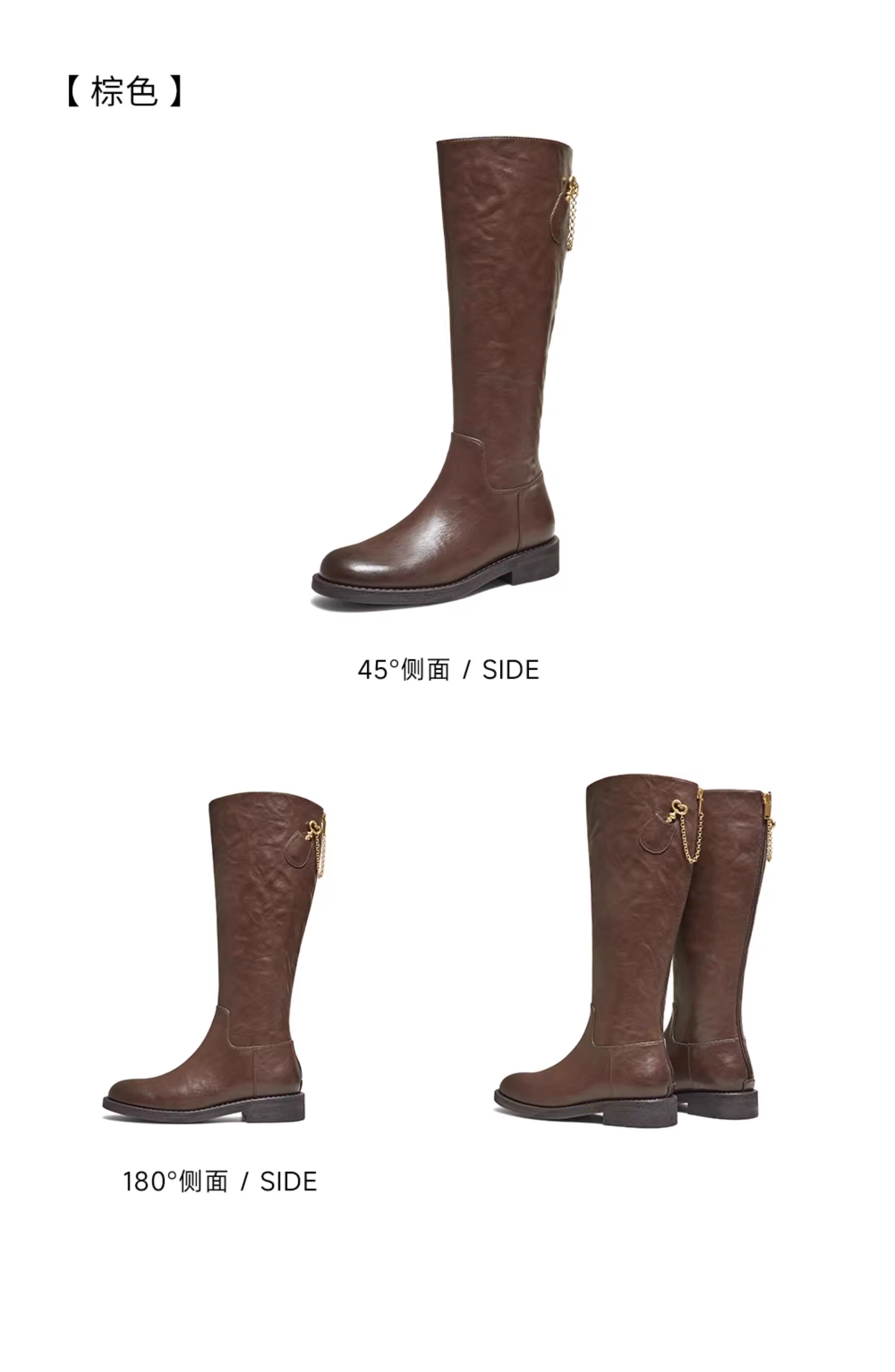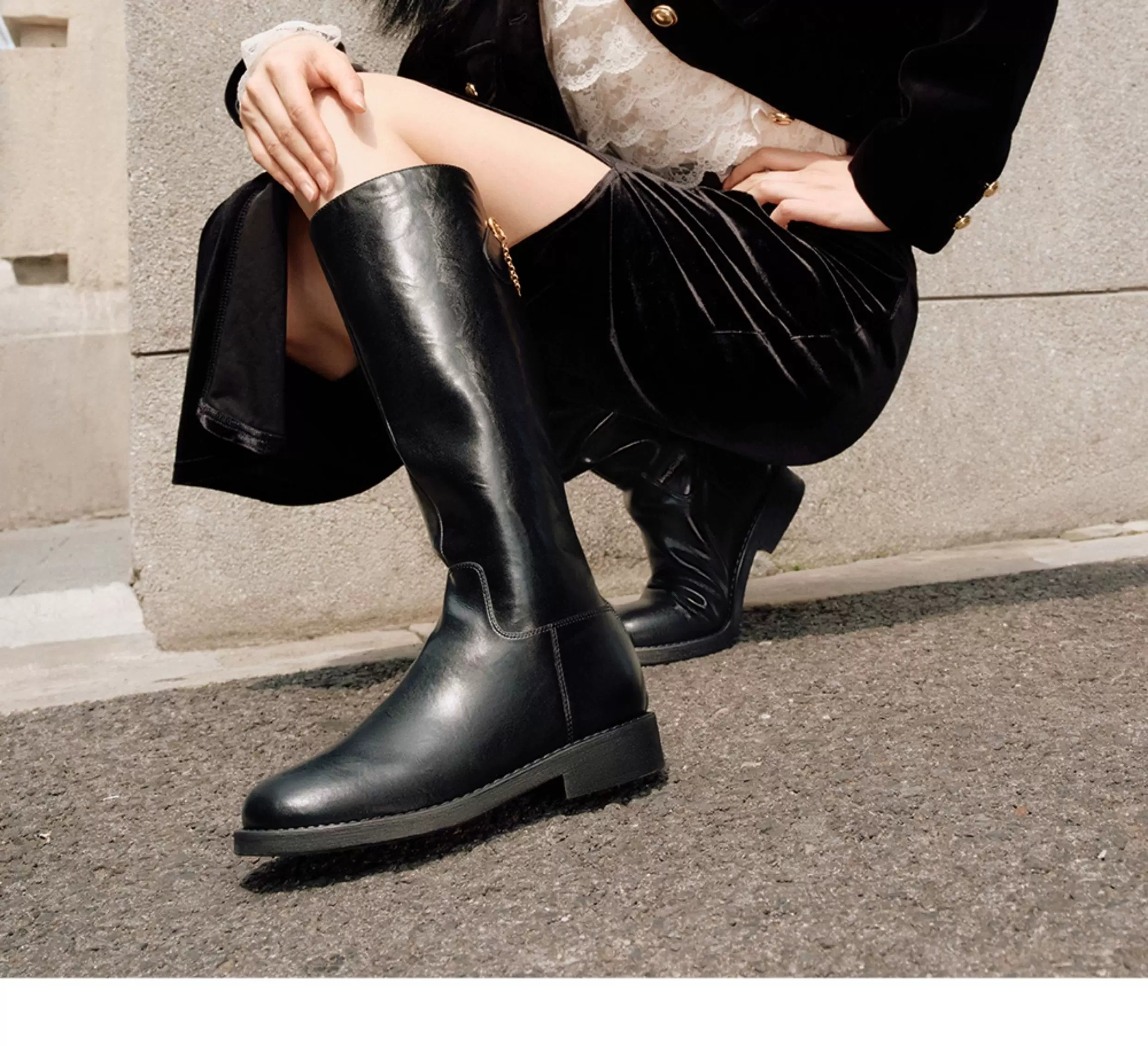 - Giày bốt nữ TATA Da bò có lông cừu Giày bốt thời trang Giày bốt cưỡi ngựa 2025 Giày cao cổ mới Giày bốt dài 7TGA9DG5