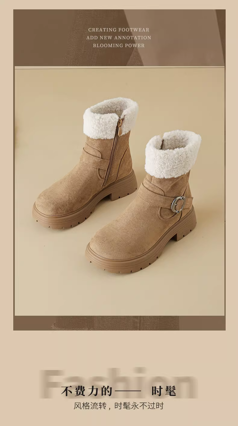 Giày bốt tuyết đế dày Dadong dành cho nữ 2025, mẫu mới mùa đông màu nâu, kiểu Birkenstock cổ ngắn, lót lông cừu, dày dặn và ấm áp, chất liệu cotton dành cho nữ.