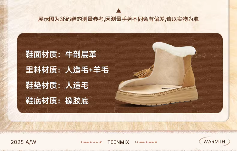 Giày bốt tuyết giữ ấm lót lông cừu đế dày tăng chiều cao kiểu cổ điển Tianmeiyi dành cho nữ, kiểu ngắn, mẫu mới mùa đông 2025 KXD39DD5