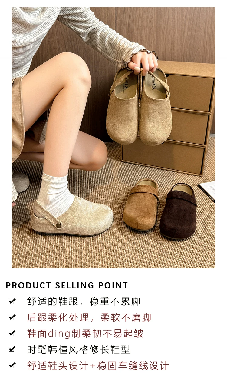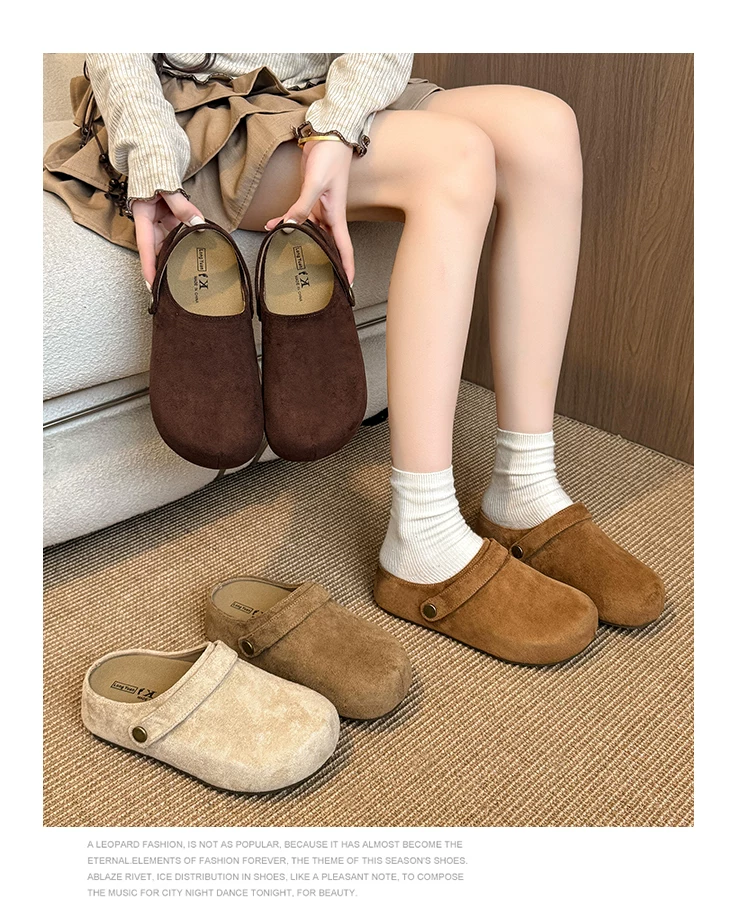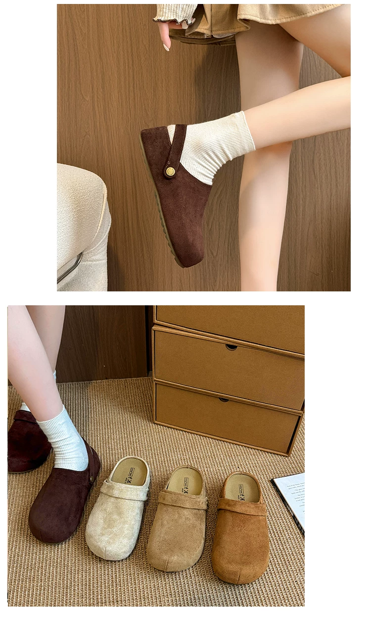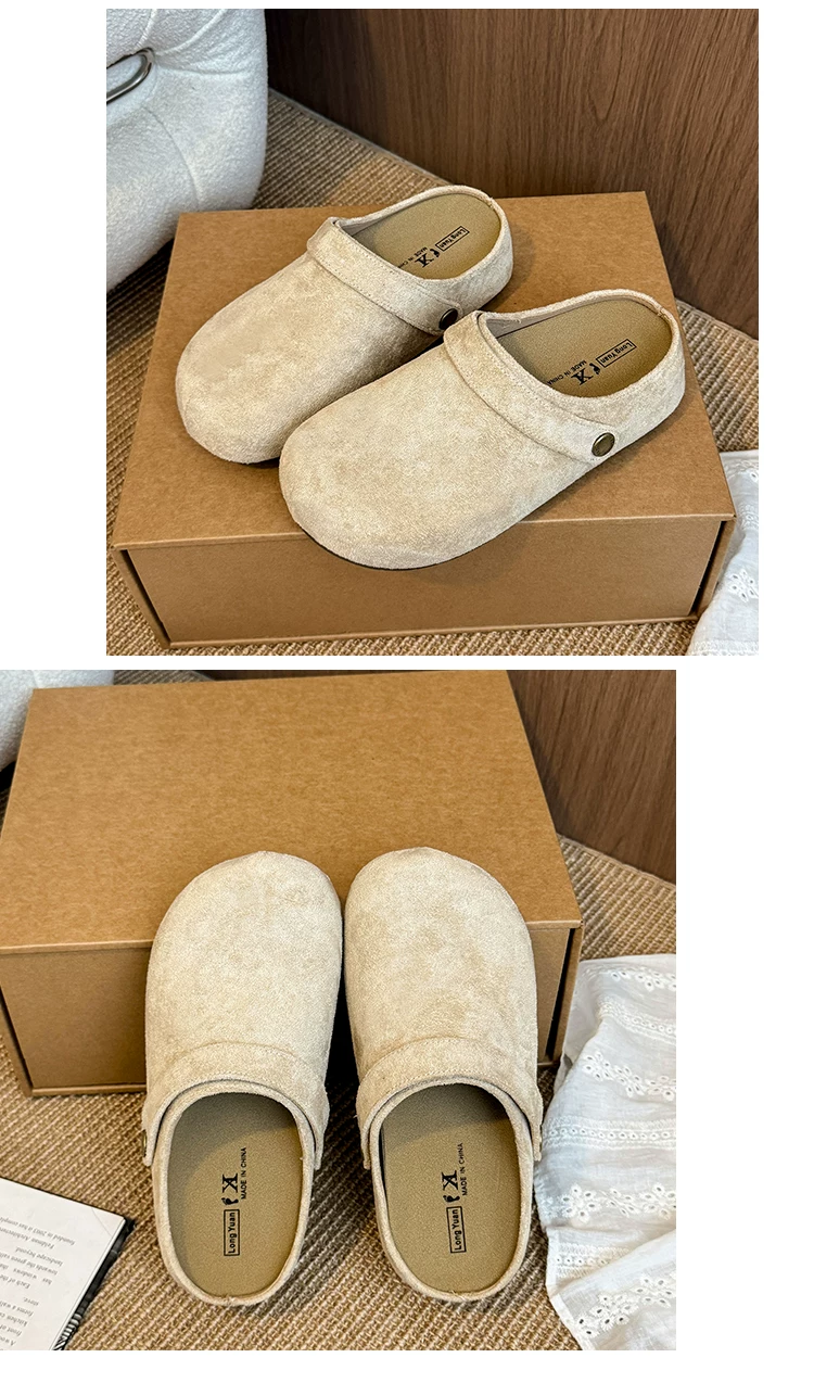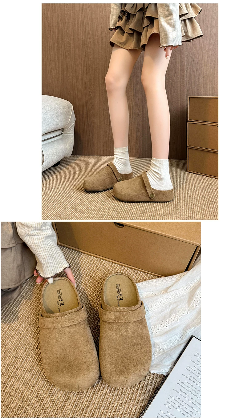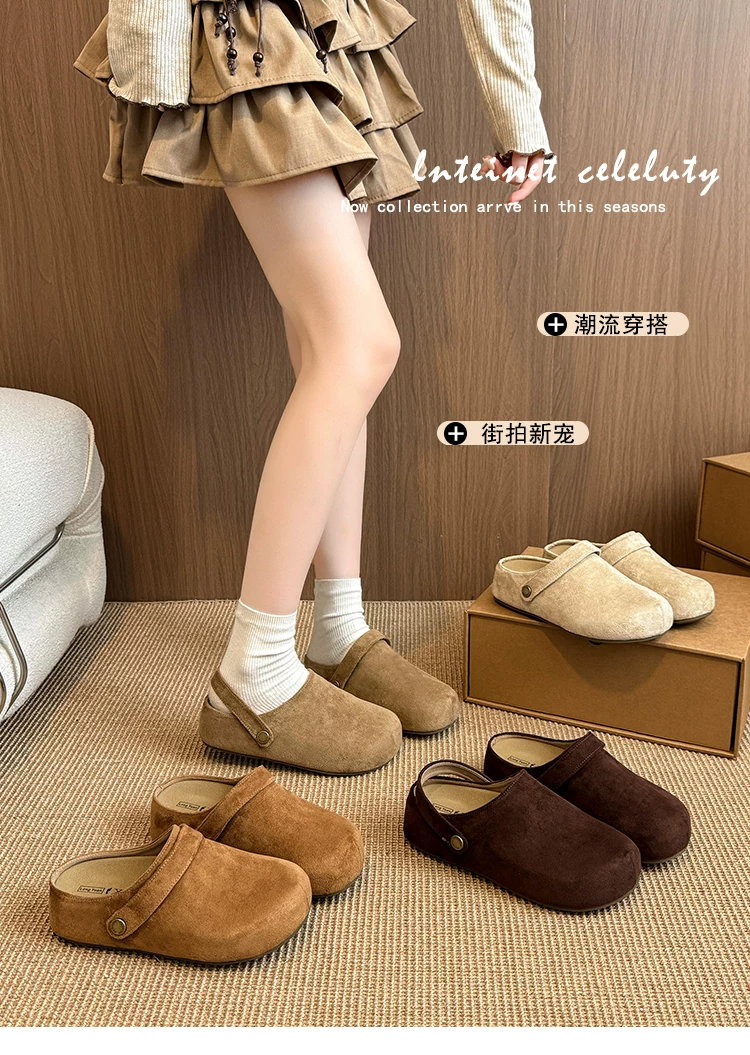 Giày dép nữ kiểu Pháp cổ điển, đế dày chống trơn, mũi kín, thích hợp đi ngoài trời, mẫu mới thu đông 2025, lót lông mềm, kiểu Birkenstock nửa dép.