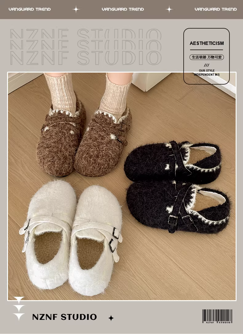 Giày lông dày đế dày phong cách retro lót lông cừu màu trắng dành cho nữ, thích hợp để mang ngoài trời, giày cotton đế mềm chống trượt mùa đông mới năm 2025 kiểu Birkenstock.