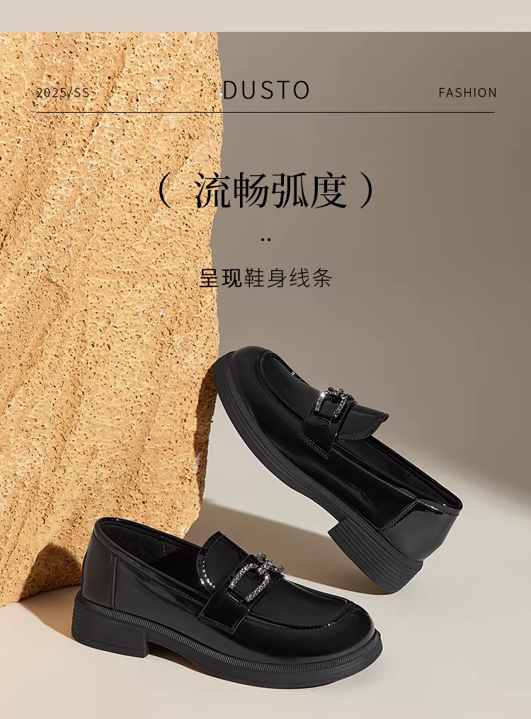 Giày lười đế dày Dadong dành cho nữ 2025, mẫu mới thu đông, chất liệu da bóng, kiểu dáng công sở, màu đen, gót dày, phong cách Anh, giày da nhỏ gọn.