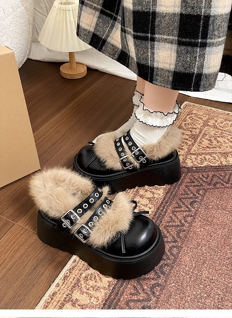 Giày Mary Jane Birkenstock đế dày lông xù màu trắng cổ điển dành cho nữ đi ngoài trời, mùa đông 2025 mới, ấm áp và chống trơn trượt