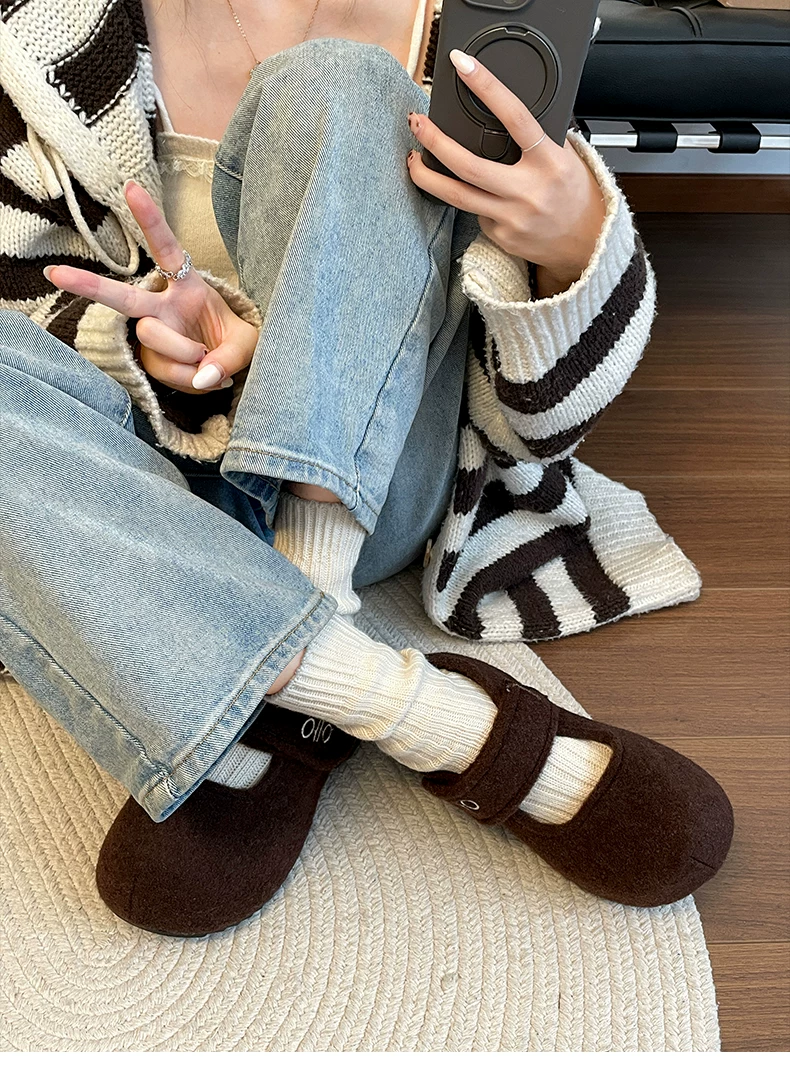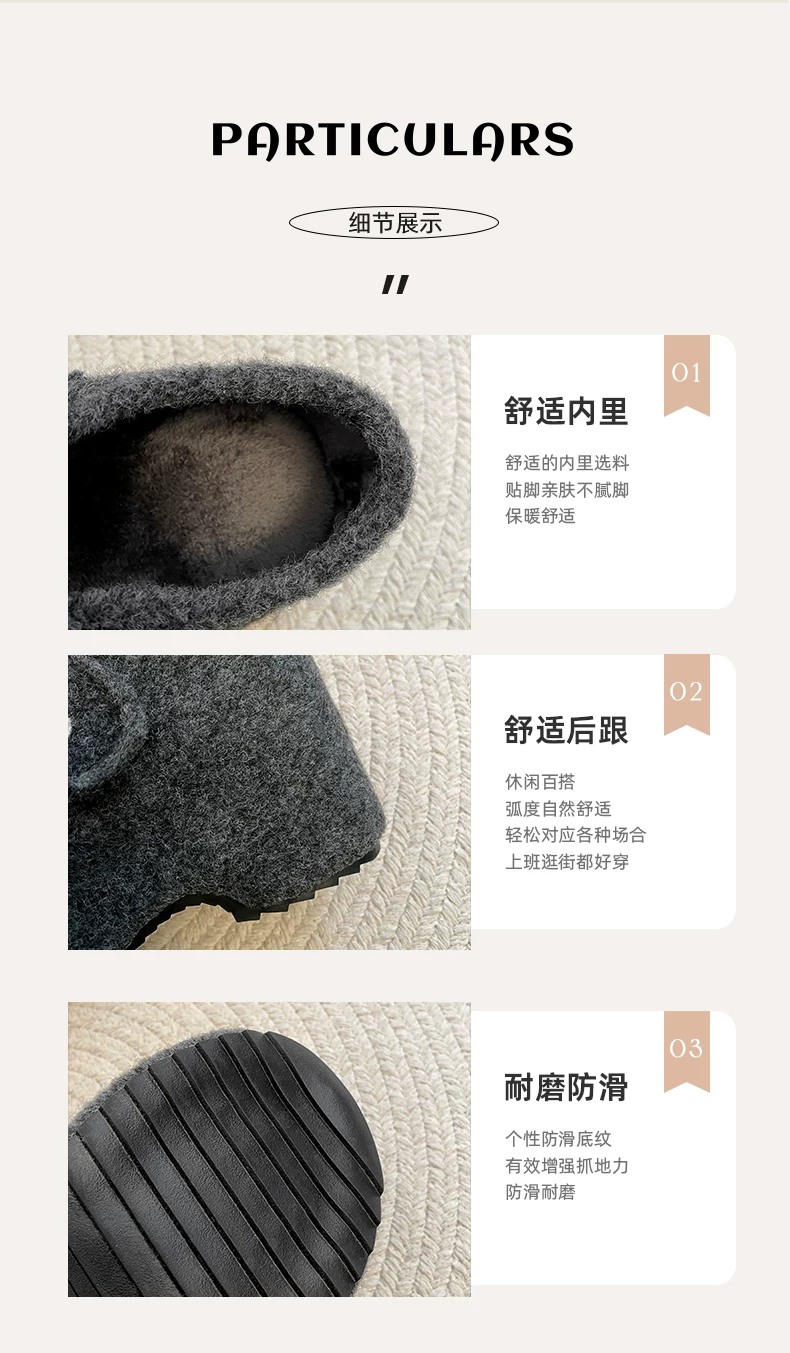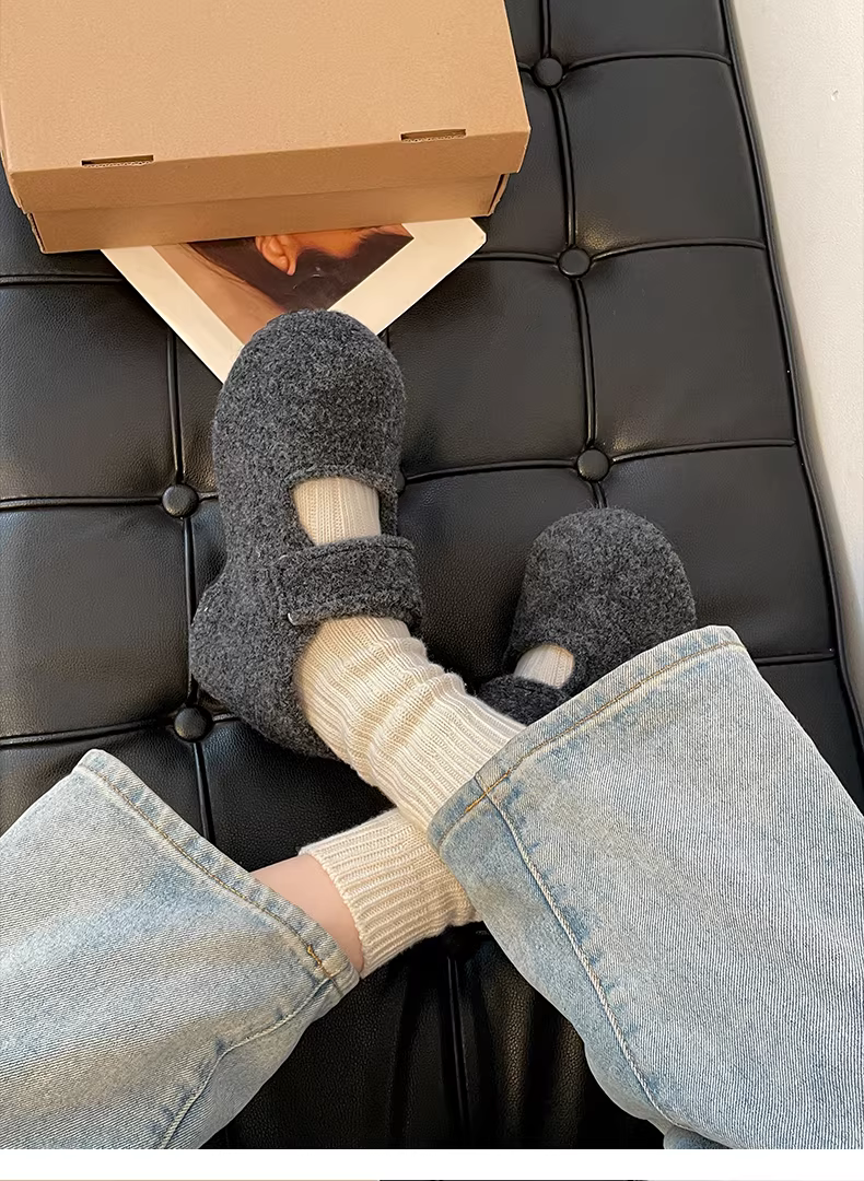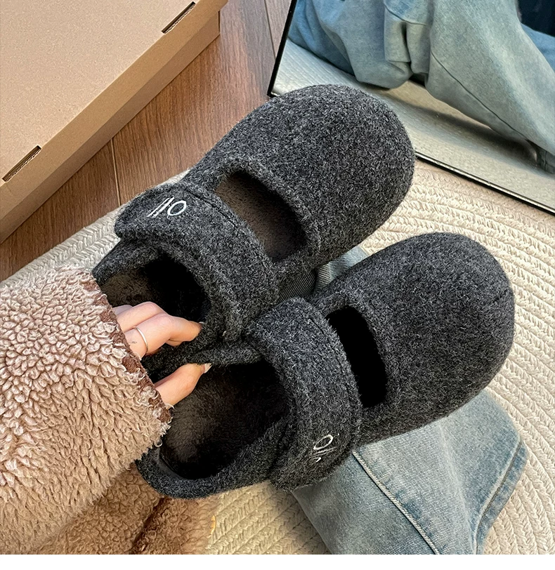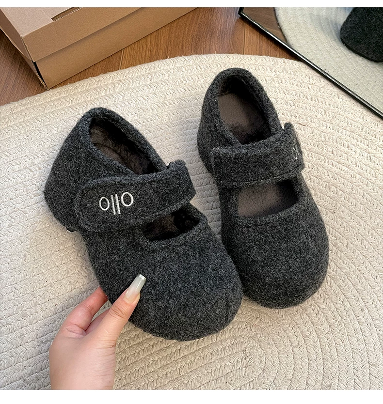 Giày Mary Jane đế dày tăng chiều cao kiểu cổ điển lót lông cừu dành cho nữ, áo khoác ngoài mùa đông, kiểu mới 2025, giày cotton ấm màu xám.