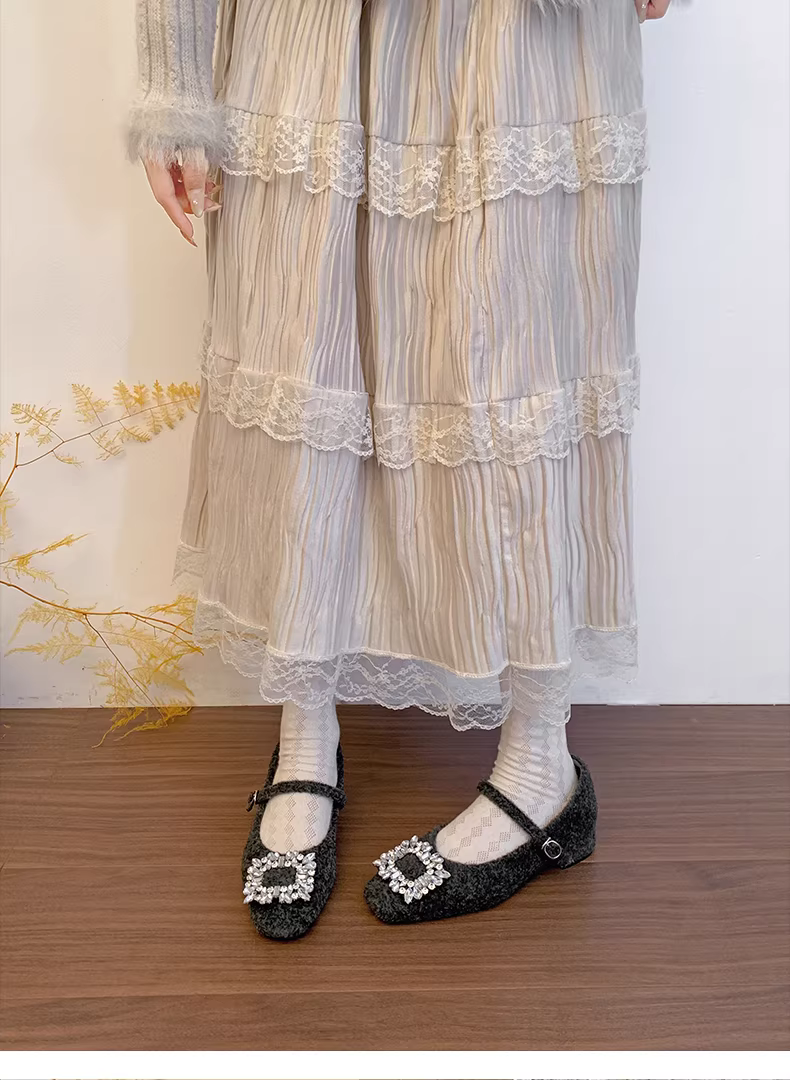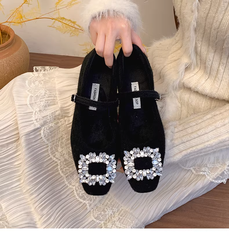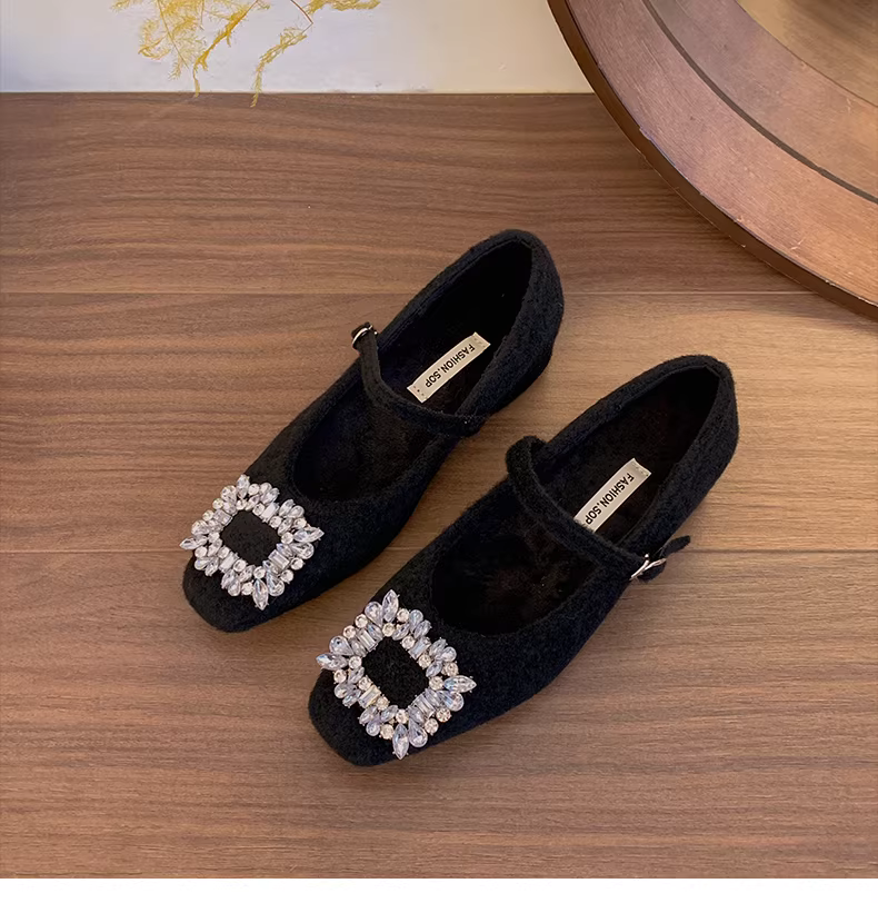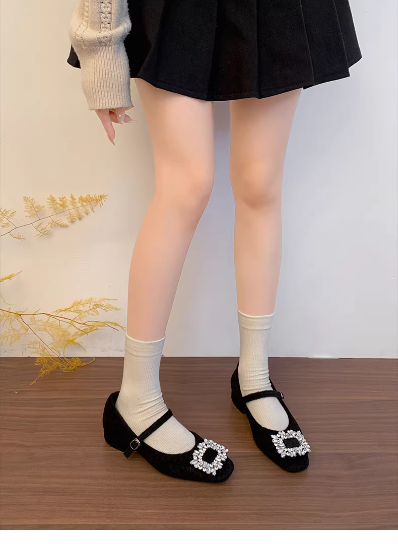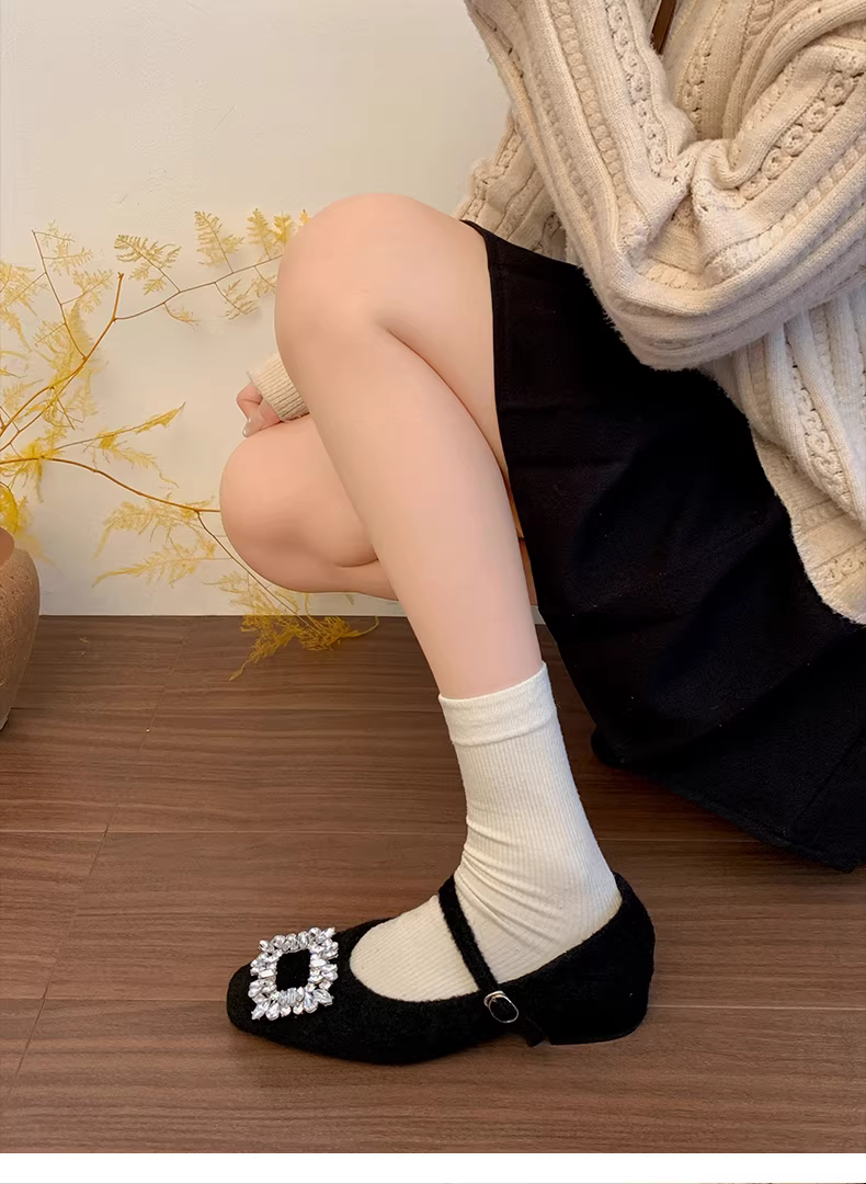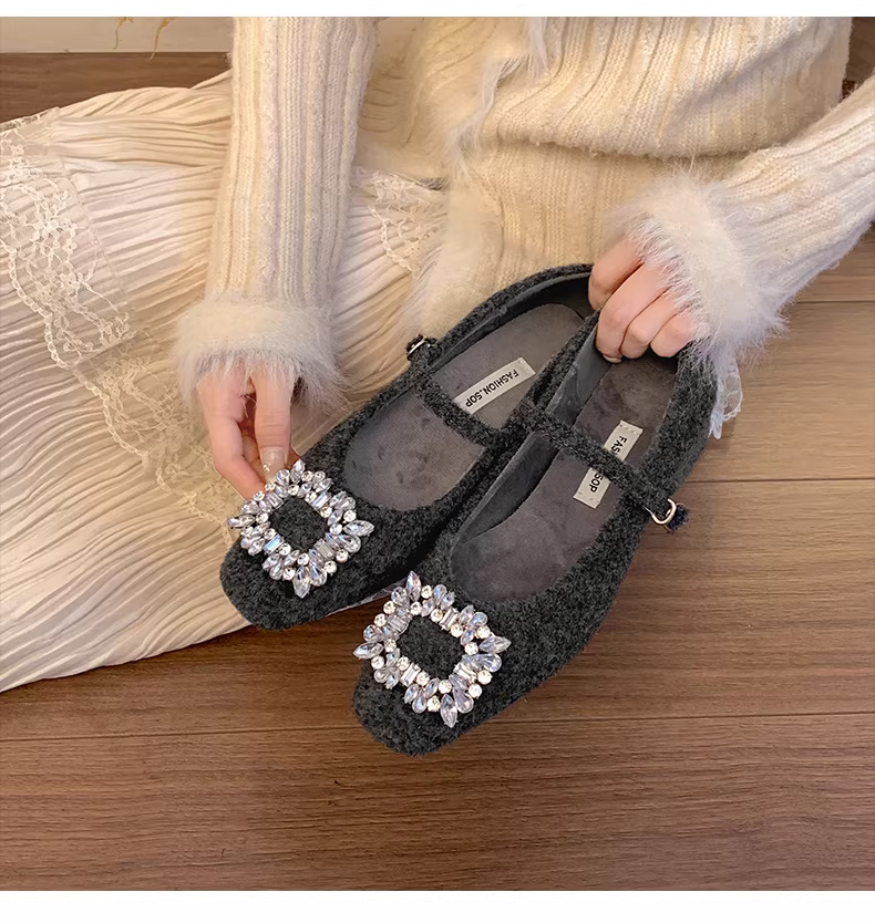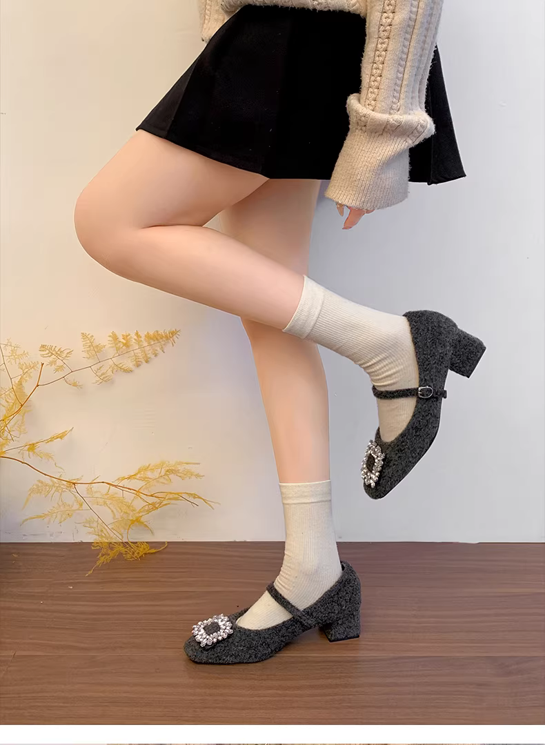 - Giày Mary Jane mũi vuông ấm áp mùa thu/đông 2025 kiểu Pháp cổ điển màu xám retro, gót dày, lông xù dành cho nữ.