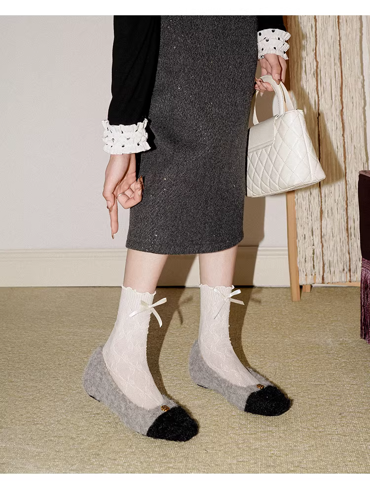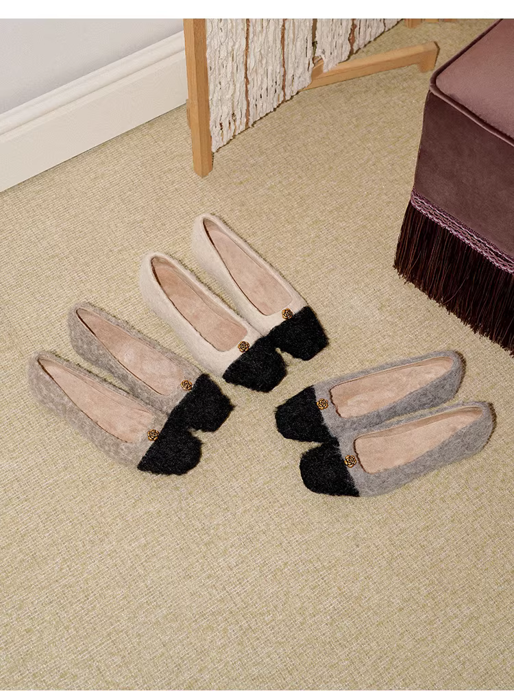 Giày nữ đế bằng kiểu Chanel, phối màu, chất liệu len, kiểu dáng Pháp, tăng chiều cao ẩn, mềm mại và điệu đà.
