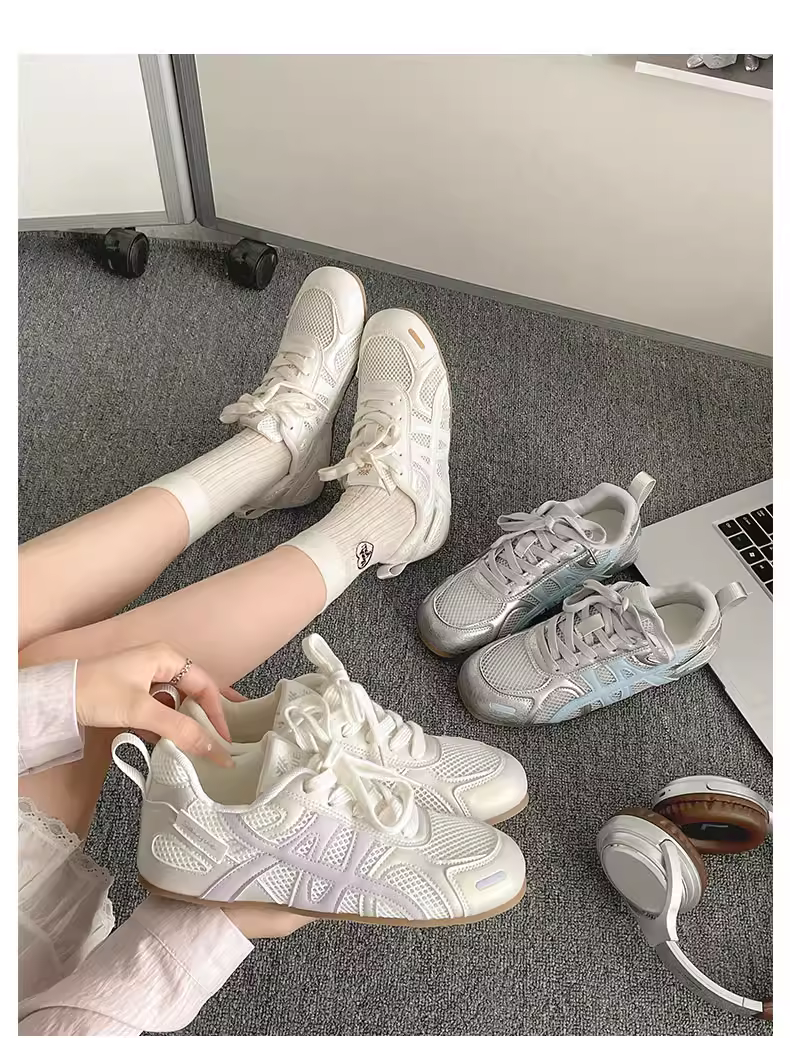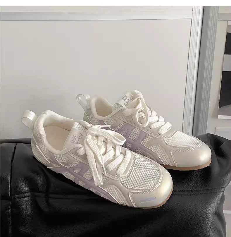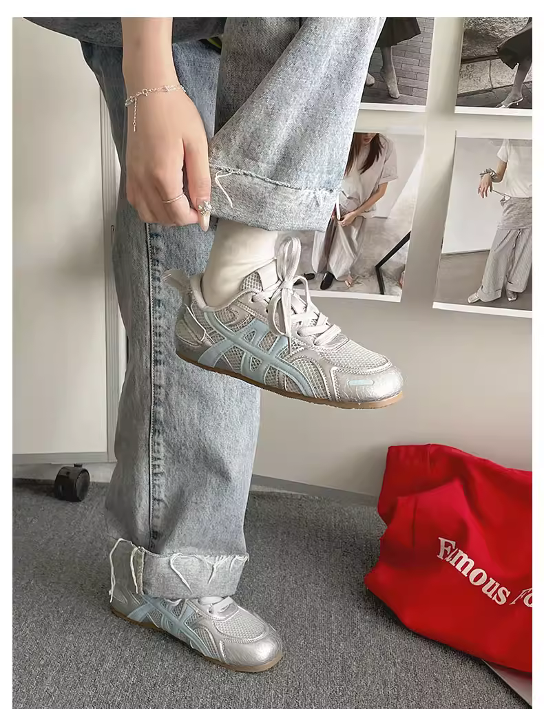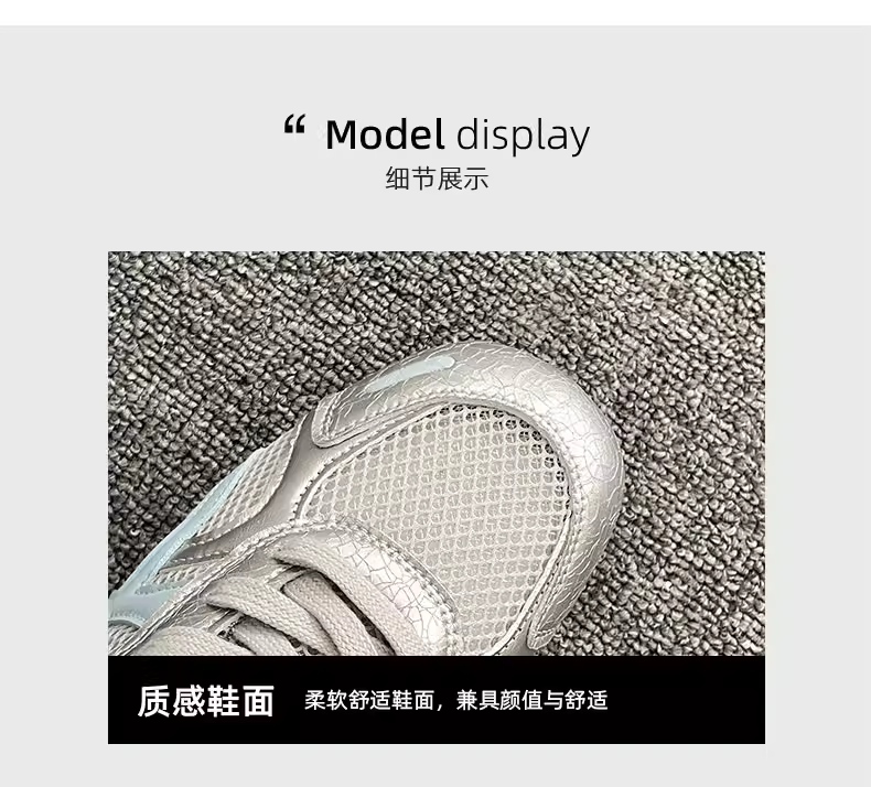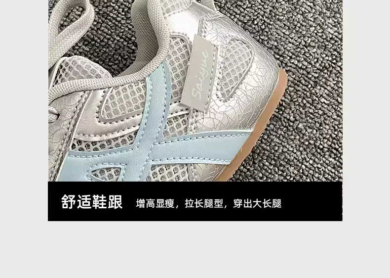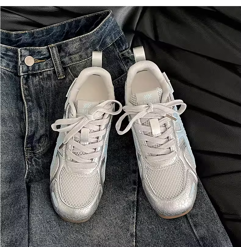 - Giày thể thao đế bằng tăng chiều cao kiểu cổ điển màu bạc dành cho nữ, kiểu mới mùa thu 2025, thích hợp phối cùng váy, giày thể thao đế mềm phong cách thường ngày.