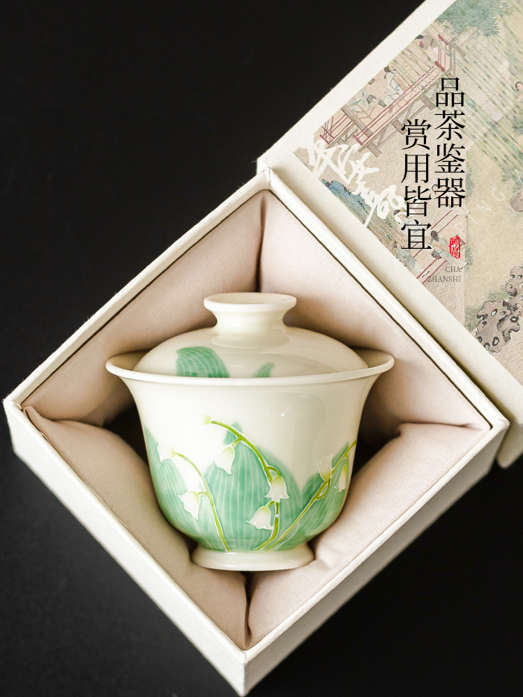 Hàng đống vẽ tay chạm khắc hoa lan thung lũng bát nắp nhị tài cốc trà bát trà gốm sứ gia dụng bát trà Kung Fu cỡ lớn có nắp chống bỏng