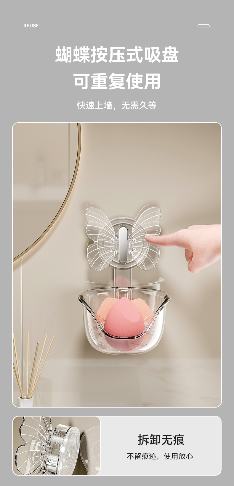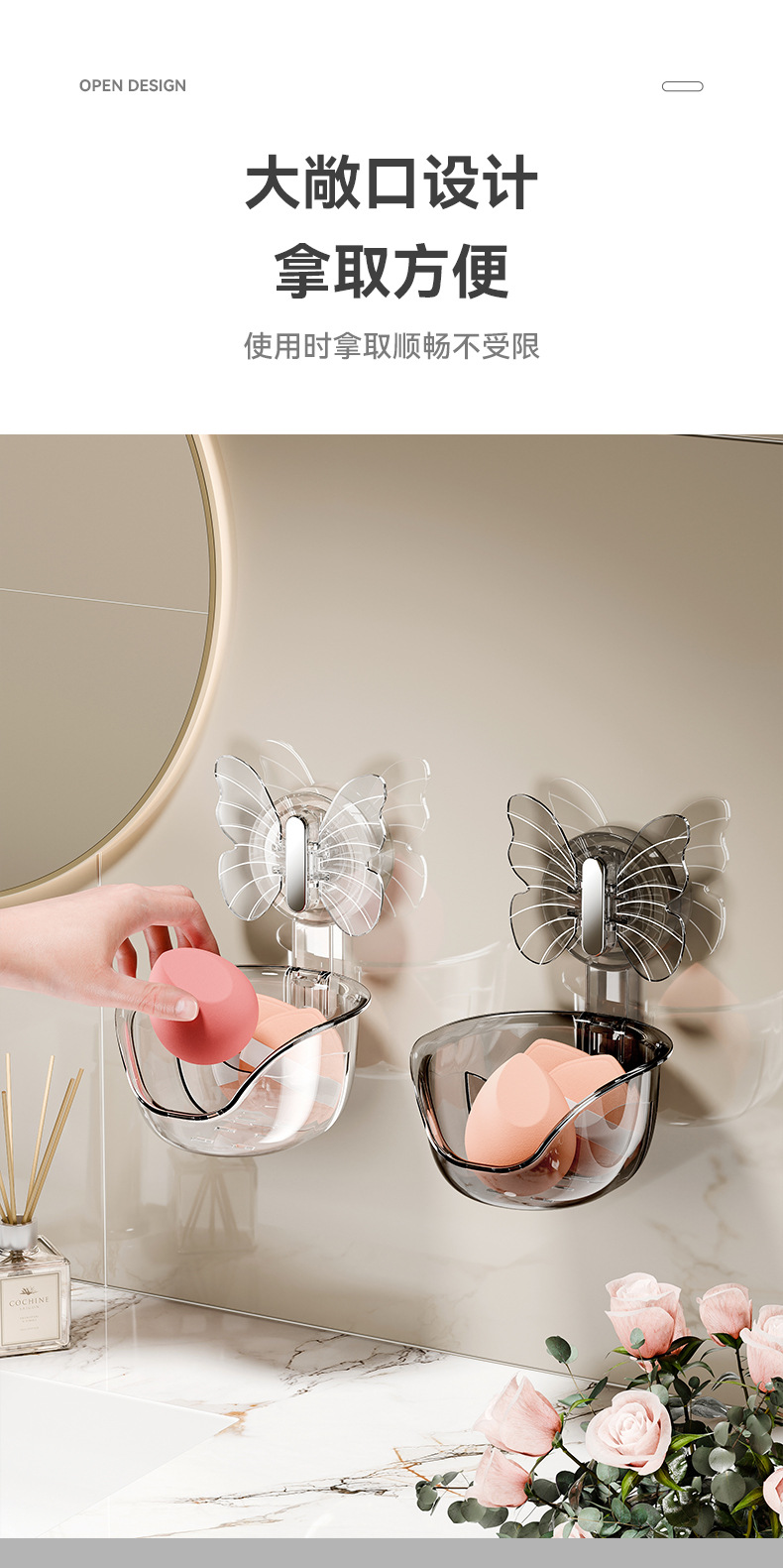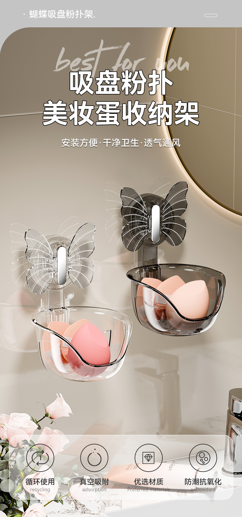 - Hộp đựng bông phấn mút bướm không cần đục lỗ, đệm hơi làm đẹp, hộp thoát nước, Giá để đồ treo tường
