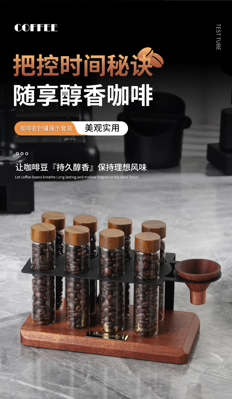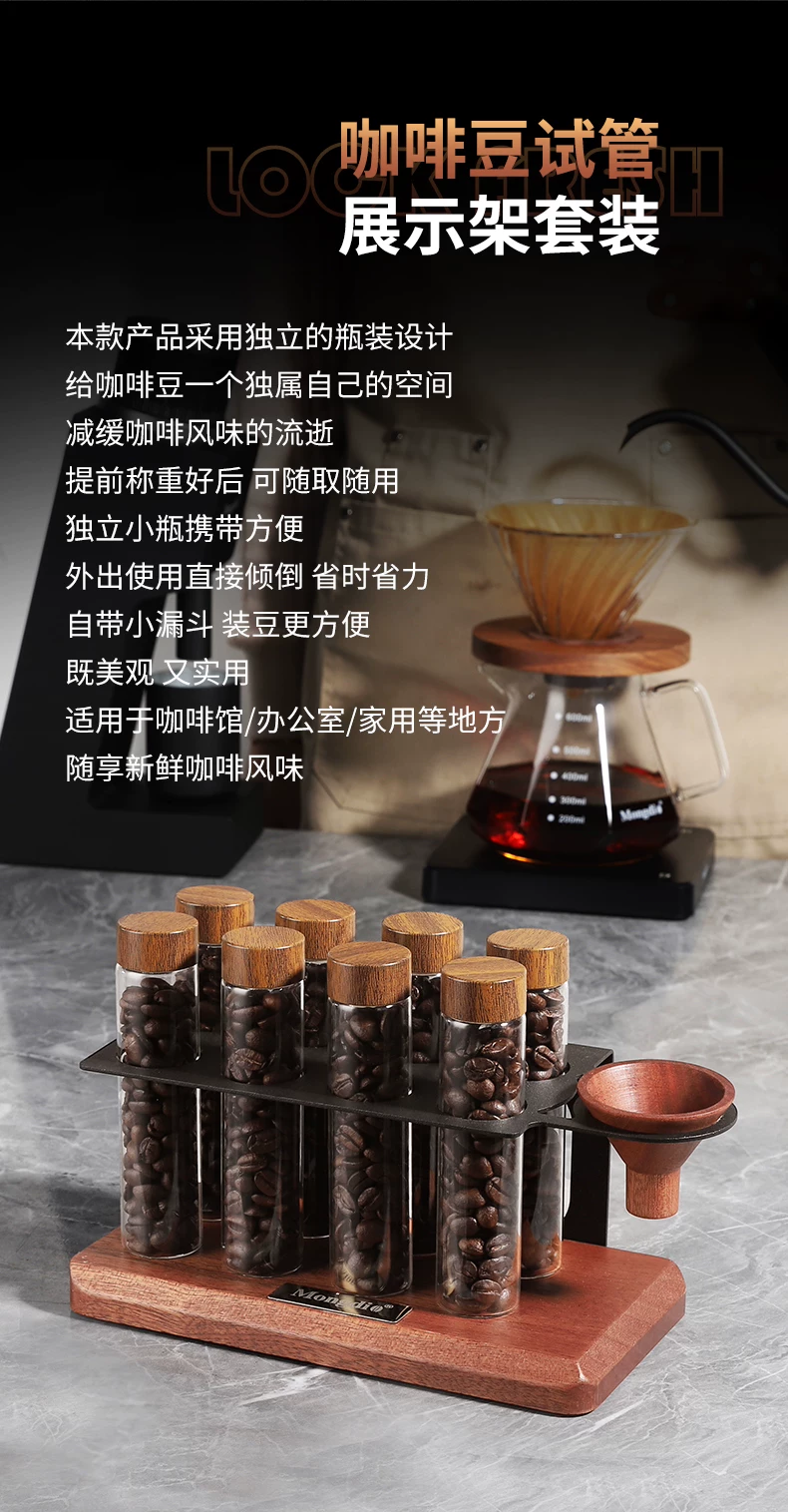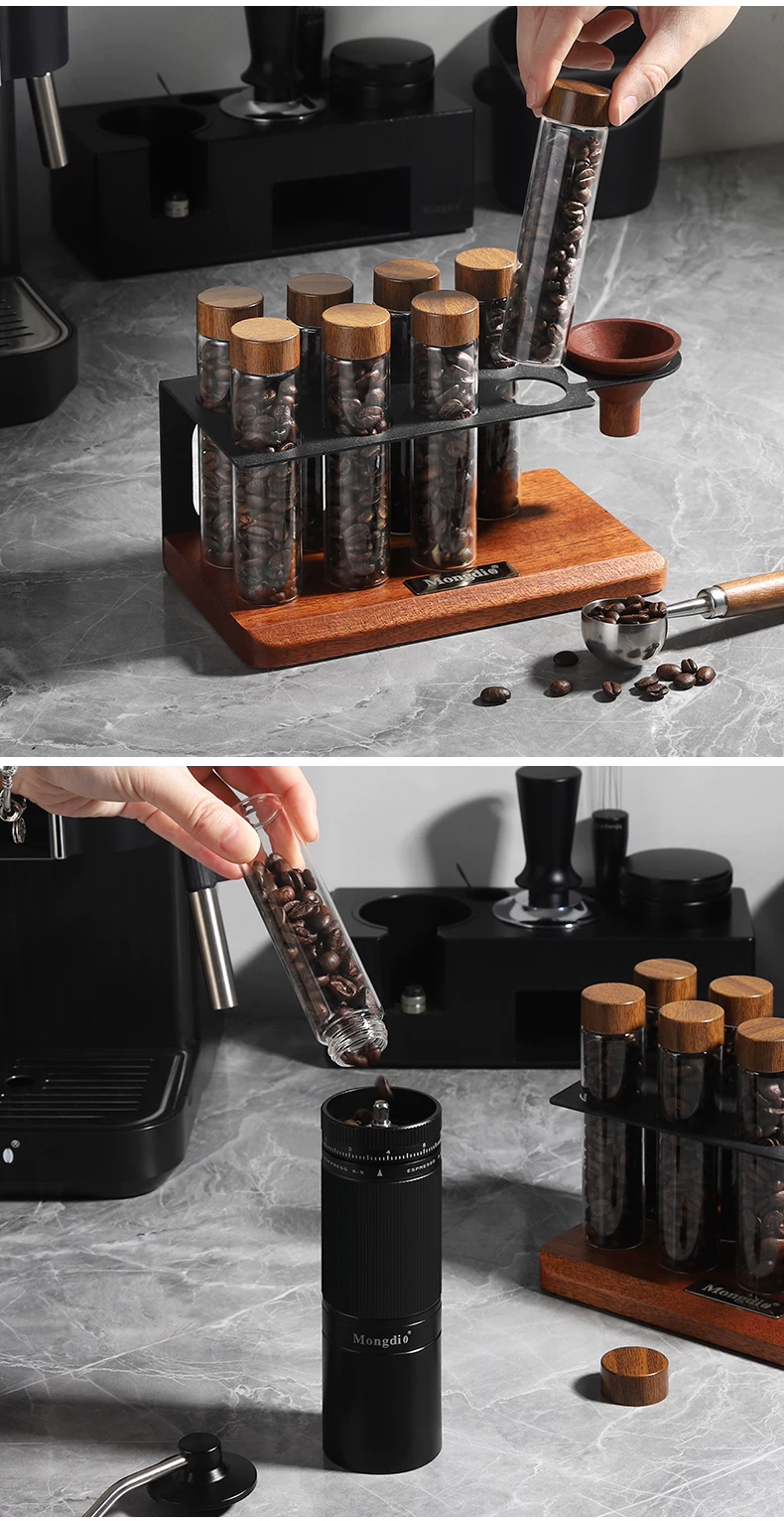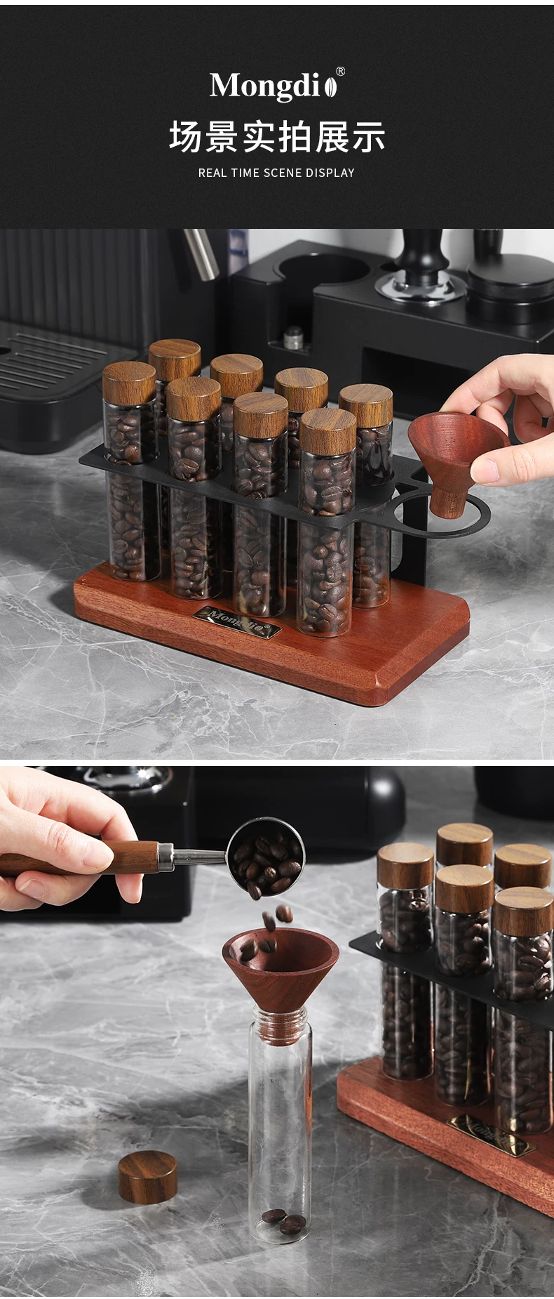 Hũ đựng cà phê hạt Mongdio, lọ đựng cà phê hạt có nắp đậy, ống nghiệm đựng cà phê, giá trưng bày bằng kính, lọ đựng cà phê